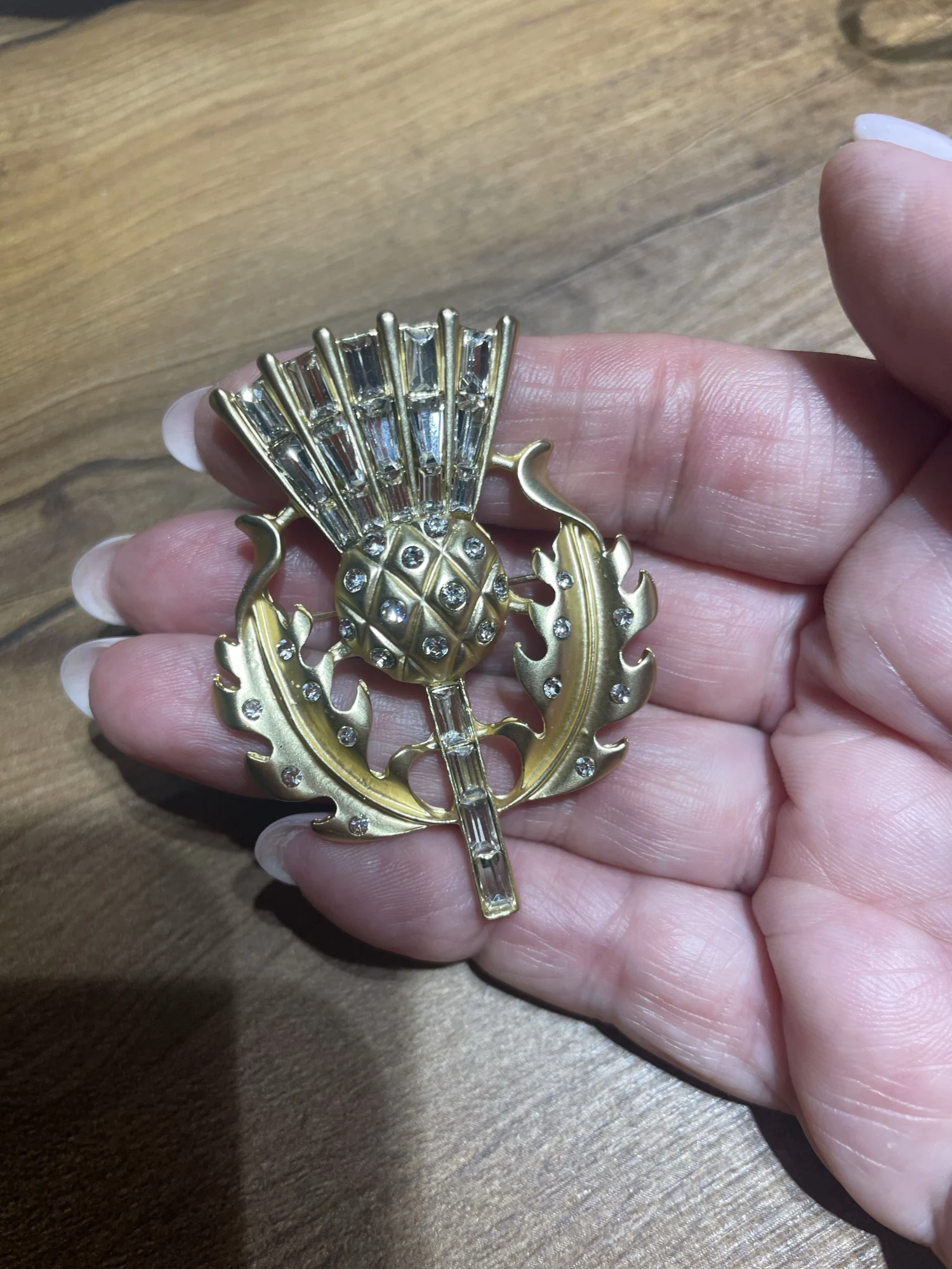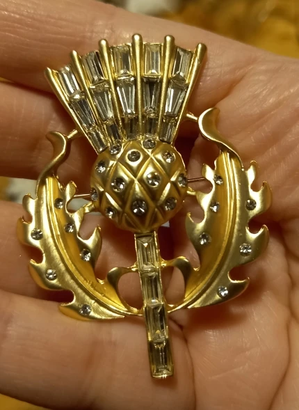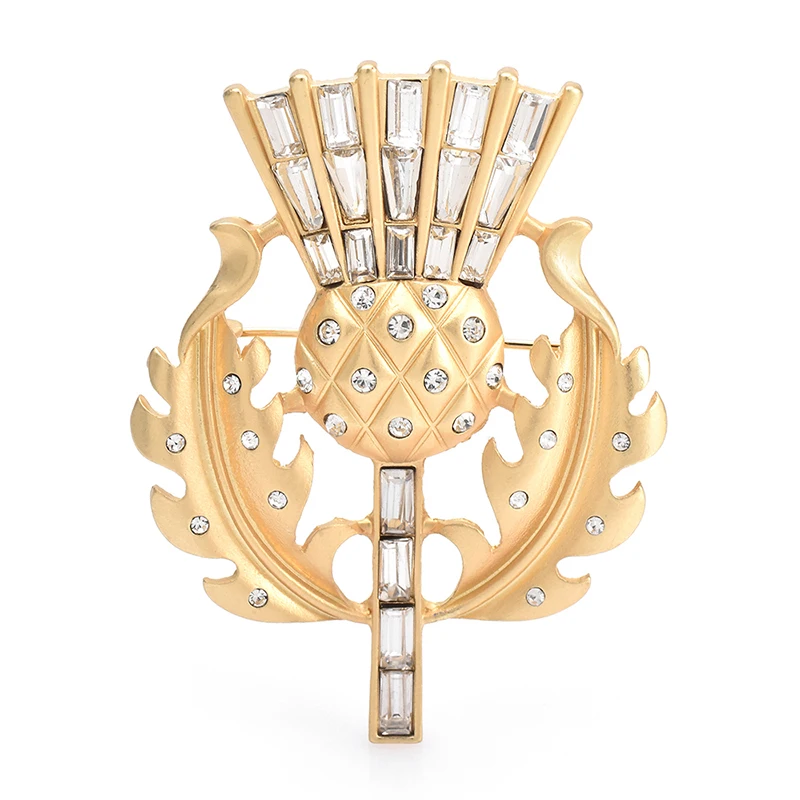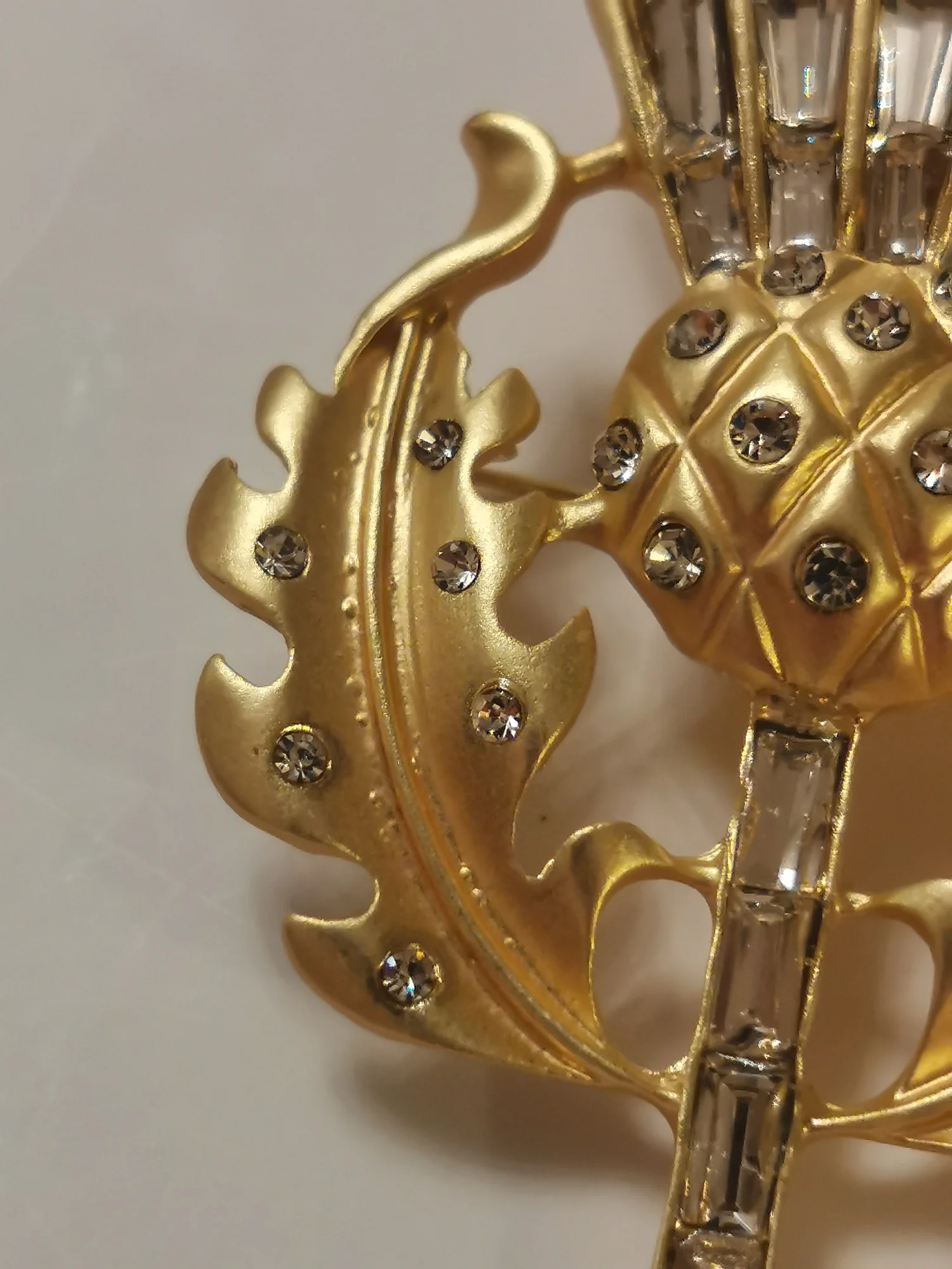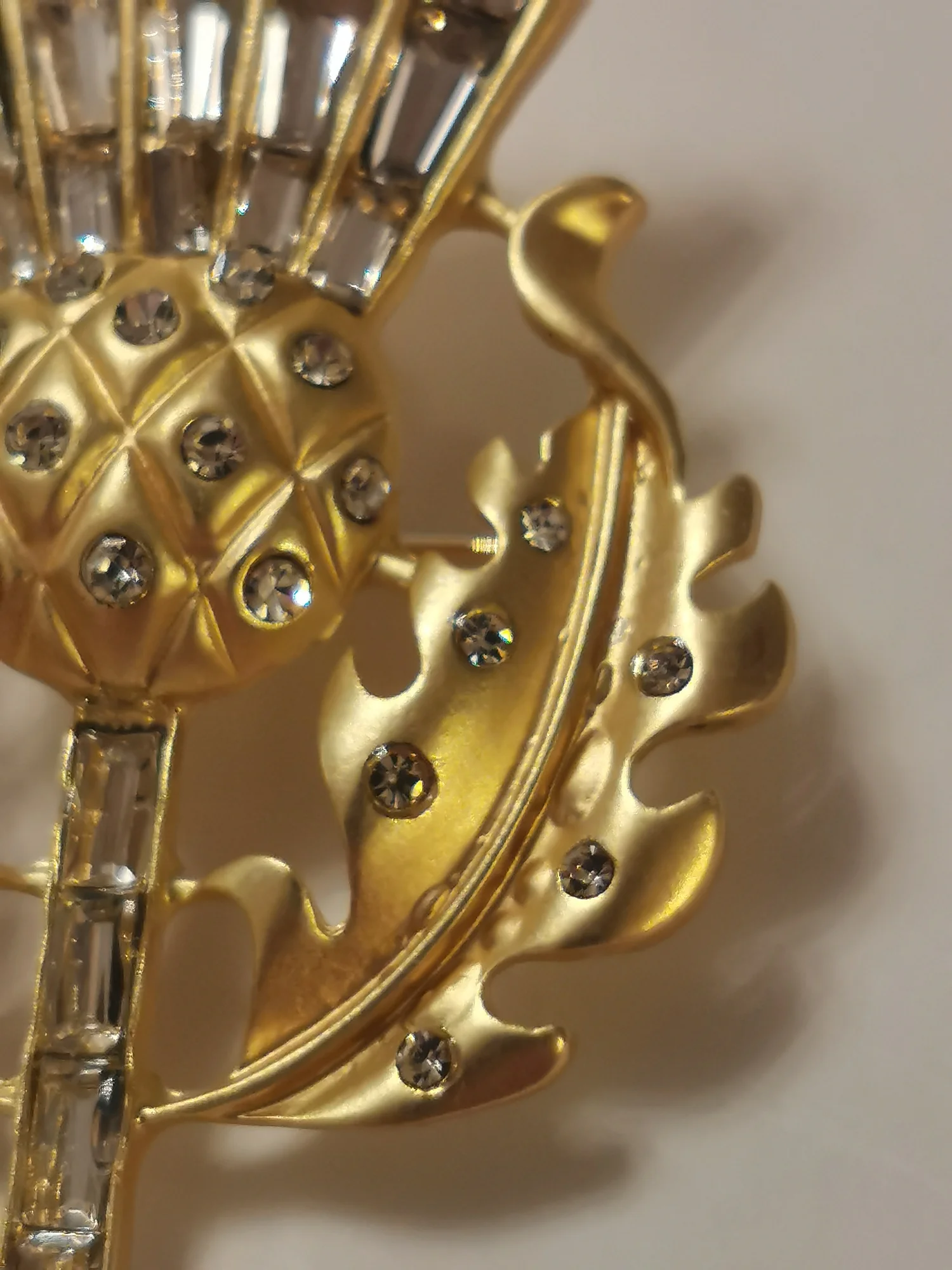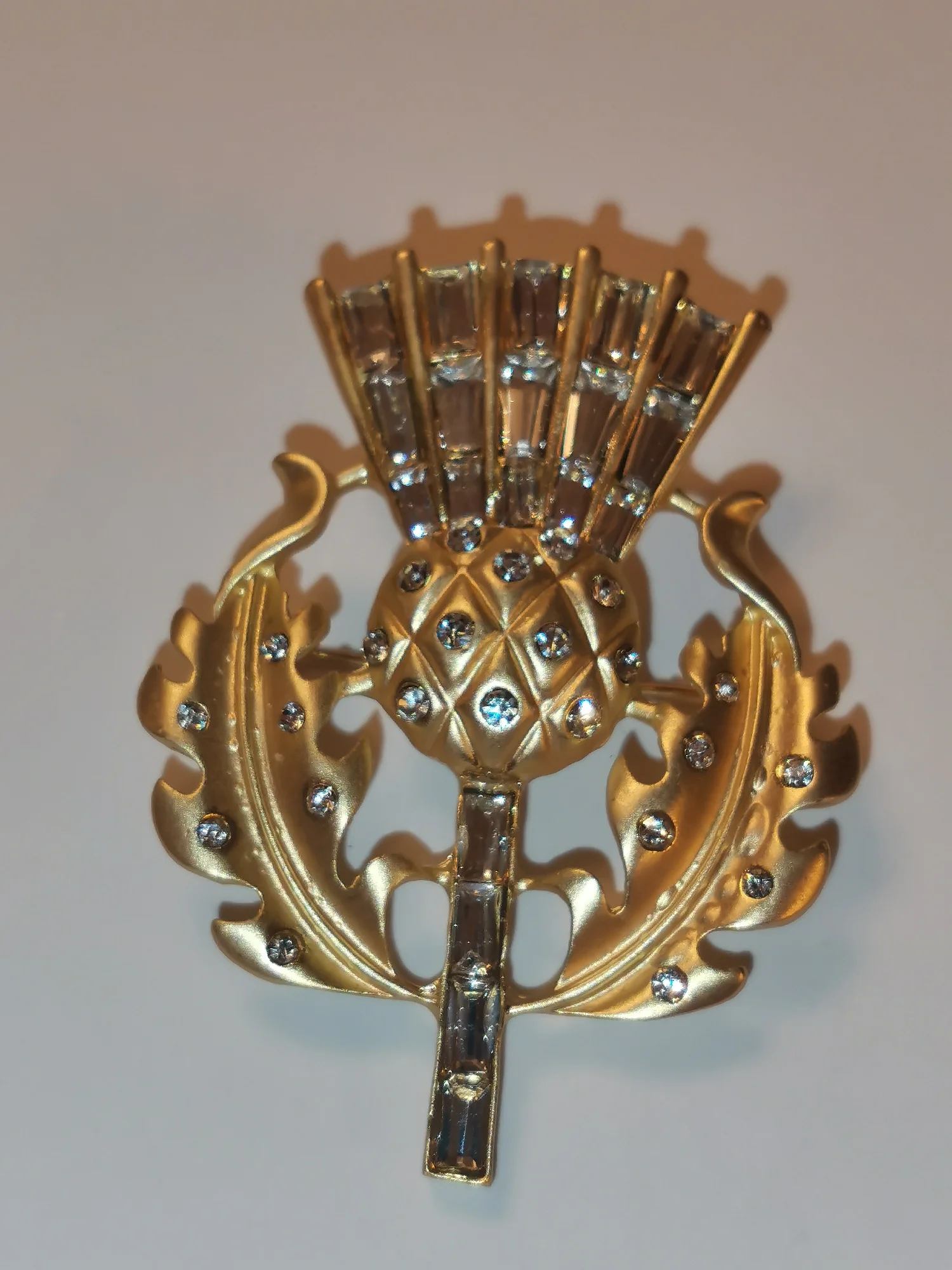 Gorgeous vintage style thistle flower brooch. it's made from lovely matte finish gold coloured metal and very sparkly and stunning. Thanks for a great quality item and a great service.