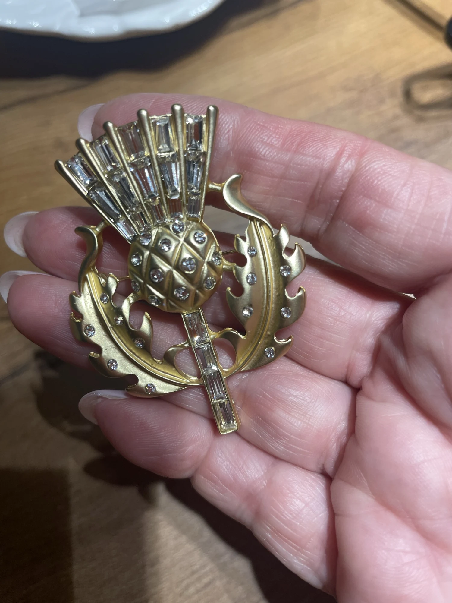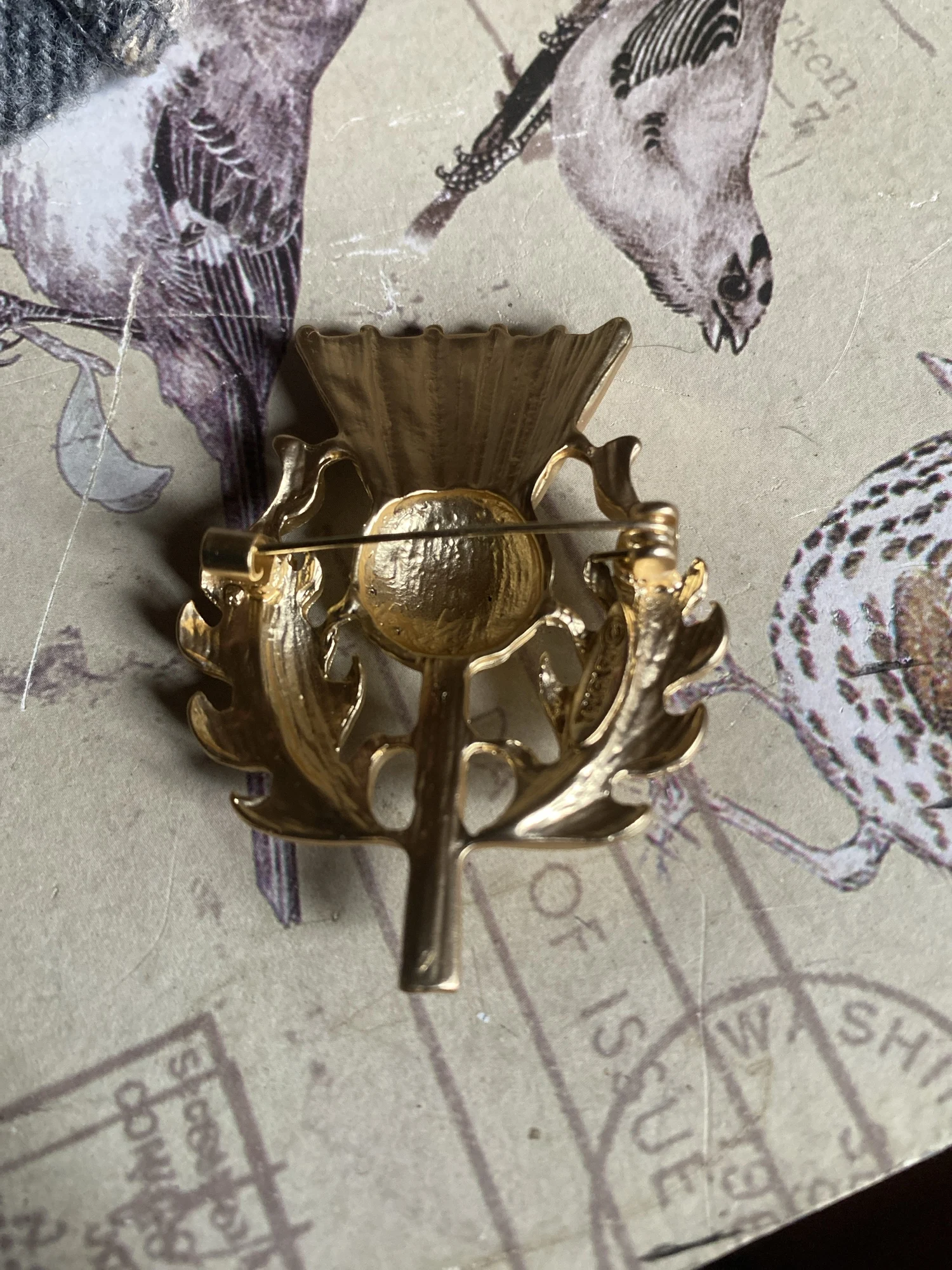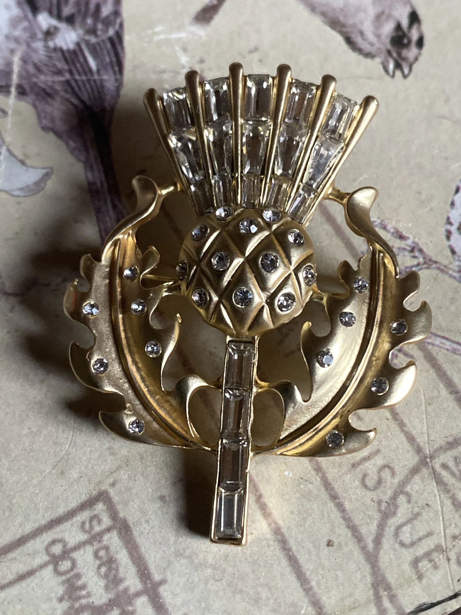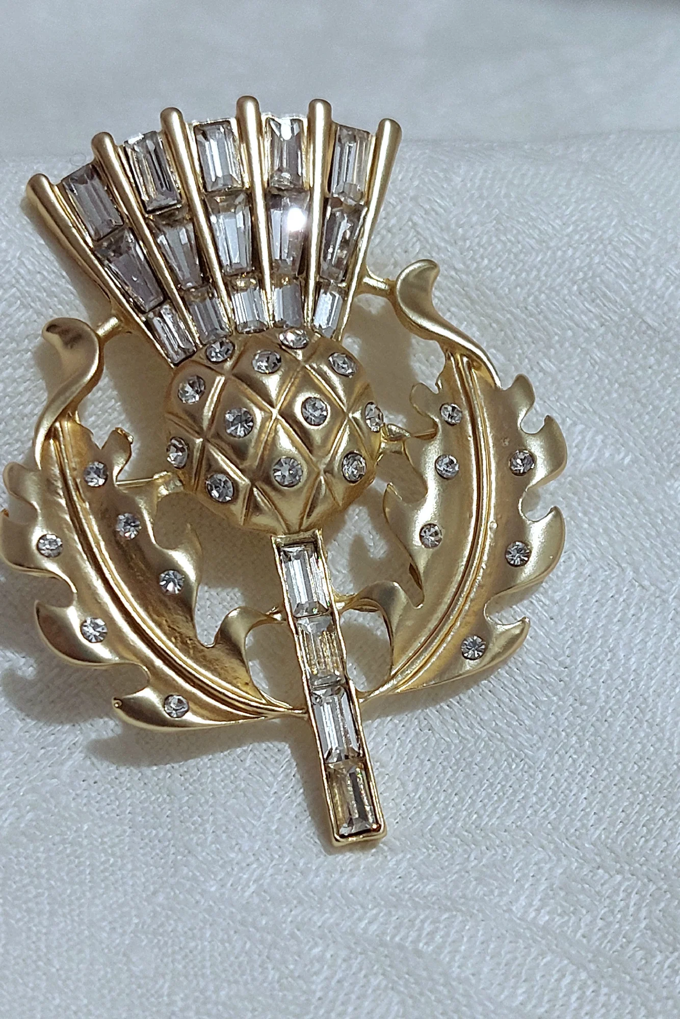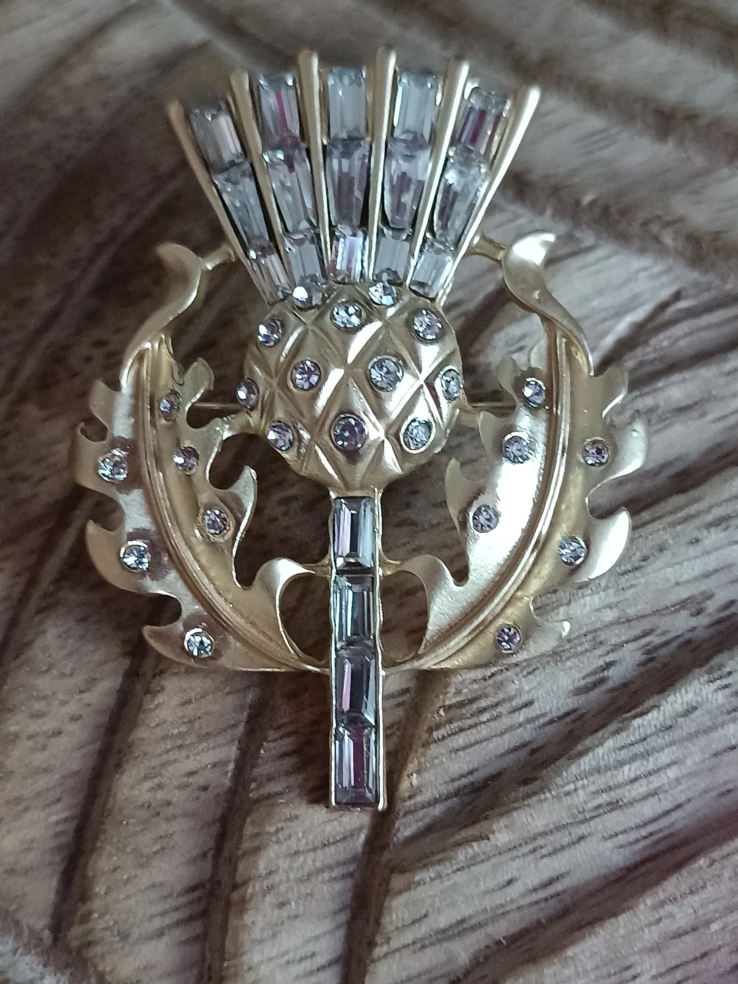 Gorgeous vintage style thistle flower brooch. it's made from lovely matte finish gold coloured metal and very sparkly and stunning. Thanks for a great quality item and a great service.