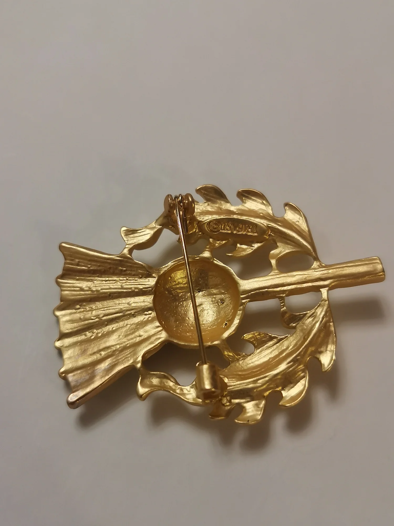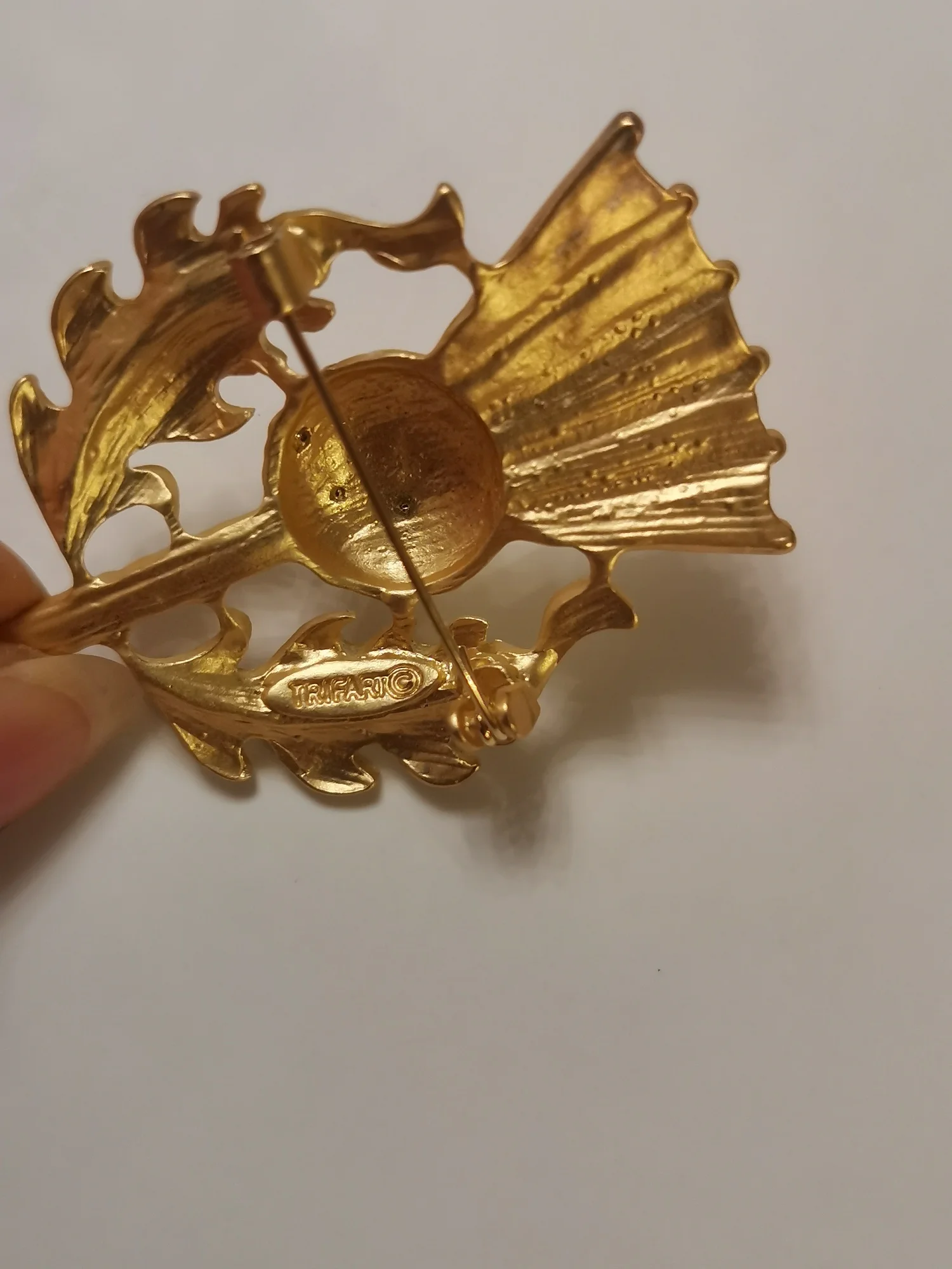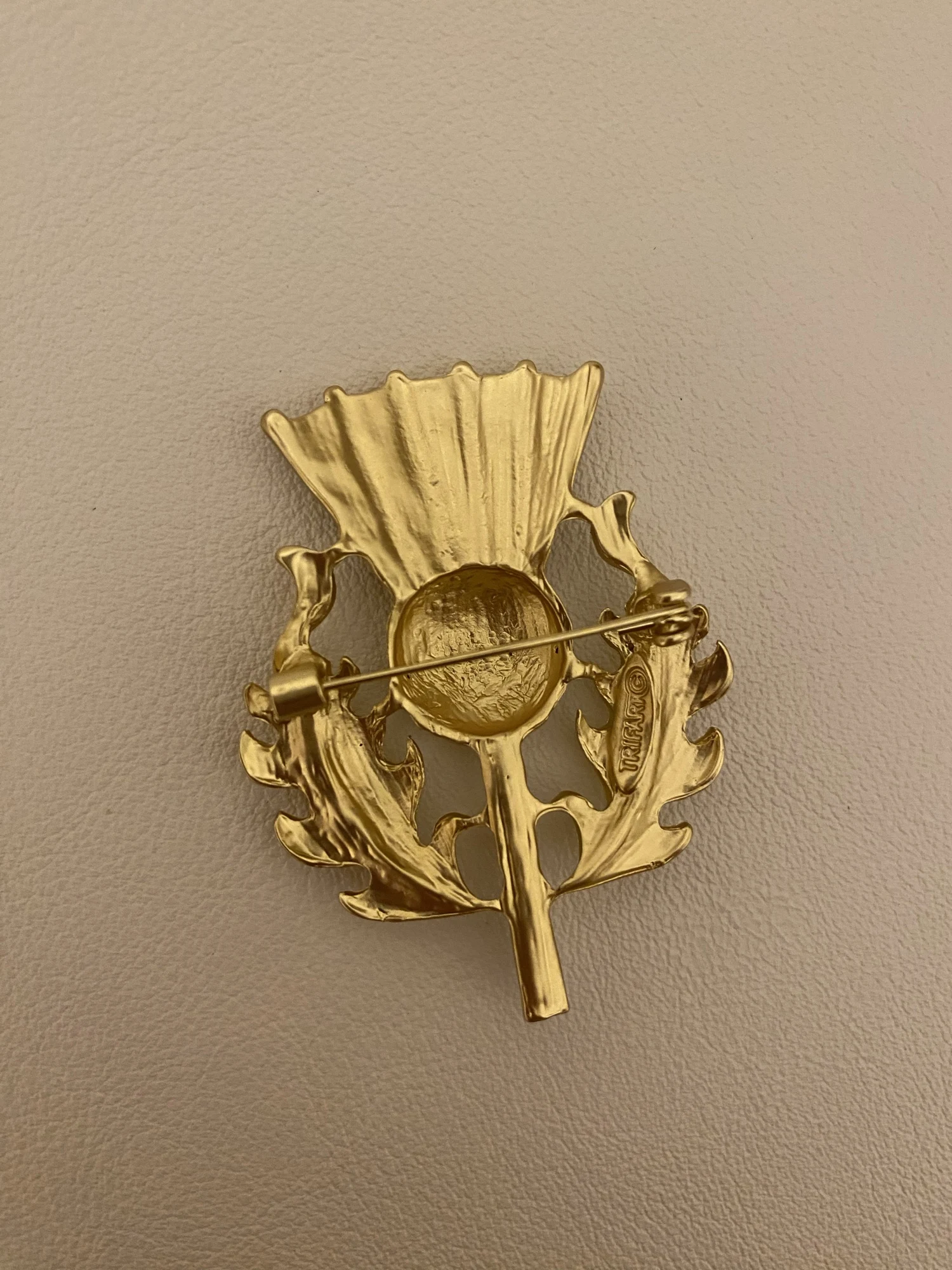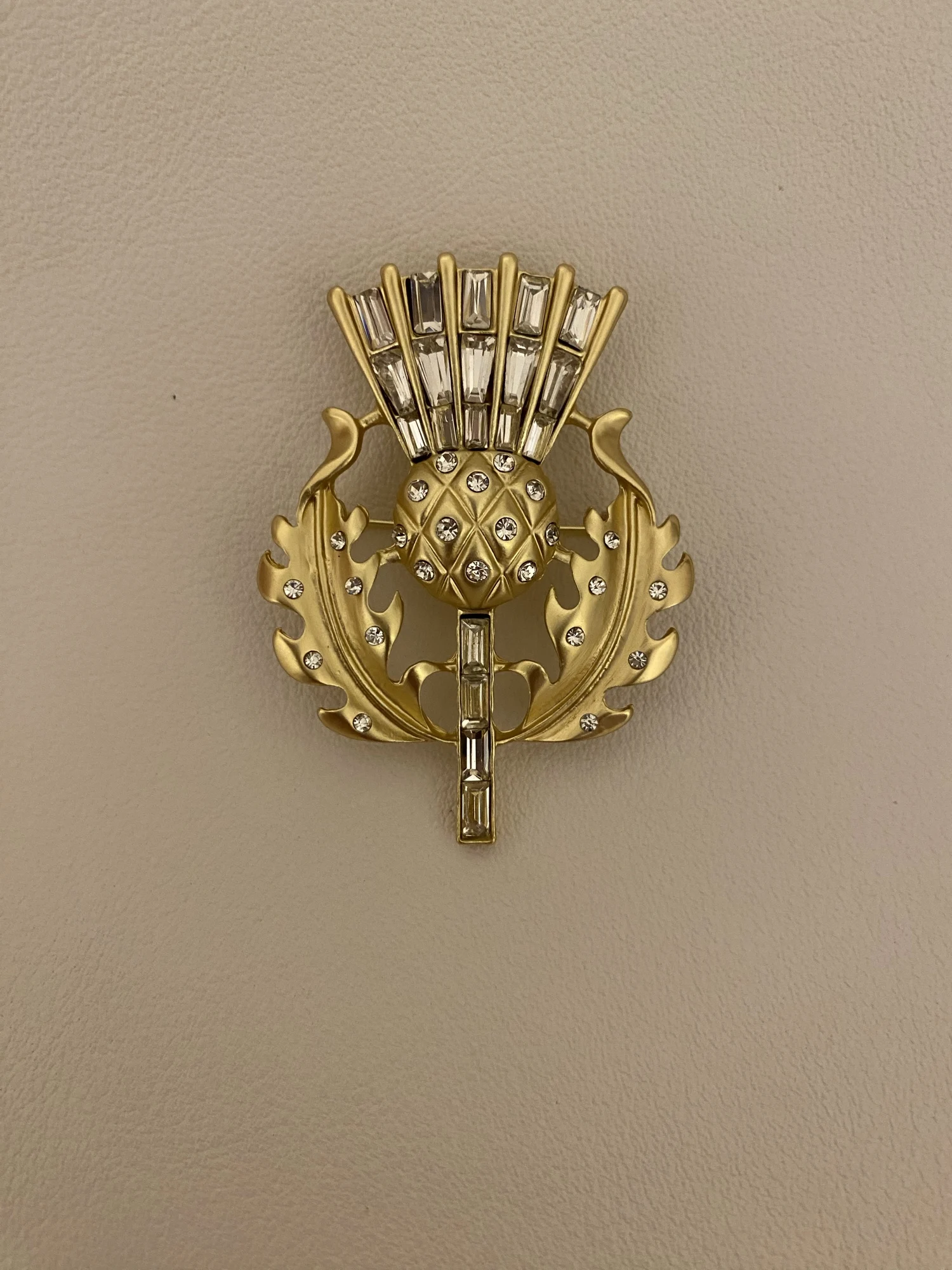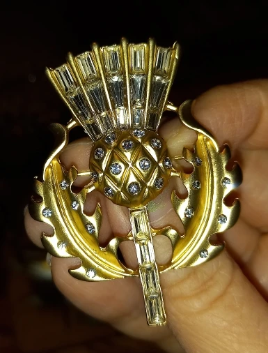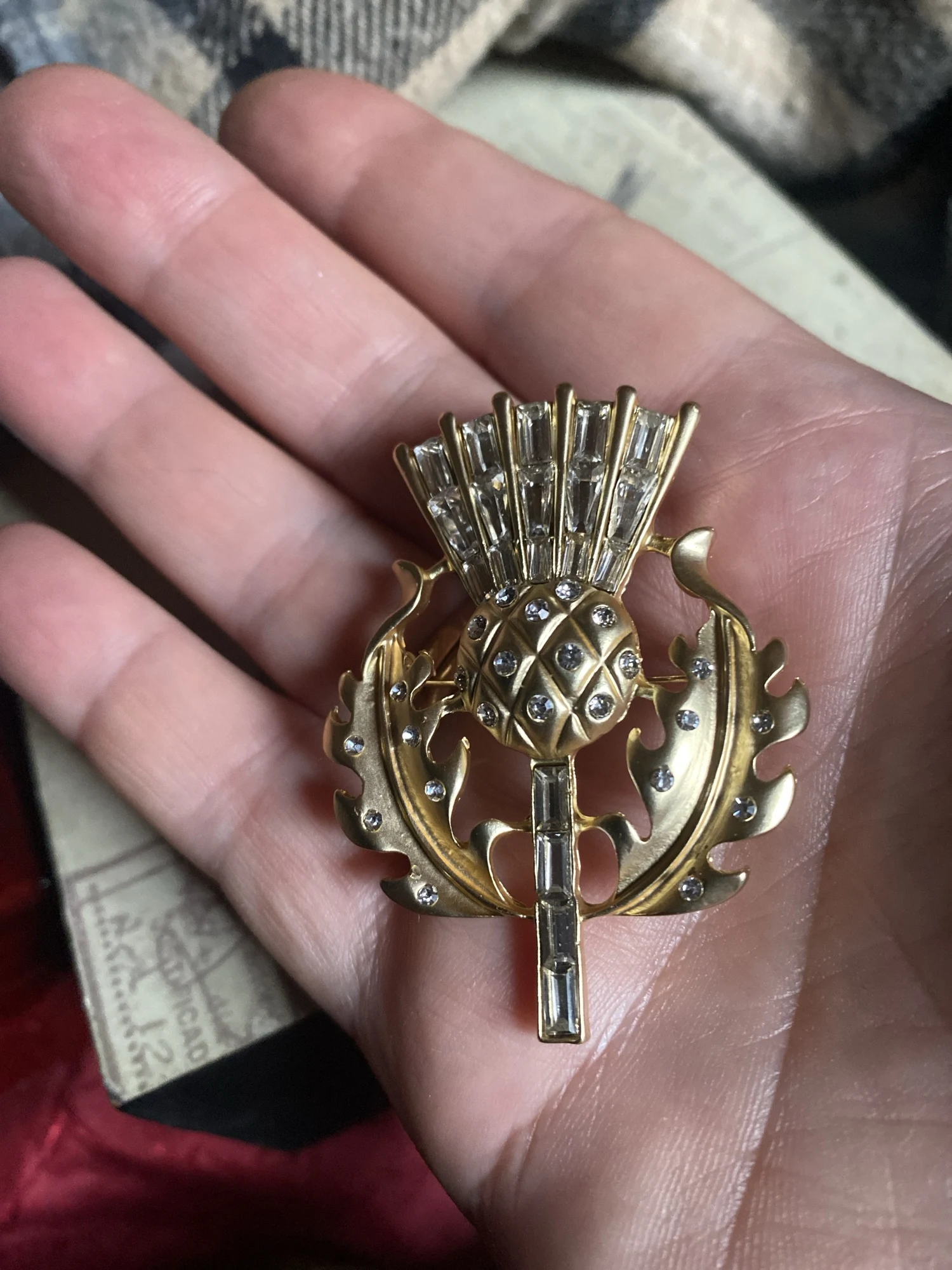 Gorgeous vintage style thistle flower brooch. it's made from lovely matte finish gold coloured metal and very sparkly and stunning. Thanks for a great quality item and a great service.