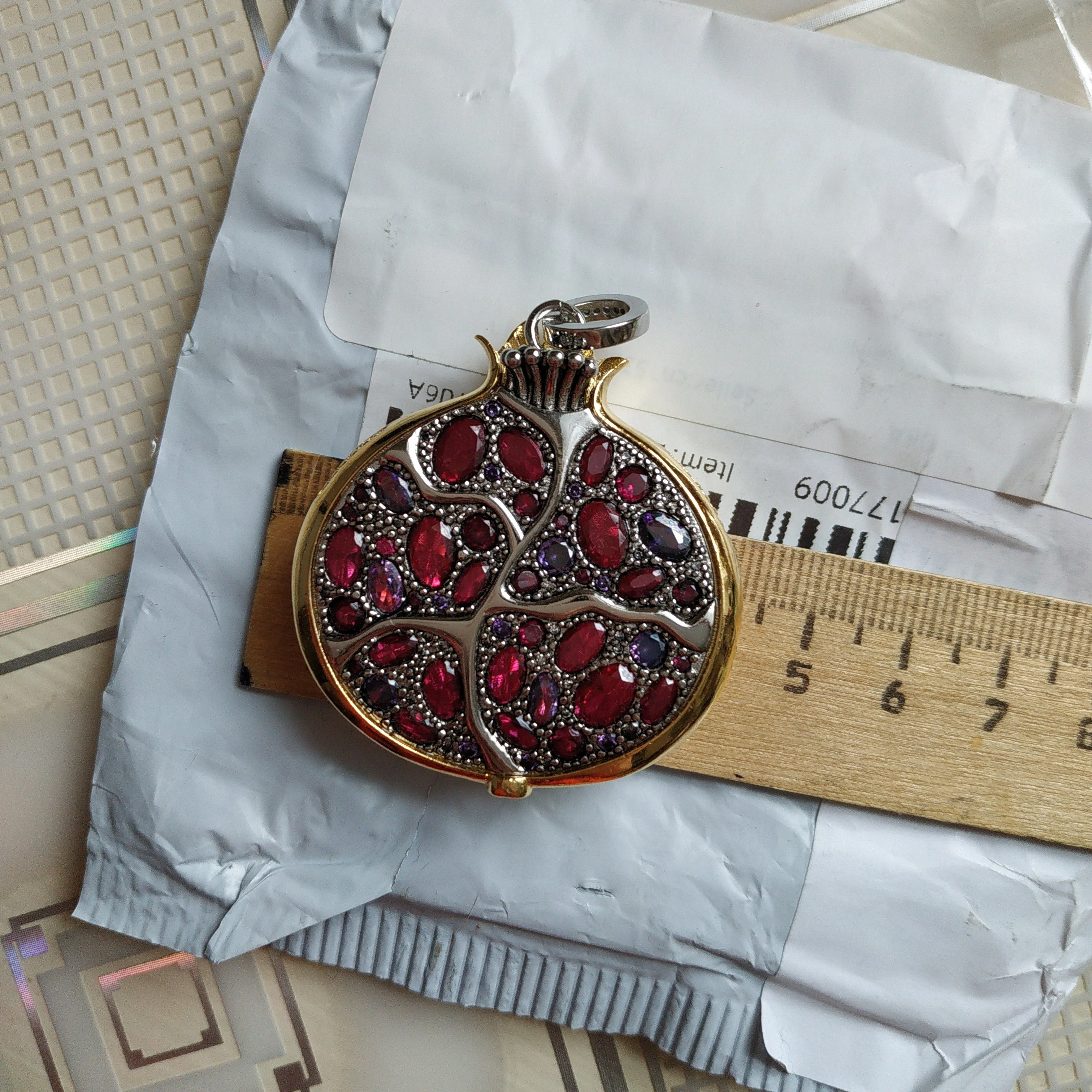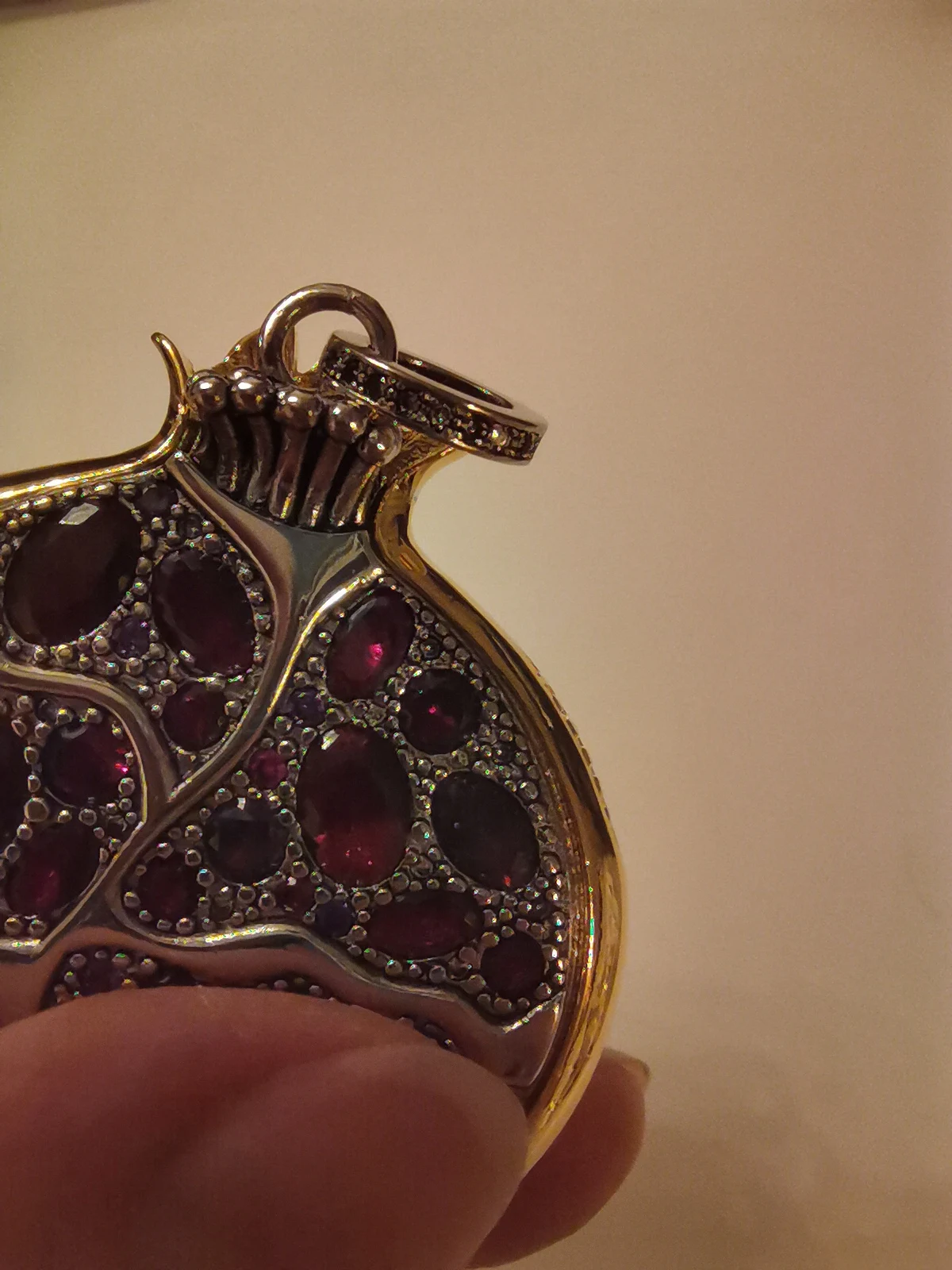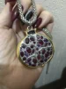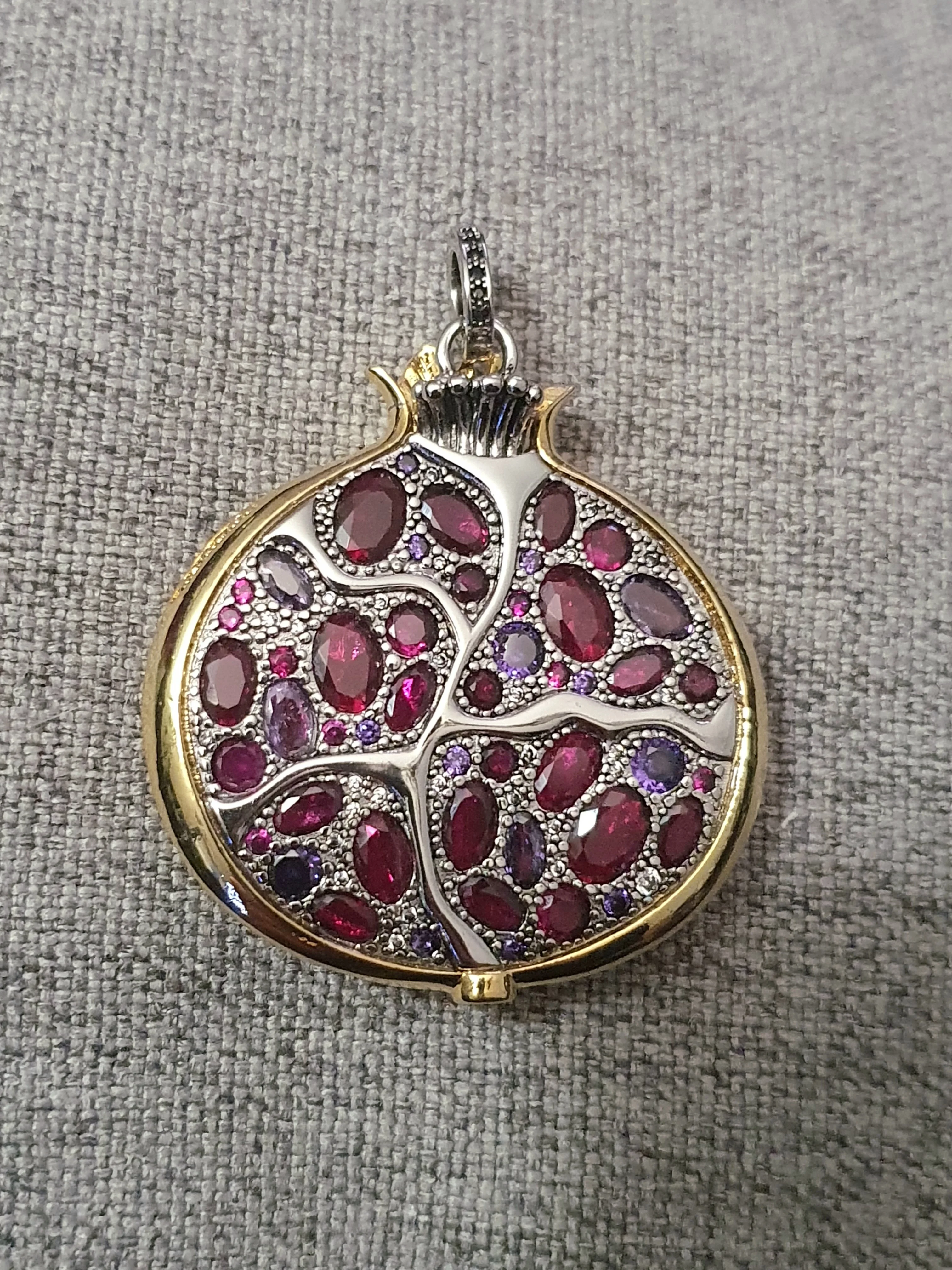 Пробы, естественно нет. Сам кулон тяжелый, качественный. Кристаллы очень красивые- переливаются, разного тона. На фото для сравнения рядом гранаты