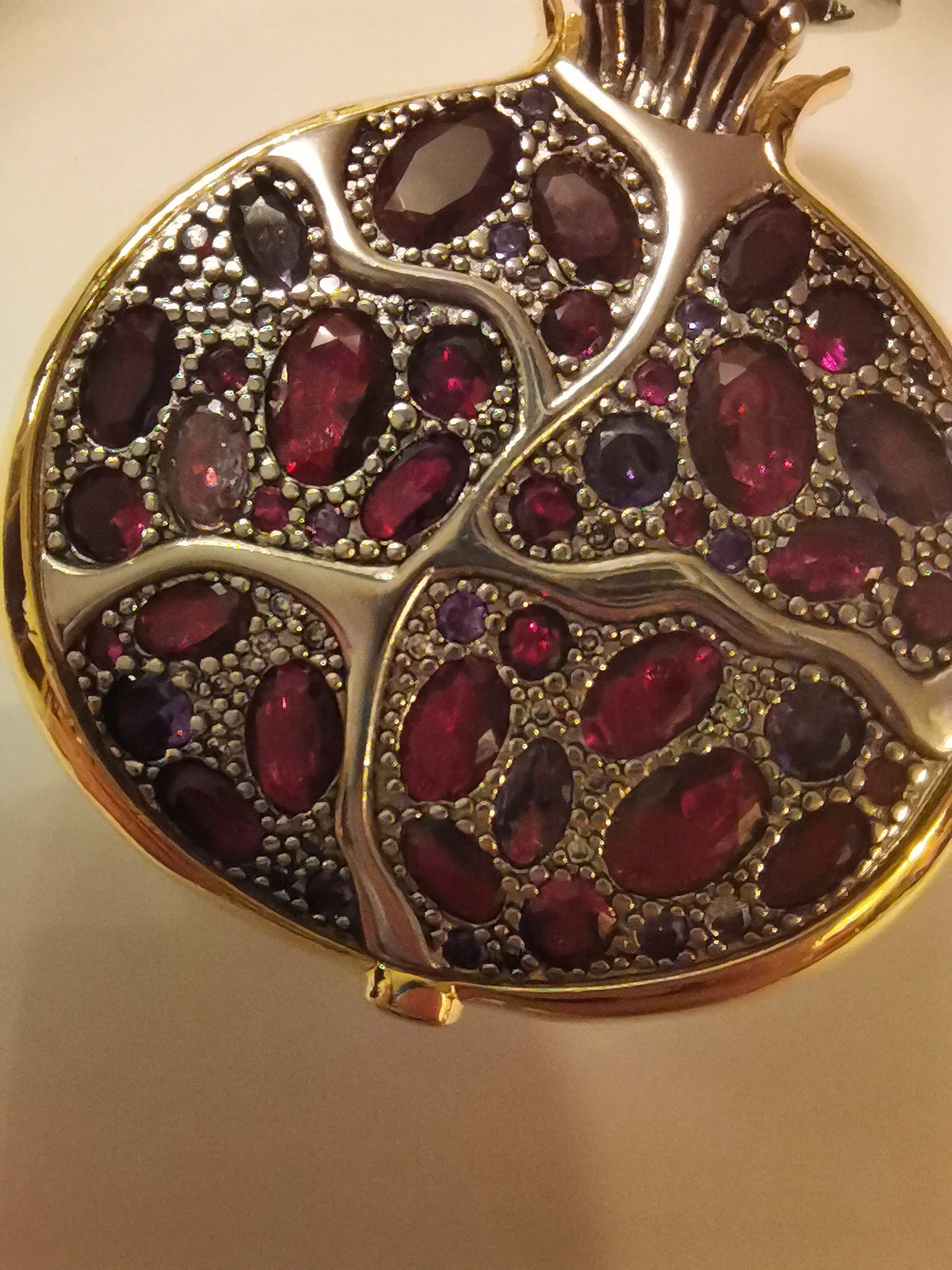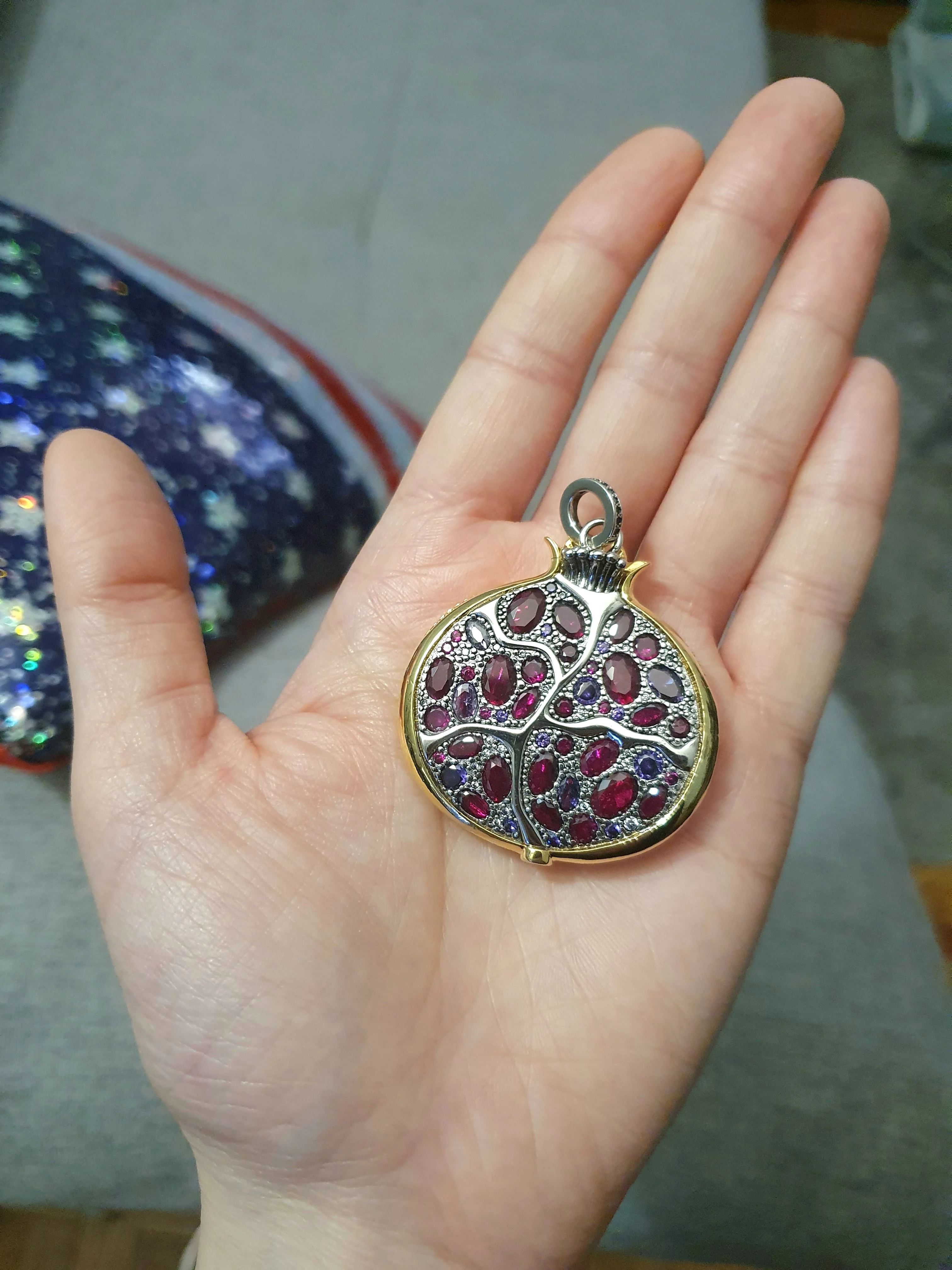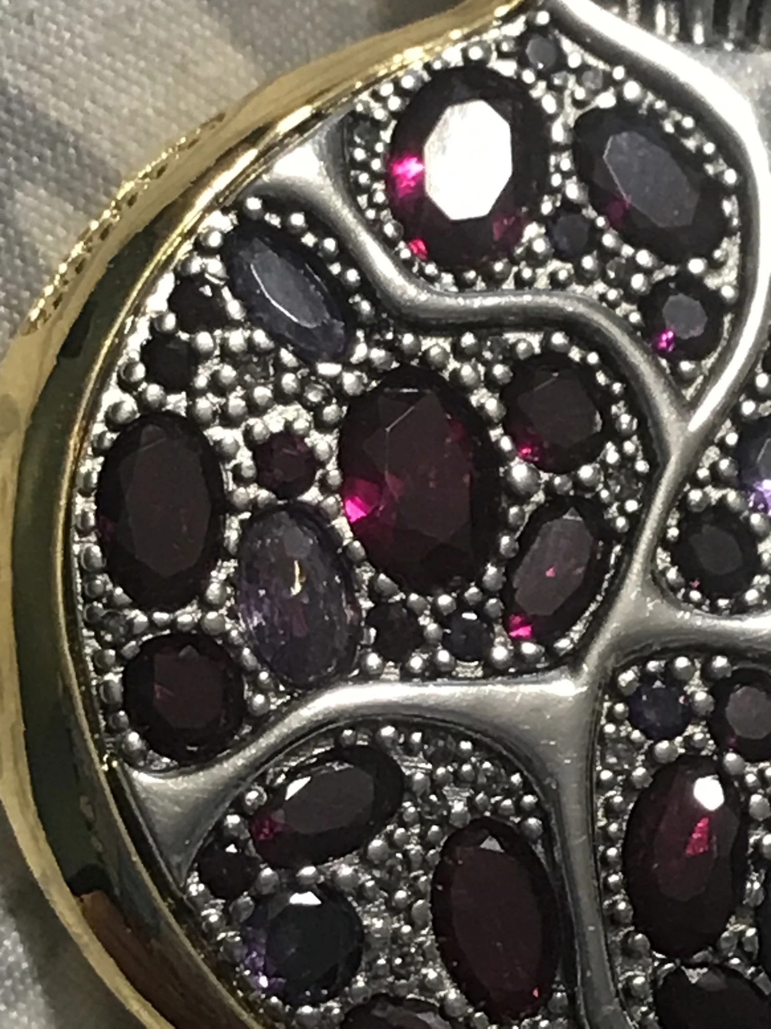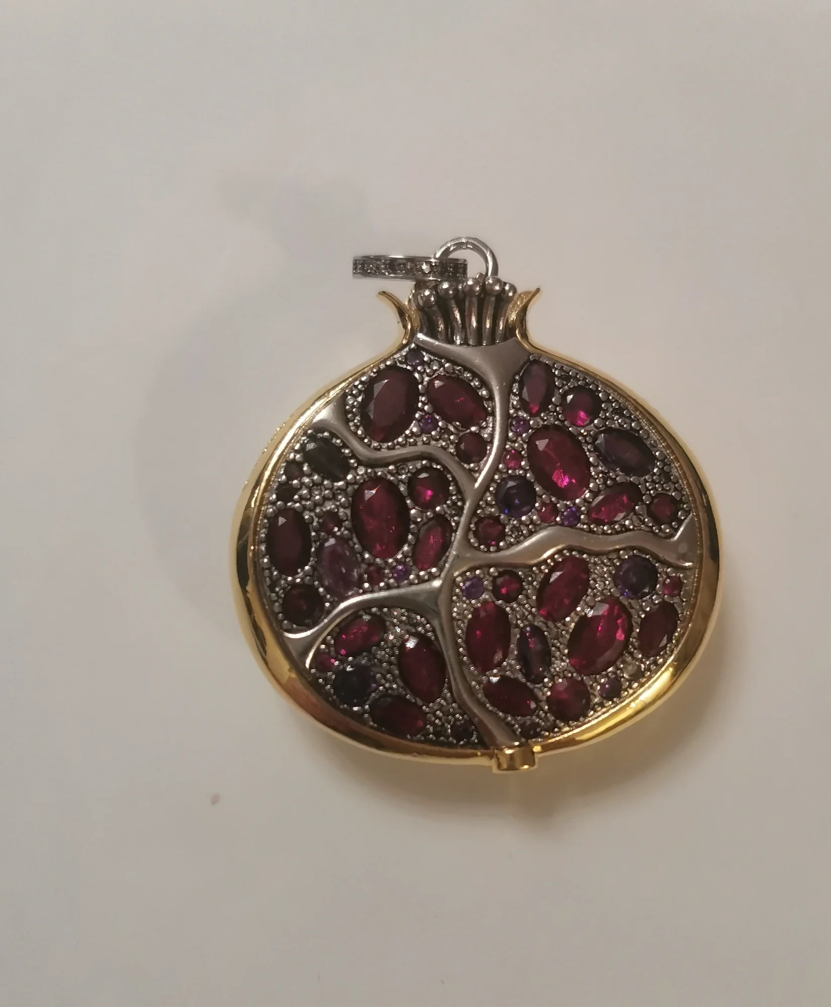 Пробы, естественно нет. Сам кулон тяжелый, качественный. Кристаллы очень красивые- переливаются, разного тона. На фото для сравнения рядом гранаты