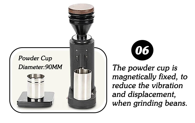 6. Чашка для порошка фиксируется магнитно, чтобы уменьшить вибрацию и смещение при измельчении бобов.