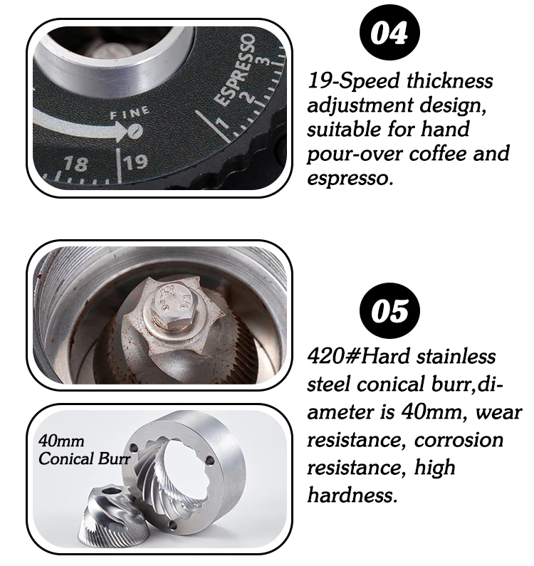 4. Шкала из 19 файлов для регулировки крупности кофейного порошка, подходит как для ручного наливания кофе, так и для эспрессо.