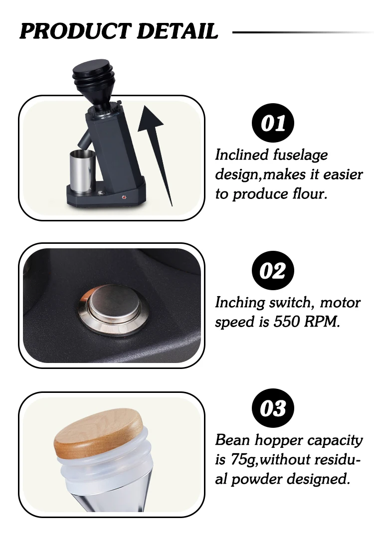 3. Емкость бункера фасоли составляет 75 г. Нажимная Крышка для уменьшения остатков порошка в бункере.