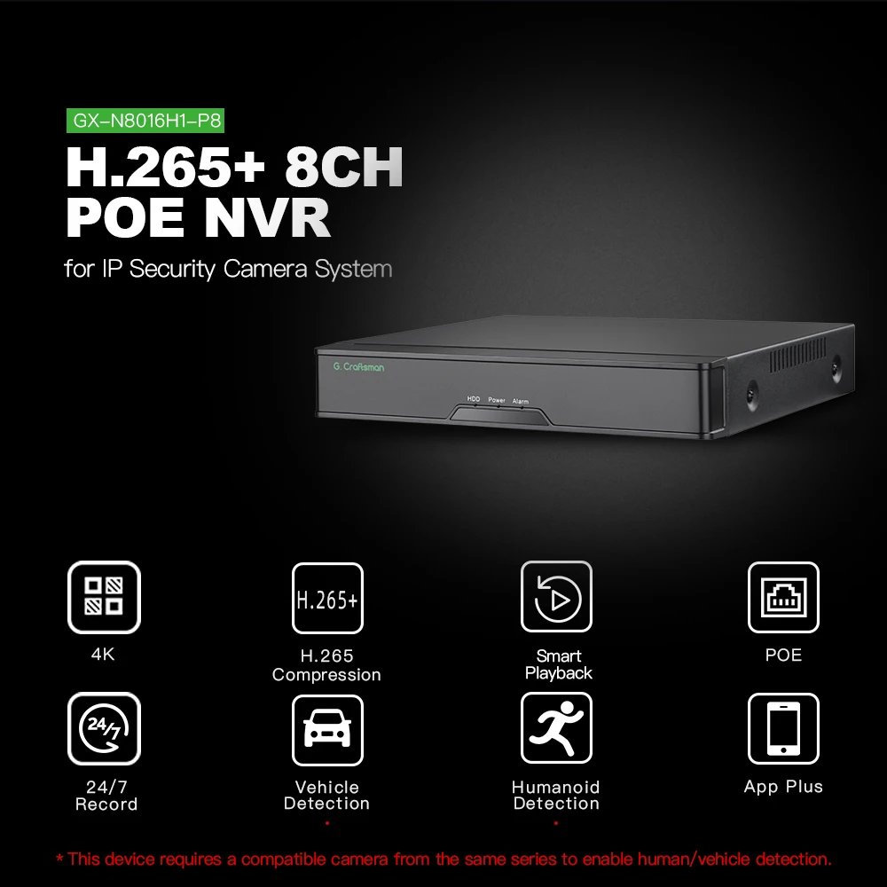 GCraftsman 4K Smart H.265 NVR supports alarm configurations and event search of Smart VCA. Once suspicious events detected, the devices can trigger alarms and recordings, help you improve video surveillance efficiency.