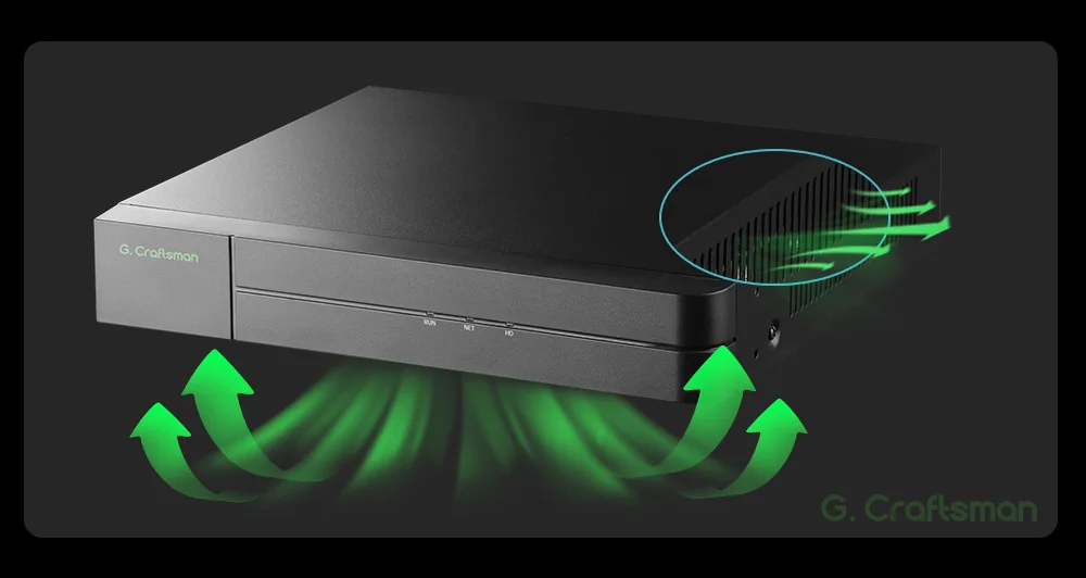 Встроенный радиационный ребро печатной платы эффективно рассеивает тепло.Между тем, вентиляционные отверстия на боковых и нижних панелях NVR максимизируют поток воздуха и отводят тепло, обеспечивая передачу тепла в различных условиях нагрузки.