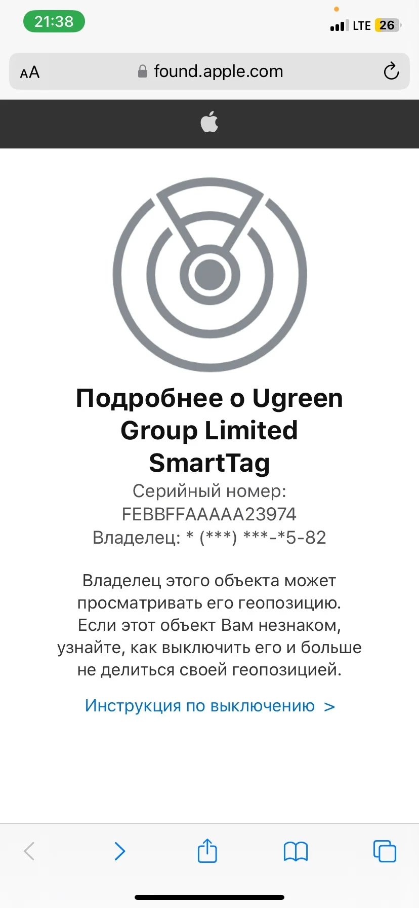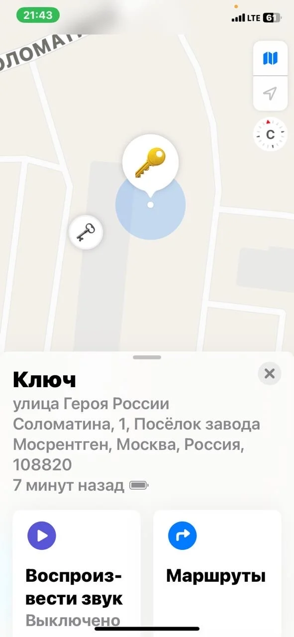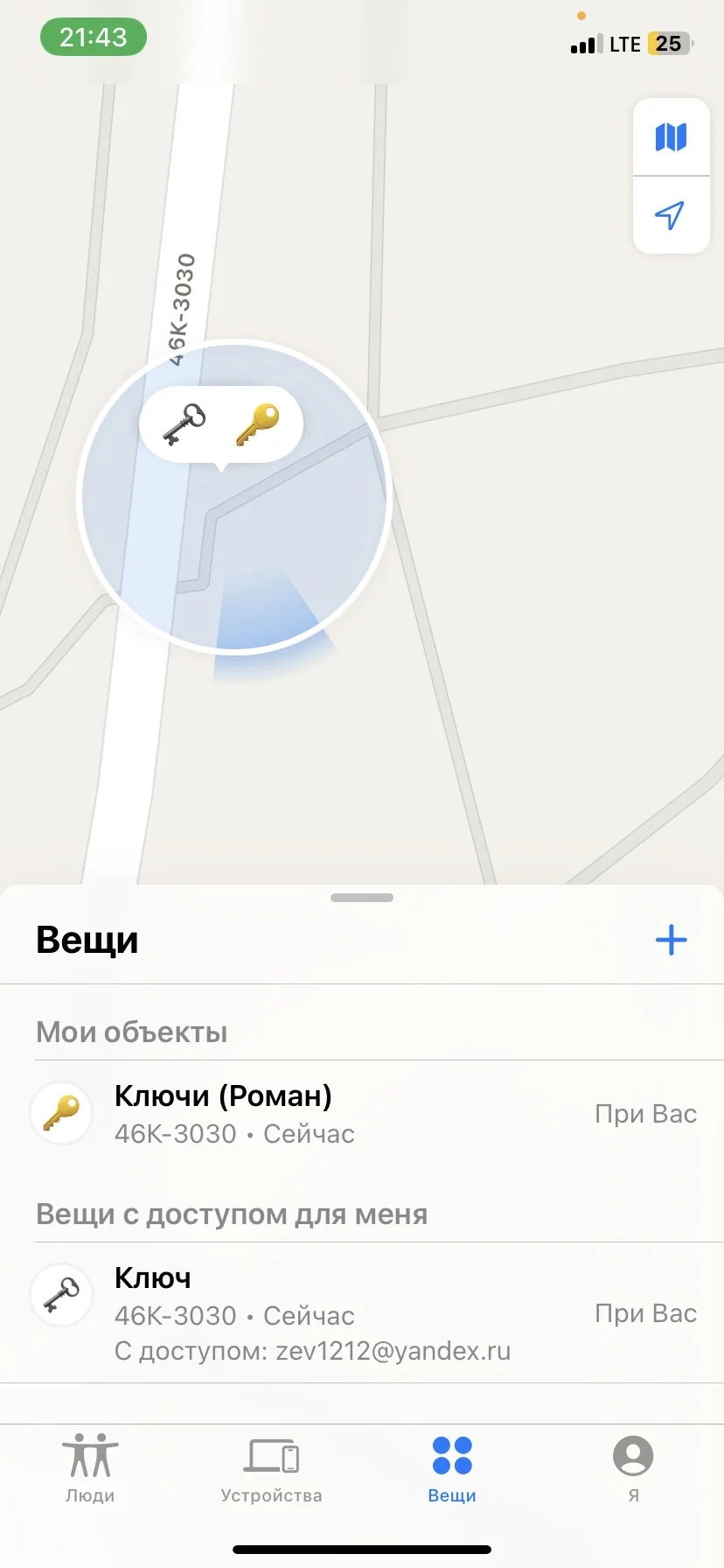 Трекер не показывает реально где находится! Ради эксперепента отдаю ключ другому человеку с Appel Iphone, он уезжает в другое место а в локаторе у меня показывается что он находится при мне. Когда человек в своем локаторе нажимает определить чья это вещь говориться что полезователь видет геопозицию данного трекера, но на деле показывает что вещь находится при мне дома. Сделал доступ этому человеку что бы он мог видеть где эта вешь, у него в локаторе она появляетси и у него пишется что она при нем, а у меня при мне!!! Выкинутые деньги на веьер. Не приобритайте данный товар, не рекомендую!Roman K. 14 мая 2024