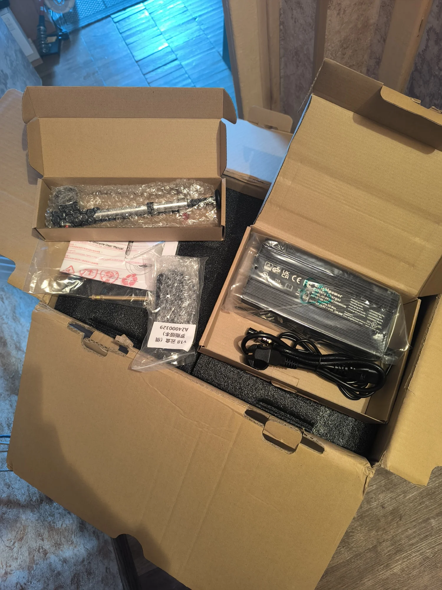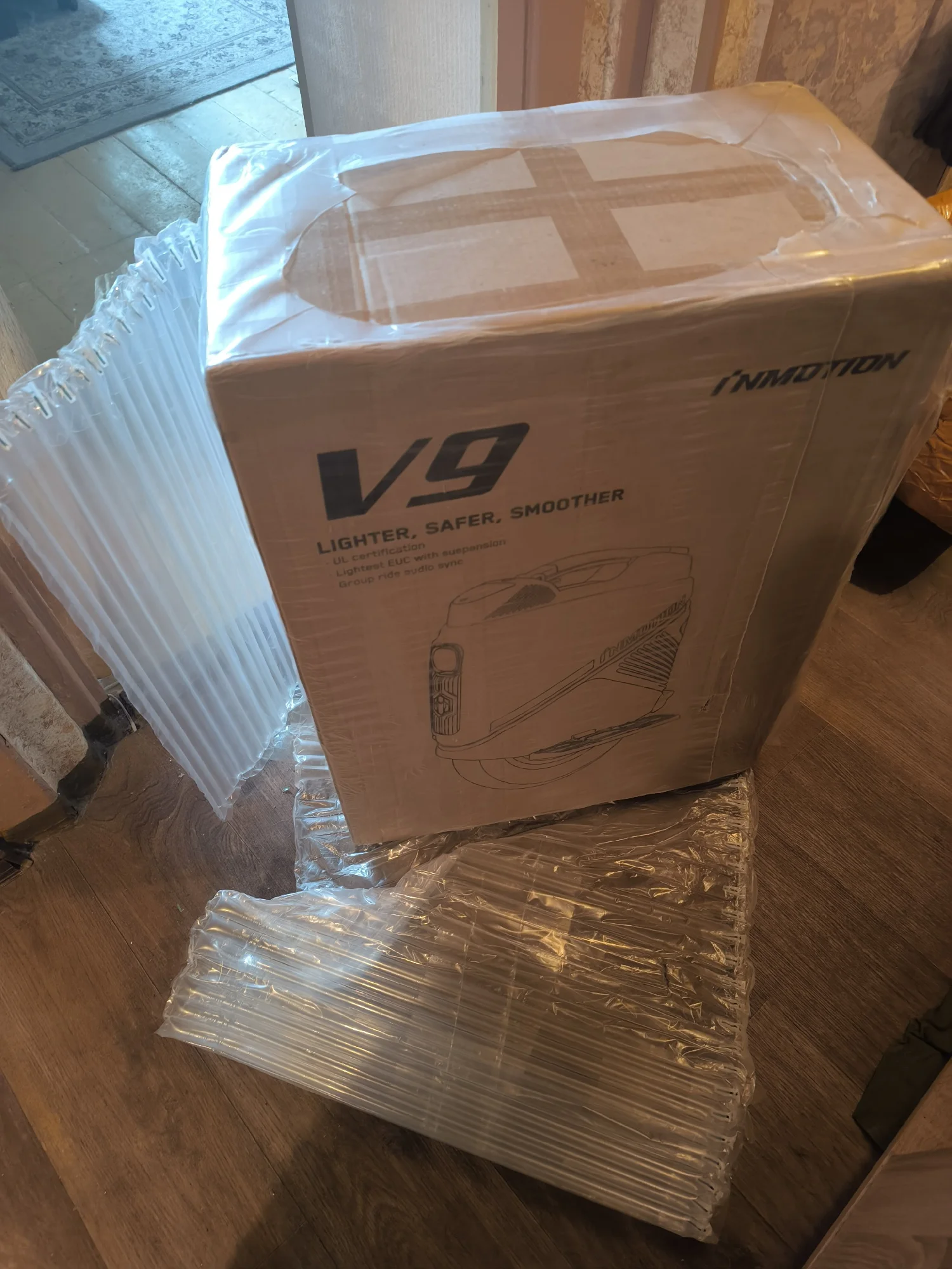 Коробка хорошо упакована в пупырчатую плёнку. Колесо шло долго из-за местной службы доставки. Для работы функции rideconnect нужно заменить GPS модуль который лежит в коробке.