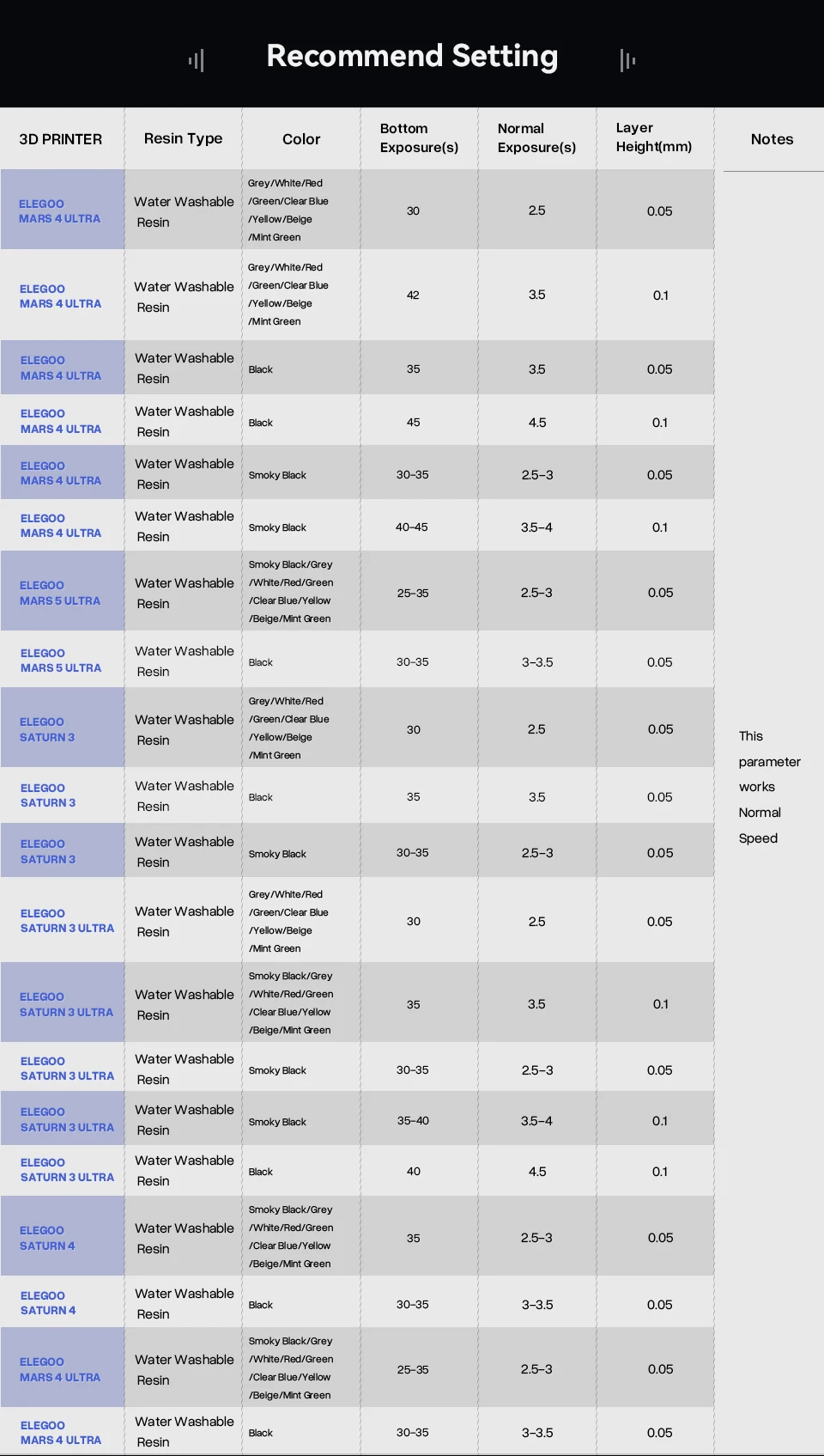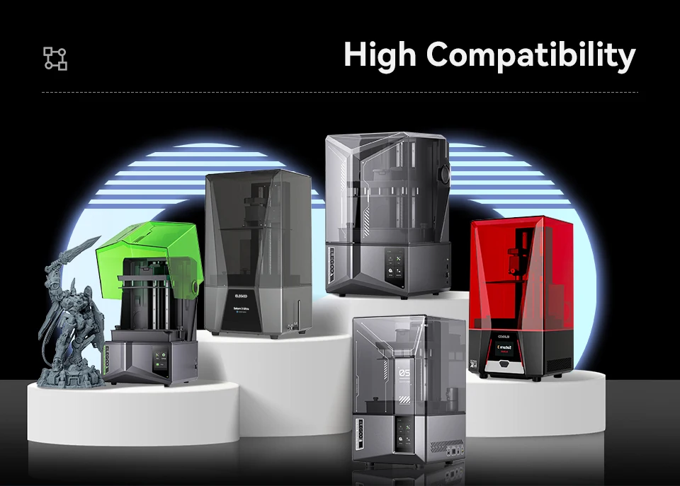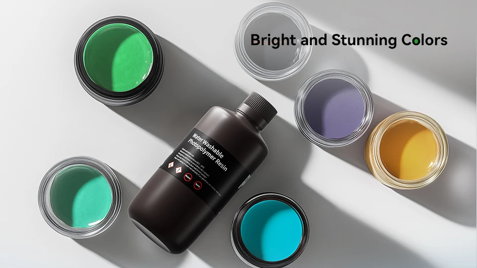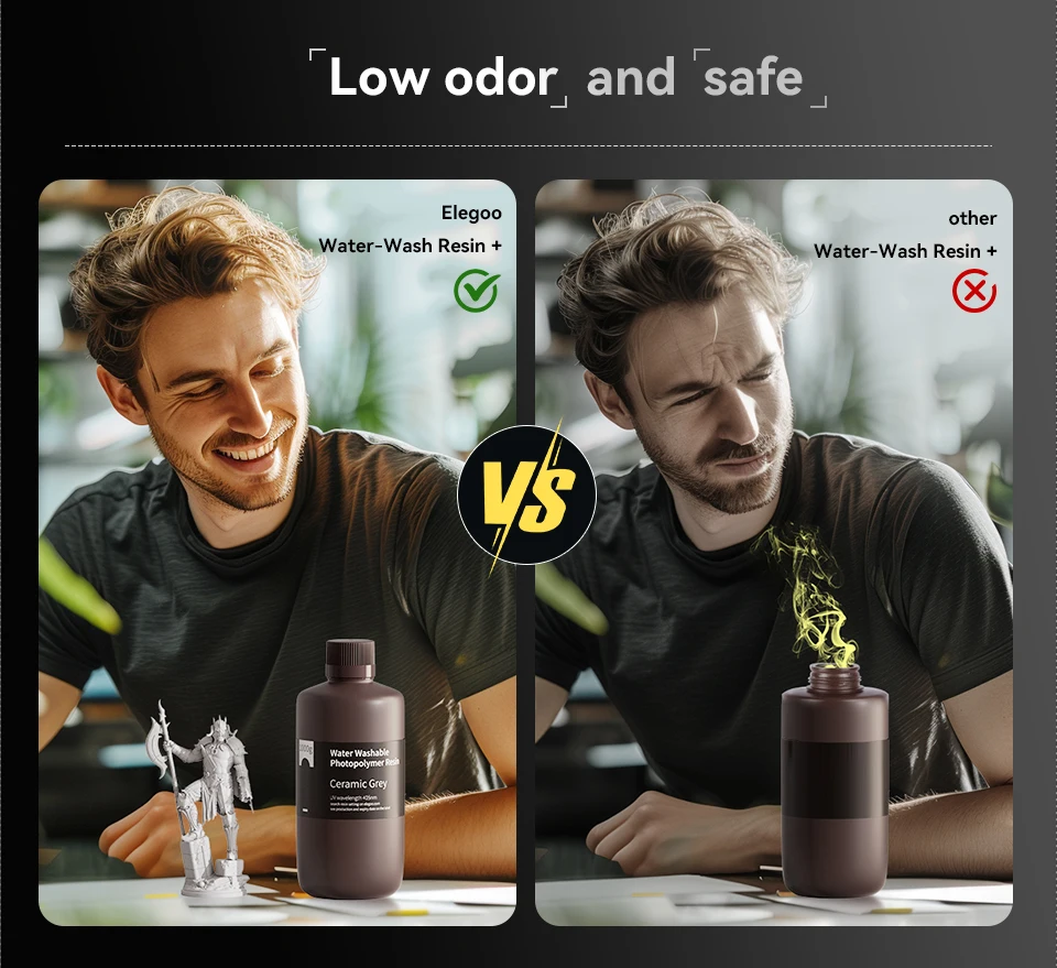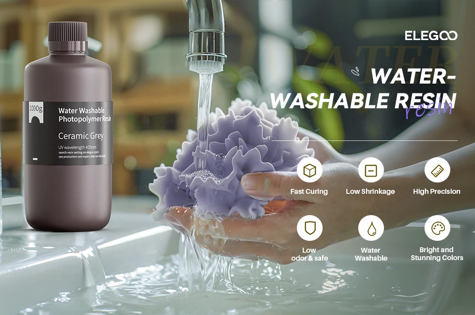 Safe and Low Odor ELEGOO standard photopolymer resin is specially formulated with less odor and a very pure and bright color. There is less pungent smell during printing, thus maintaining a freshening printing environment. Water Washable Unlike standard resin, water-washable resin is highly hydrophilic, that is easy to be cleaned by water, you don t have to buy alcohol to clean. Save your time and money. High Compatibility Compatible with most LCD 3D and some DLP printers.Specially designed for high speed LCD 3D printers, combine with Saturn 3 Ultra, Mars 4 Ultra, you'll get a smoother and more efficient printing experience than ever before.