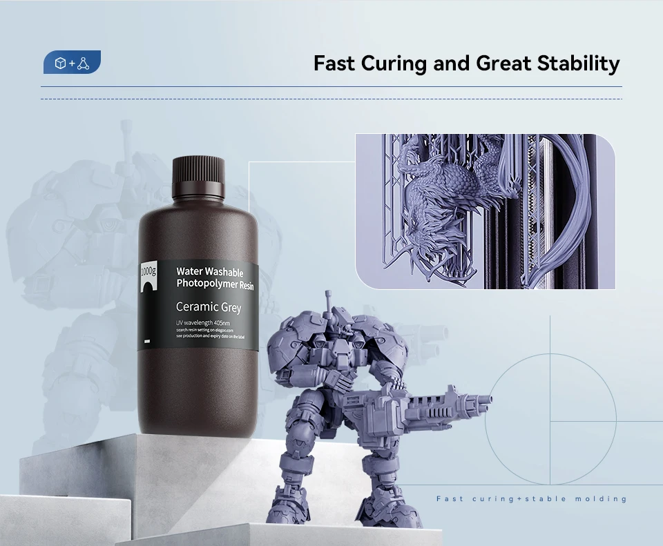 Fast Curing and Great Stability ELEGOO 405nm Rapid Resin was designed to significantly reduce printing time with its excellent fluidity.