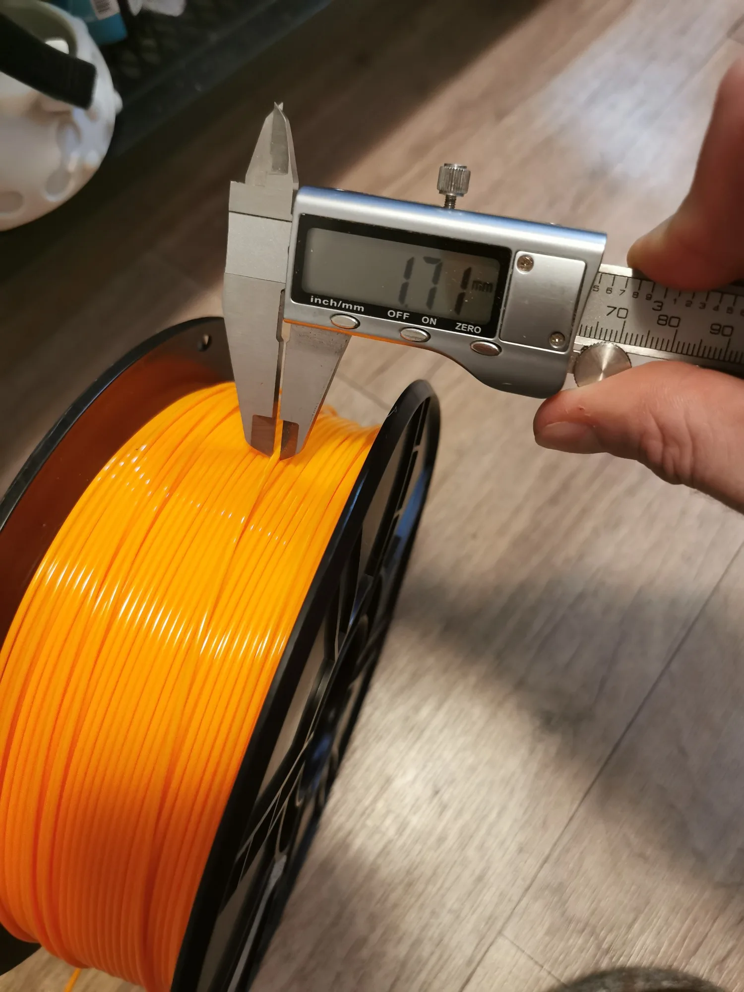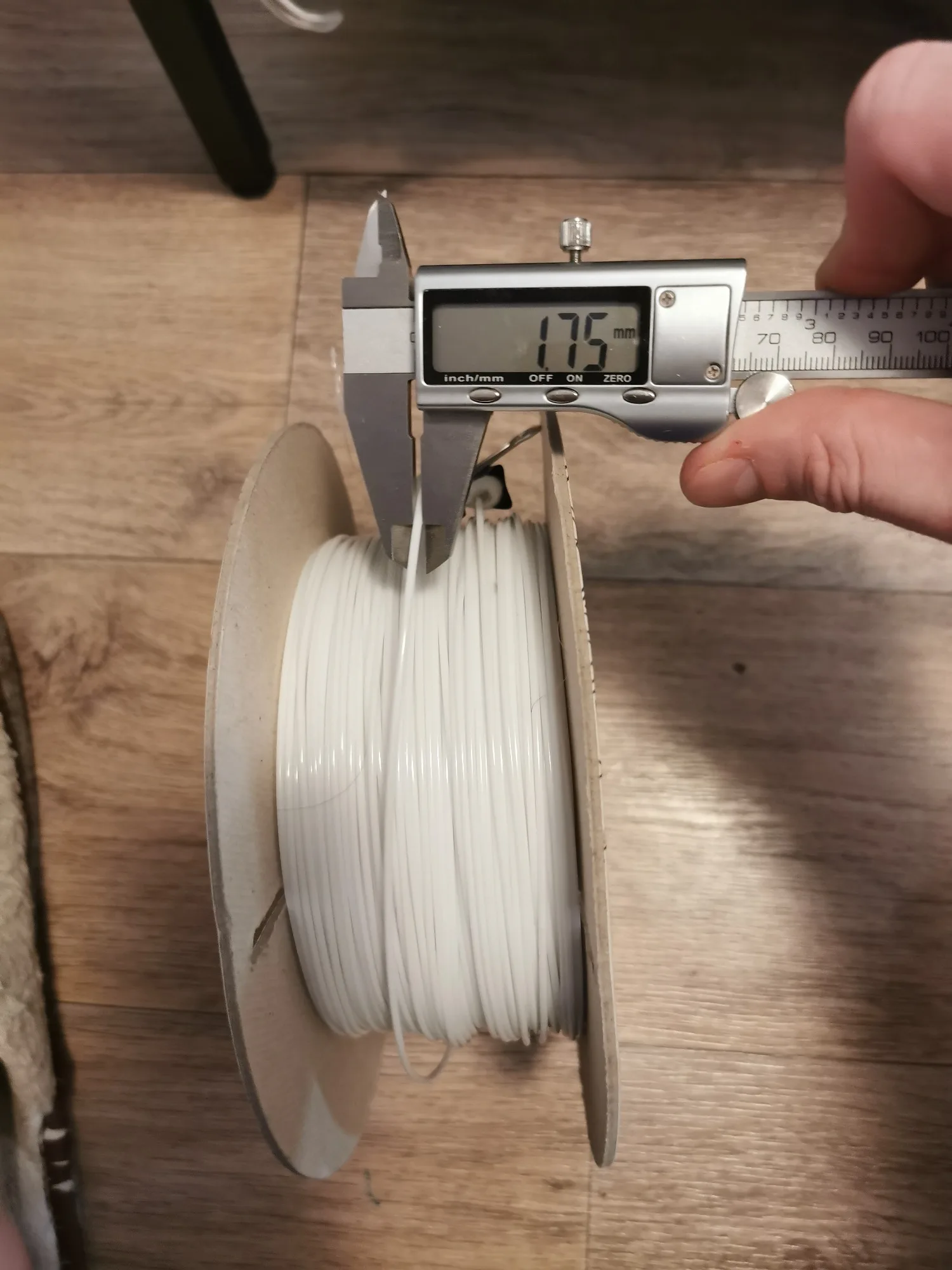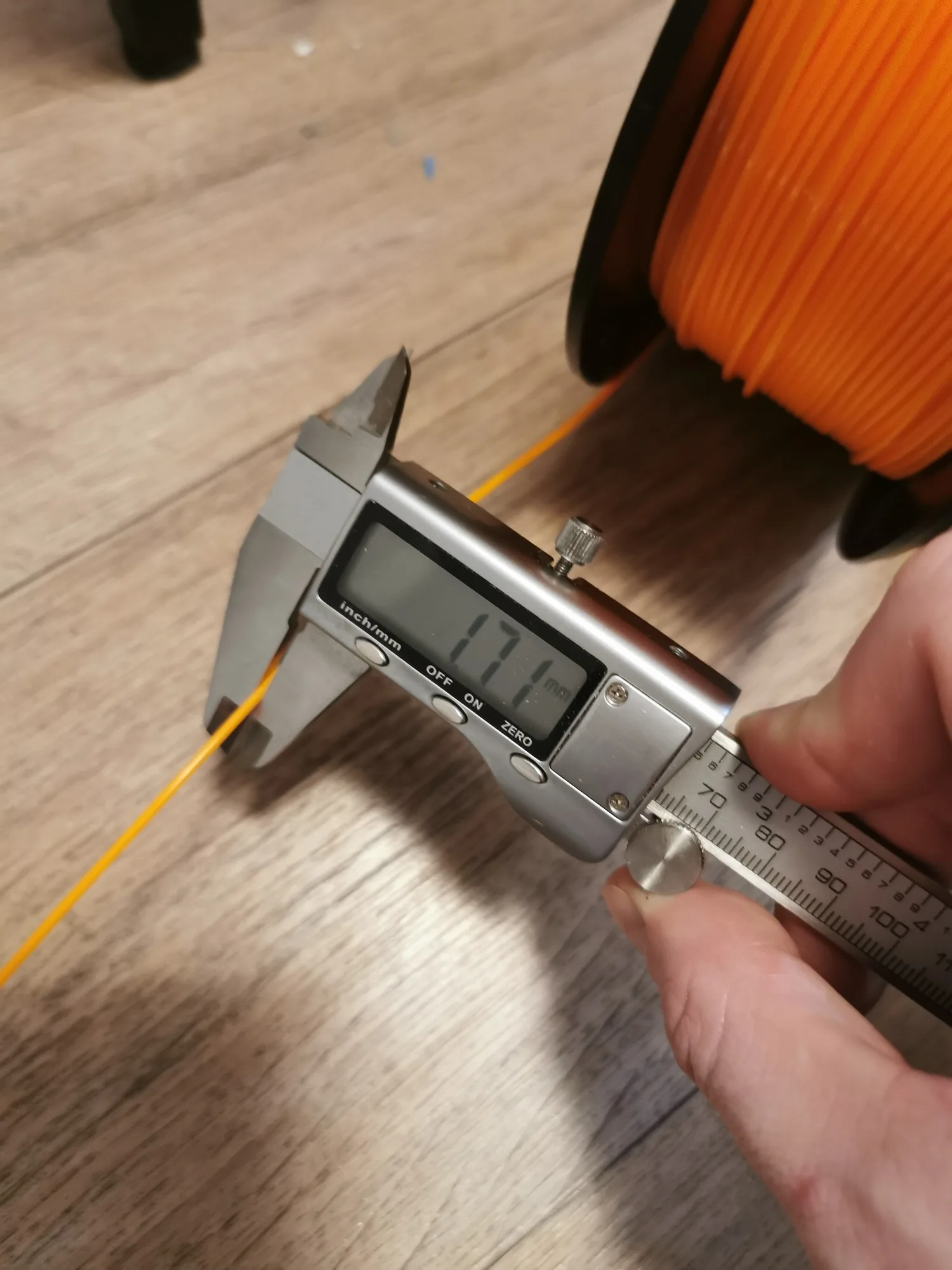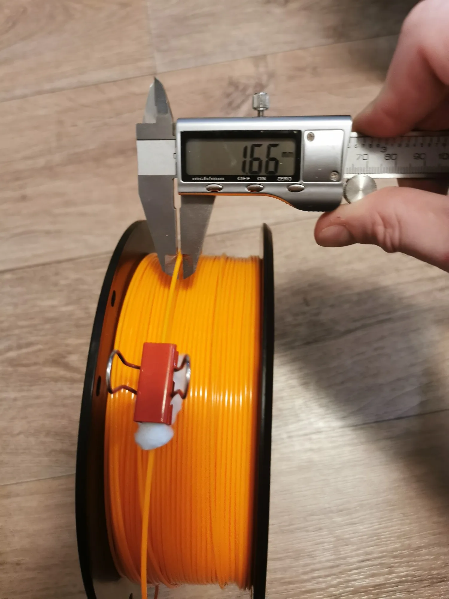 Отзыв об оранжевом пластике. Печатал обычно петг от синтека на таких настройках: сопло 0.6, слой 0.4, Т230, стол (стекло со спец клеем) 70, все скорости ниже 60. Синтеком деталь отпечатал нормально, поменял пластик на ериван, т.к. нужен был оранжевый цвет и началась жесть. Первое: пластик никак не липнет к столу, даже если с помощью z-offset вмазать его тонким слоем или поднять Т стола до 80 7г. Второе: ширина прутка дико гуляет, ничего близкого к 1,75мм я найти на катушке не смог сделав около 10 замеров и размотав несколько метров, для примера и проверки штангена сделал 1 замер на двух разных катухах и там сразу получил 1.75мм+- (белый - синтек, изумруд - БФ)