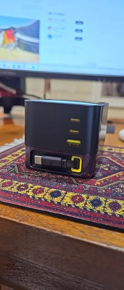 Зарядна станція виглядає дуже стильно, приємні матеріали на дотик. Користуватись зручно і приємно. Має вбудований кабель USB Type C, який магнітиться до корпусу станції, а також розкручується як рулетка, і скручується самостійно.