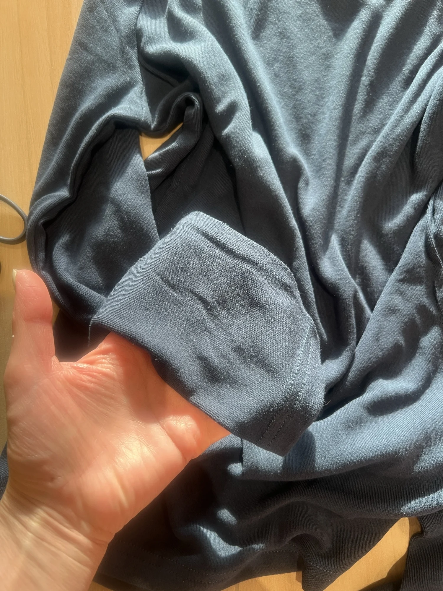 Приятная к телу , доставка за 7 дней, прекрасно тянется, на 90/72/98 берите М, я взяла размер Л и пожалела, рукав длинные, в груди большая, длинная. Донгслив фабричный, бирки присутствуют, ворот укреплен. Рекомендую брать свой размер