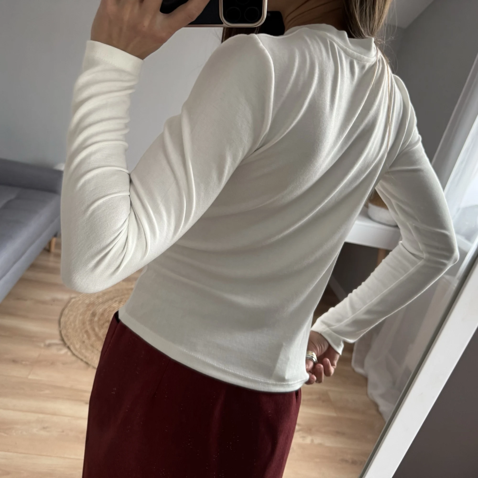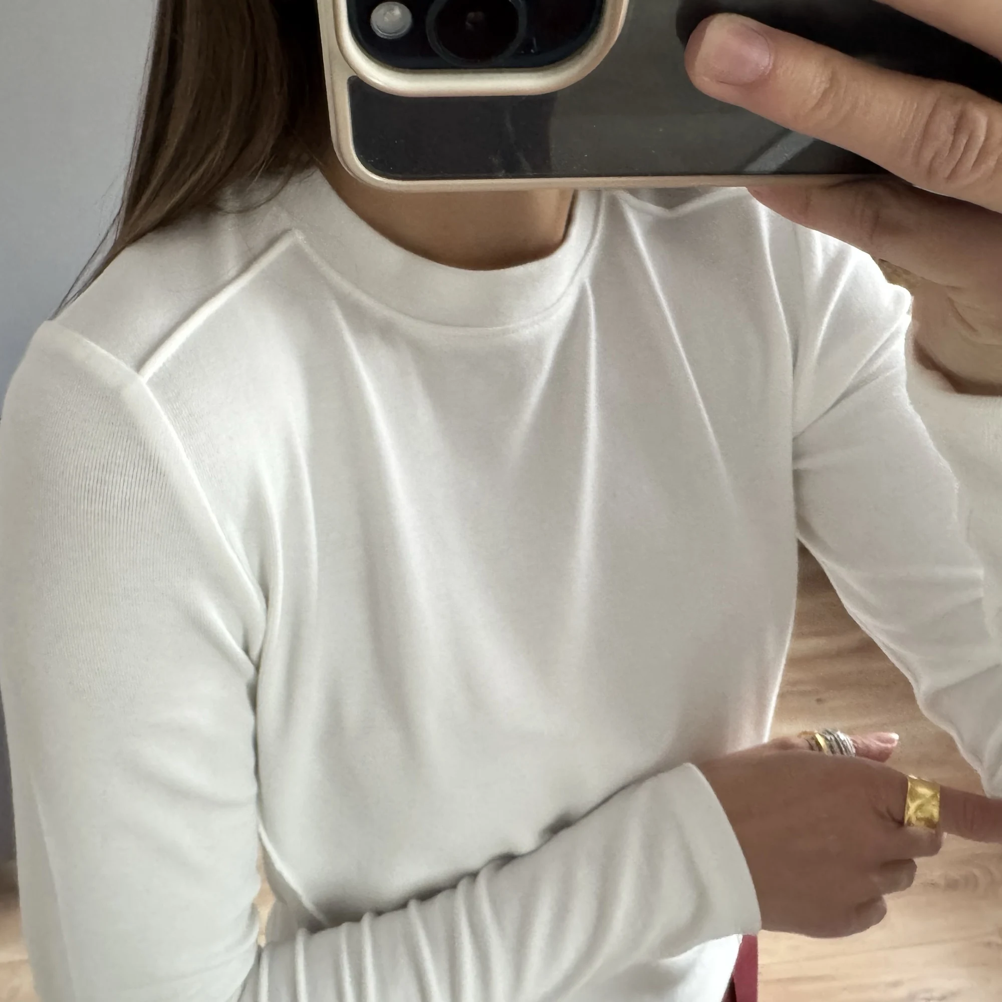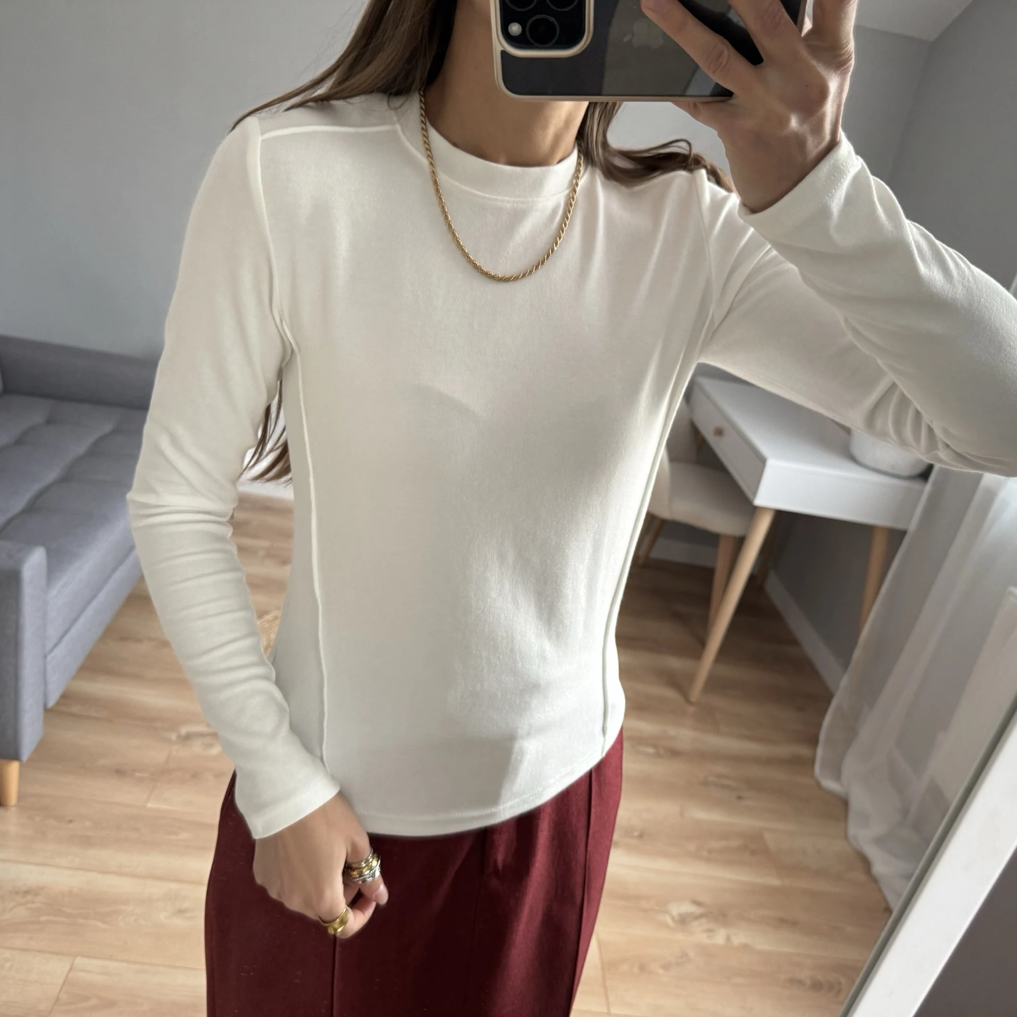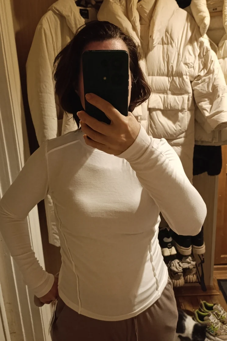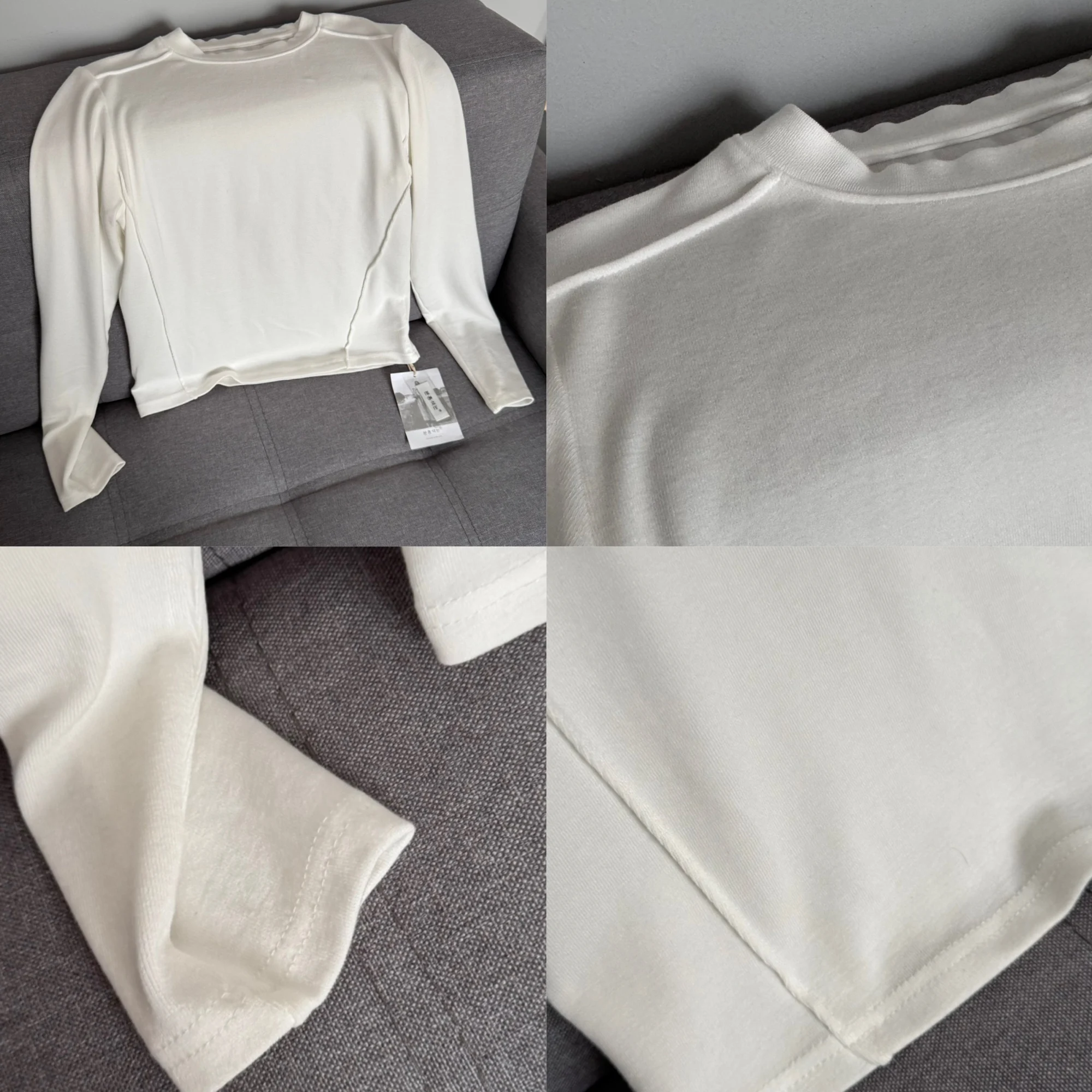 Мои параметры 86/66/89 см, грудь 75С и рост 160 см. Выбрала в размере М в цвете Cream White. Тактильно материал очень нежный и приятный, тоненький, легкий, с телесным бельем не светит. Хорошая длина рукавов и самого лонгслива. Спереди расположены декоративные наружные швы. Прекрасное качество пошива. Очень понравился!