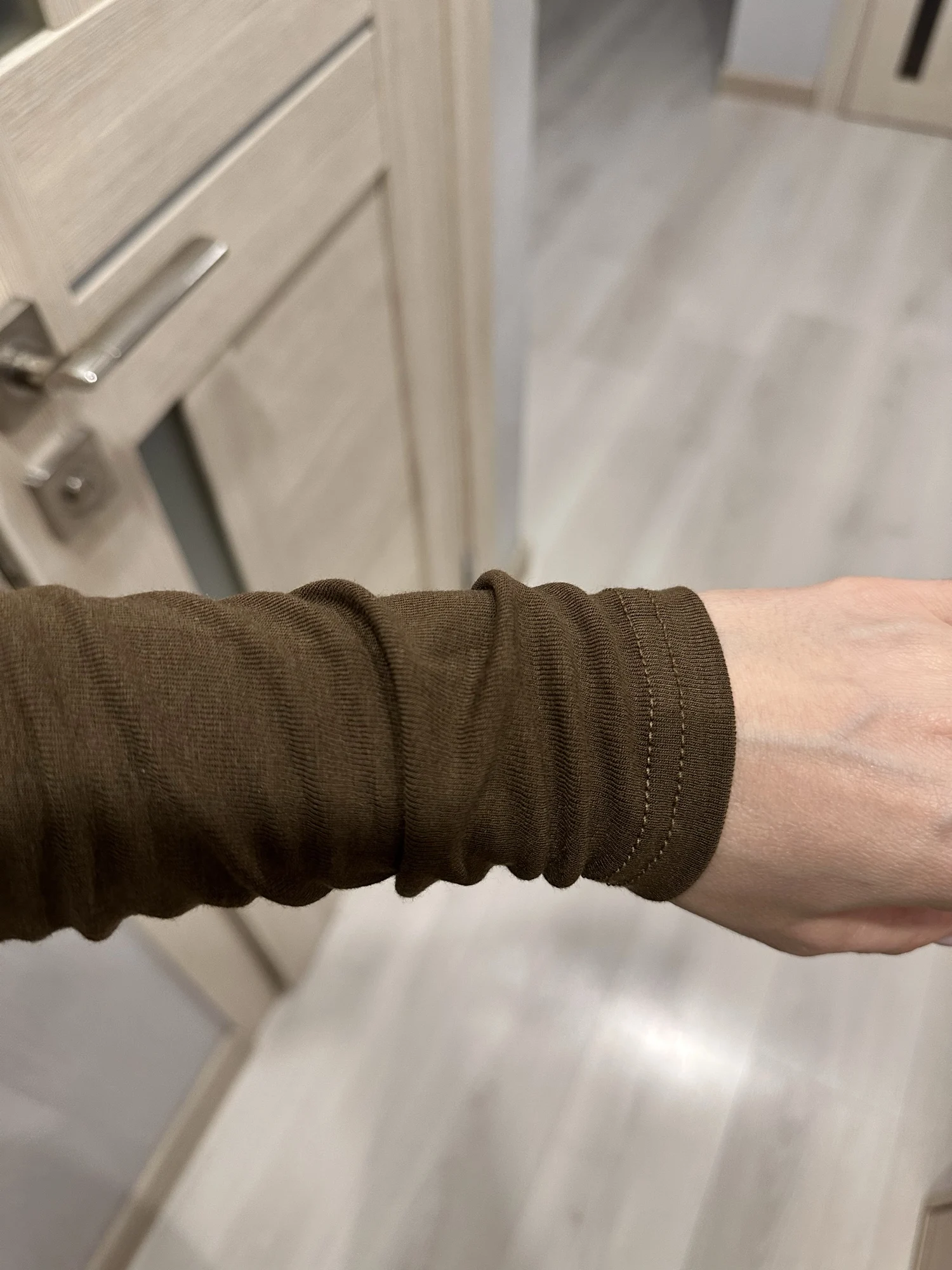 Материал лонгслива приятный, чувствуется вискоза, хорошо тянется. На рост 163 и 46 размер сел прекрасно. Рукава длинные. Взяла в качестве пододевалки на зимний период , так как понравилась горловина. По моему мнению цена завышена за такой "no name". В этом магазине я покупала несколько вещей и качество в целом неплохое.