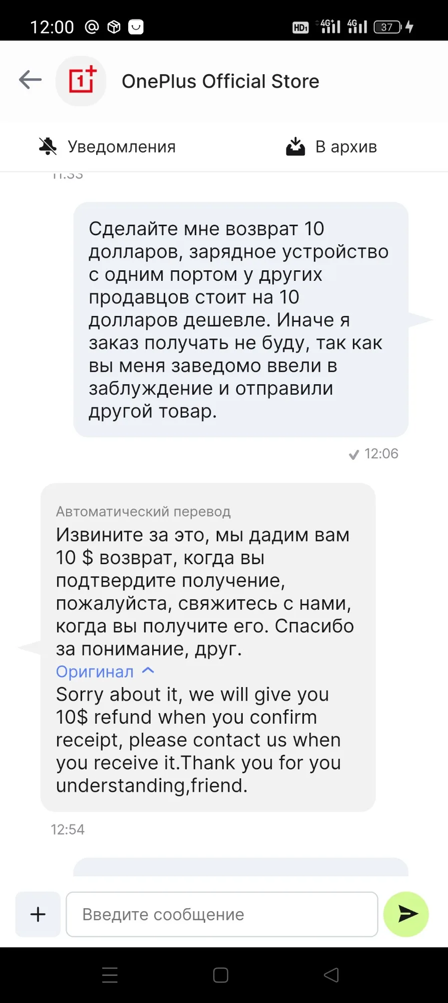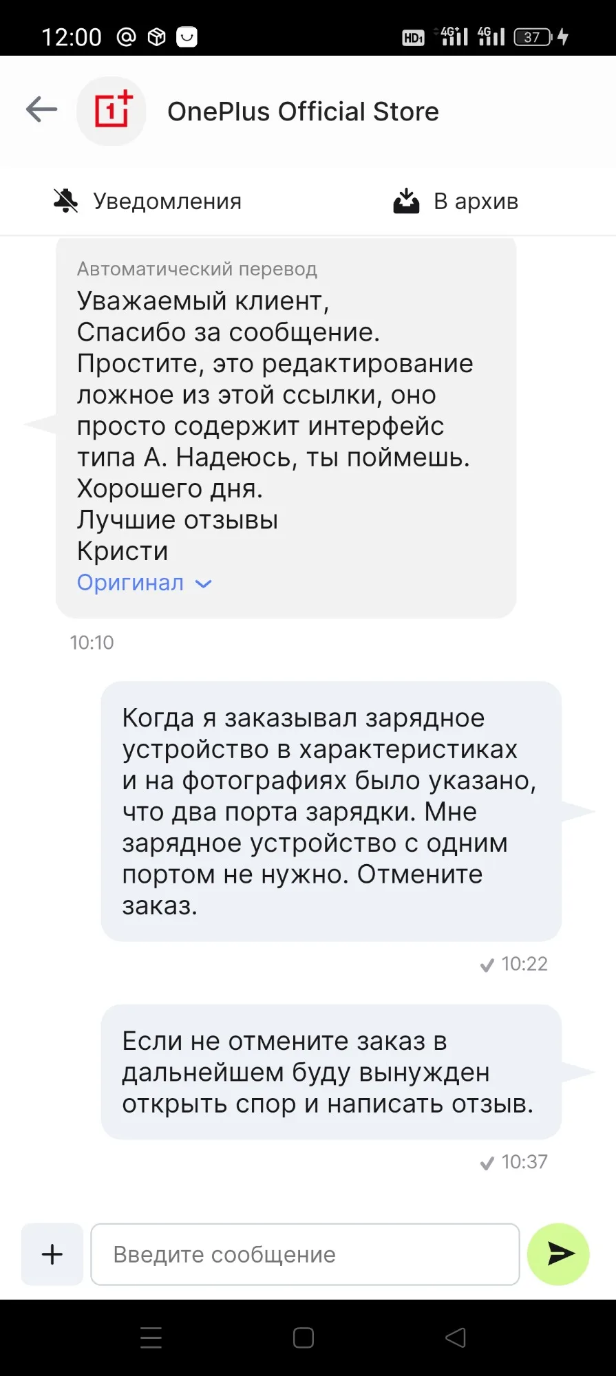 16 февраля 2024 года во время оформления заказа на странице продавца было указано в характеристиках и на фотографиях товара - зарядное устройство с двумя выходами и красным кабелем для зарядки. Через несколько дней, я обратил внимание, что фото и характеристики товара на странице товара изменились, а именно появилось зарядное устройство с одним выходом и белым кабелем. Я написал письмо продавцу, чтобы уточнить отправлен ли мне уже товар, и если да, то какой именно. Продавец ответил: простите, это редактирование ложное из этой ссылки, зарядное устройство с одним выходом и товар отправлен уже. Продавец написал, что если я получу это зарядное устройство, то он незамедлительно компенсирует мне 10 долларов, т.к. зарядное устройство с одним выходом стоит на 1000 рублей дешевле у других продавцов. 14 марта, я получил зарядное устройство с одним выходом, сообщил продавцу. Продавец ответил, что перечислит 10 долларов через 15 дней. НО через 15 дней уже закончится срок защиты покупателя, и я соответственно не смогу открыть спор.