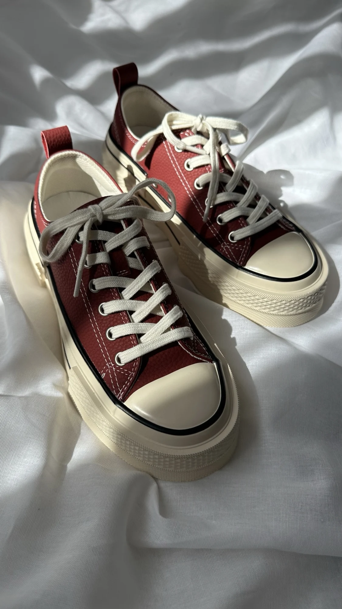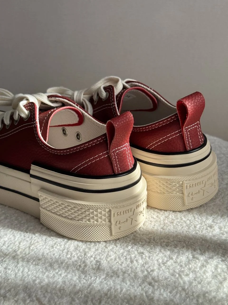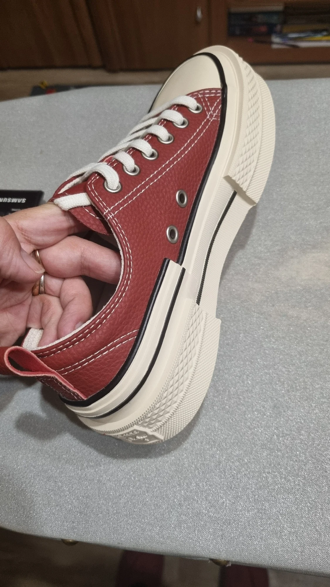 Именно эта модель нравится мне больше, чем высокие кеды (показывала их на своем канале). В процессе эксплуатации оказалось, что довольно проблематично надевать высокие кеды - нужно расширить зону обхвата щиколотки, ослабить шнурки и помочь себе «ложкой», чтобы надеть их. Хотя смотрятся высокие кеды круто. Но, более практичной оказалась именно модель в стандартной длине. На длину стопы 22,5 см заказала кроссовки в цвете Red в размере 5 (35) на свой 35 российский размер, соответственно. На выбор 4 цвета. По размеру подошли идеально. Кеды подойдут на узкую и средней полноты ногу. Комплектация: коробка, индивидуальные пыльники, полустельки. Выполнены из натуральной кожи. Резиновая подошва. Внутренняя отделка из текстиля для комфорта ноги. Кеды на шнуровке, которой можно регулировать посадку по объему ноги. На ноге сидят очень комфортно, удобные и легкие, несмотря на довольно массивную подошву. Качество безупречное! Модель отдаленно напоминает знаменитые кроссовки бренда Converse. Очень стильные кеды на прохладное лето и теплую осень!