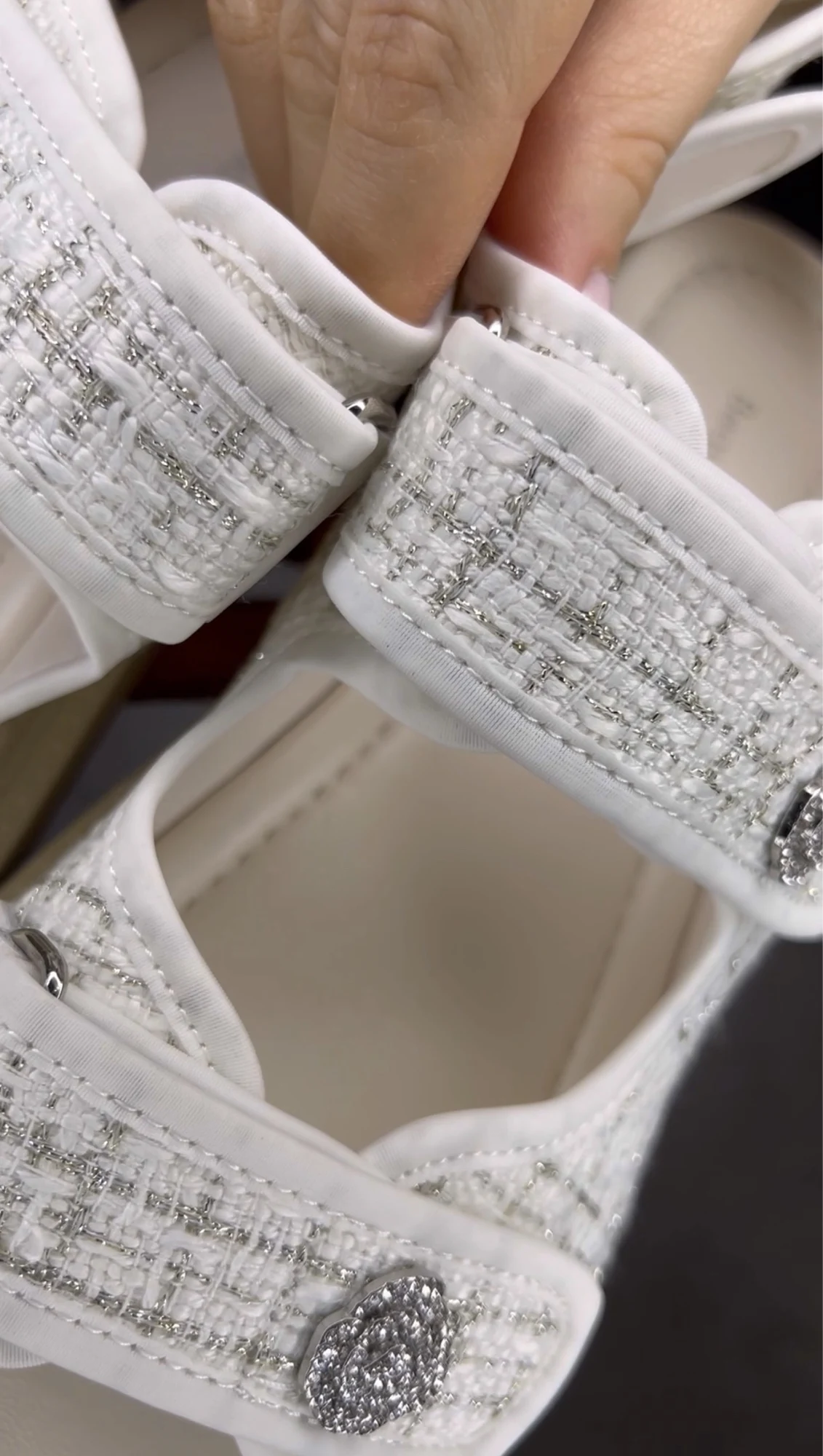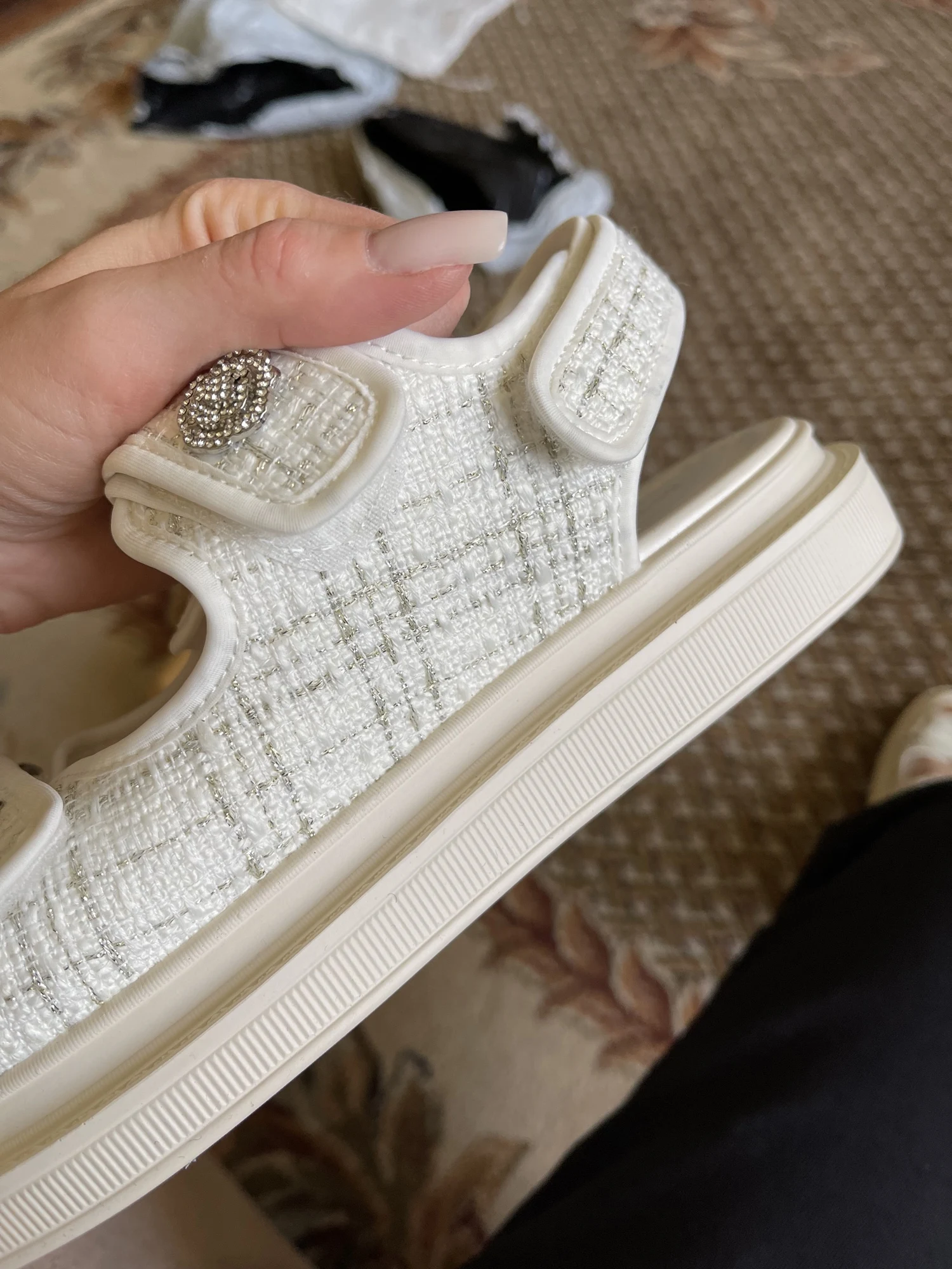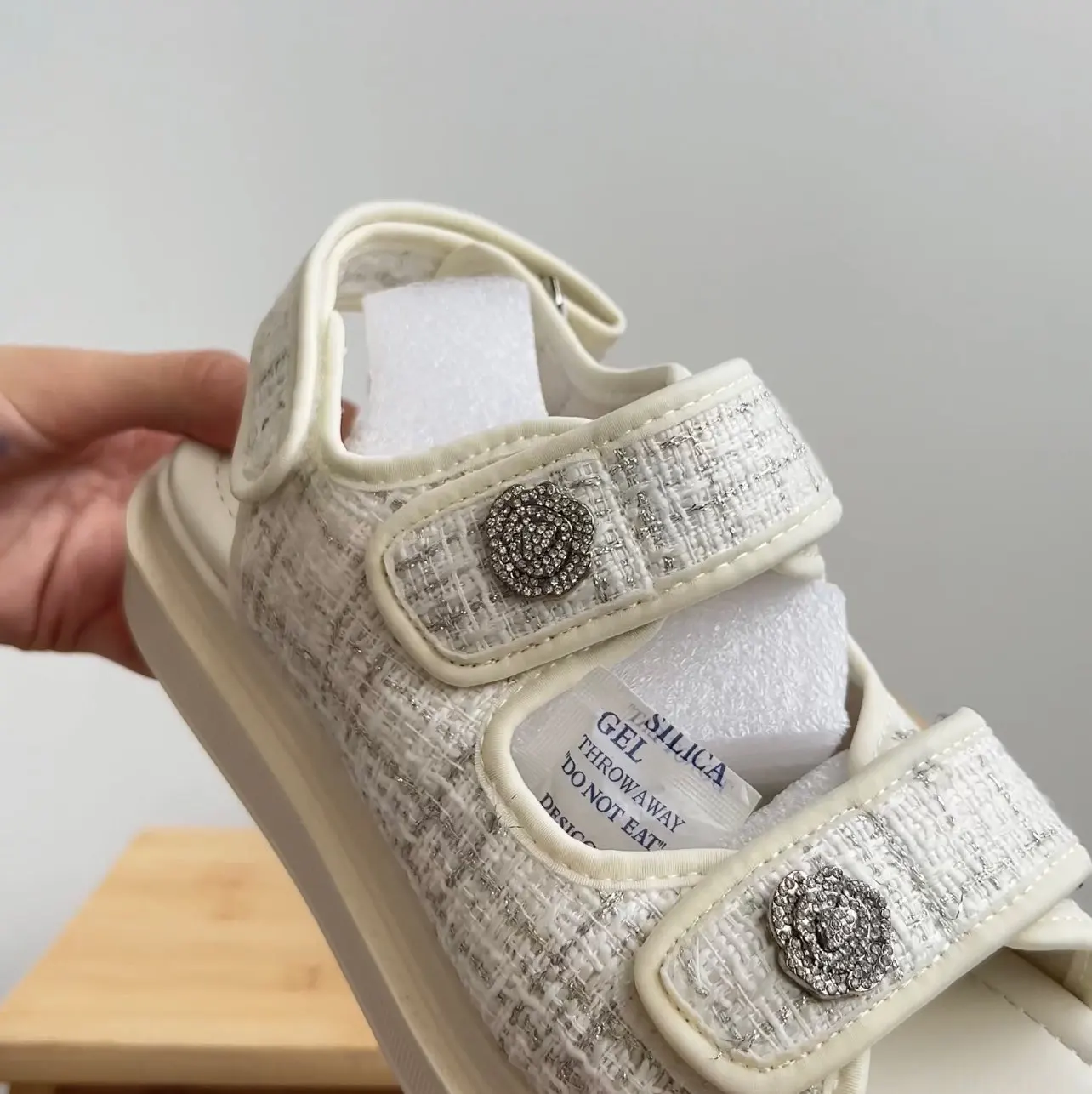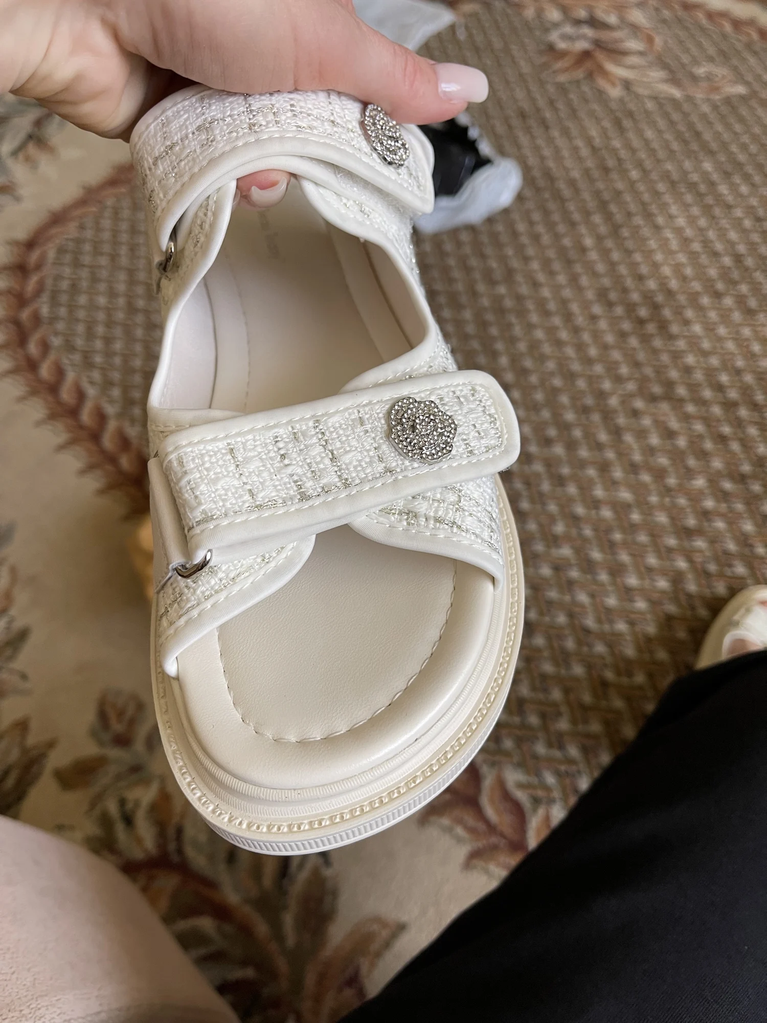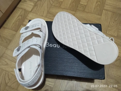 На длину стопы 22,5 см заказала сандалии в цвете beige в размере 5 (35) на свой 35 российский размер, соответственно. Комплектация: коробка, индивидуальные пыльники, полустельки. Верх выполнен из искусственной кожи и твида, подкладка и стелька - из искусственной кожи. Сандалии на ремешках-липучках, регулирующихся по объему ноги (в том числе и задник). Полиуретановая нескользящая подошва. Фурнитура в серебристом цвете. Украшены «розочками» с мелкой инкрустацией стразами. Сандалии очень удобные, мягкие, подойдут для длительных прогулок.