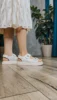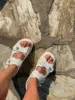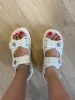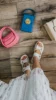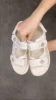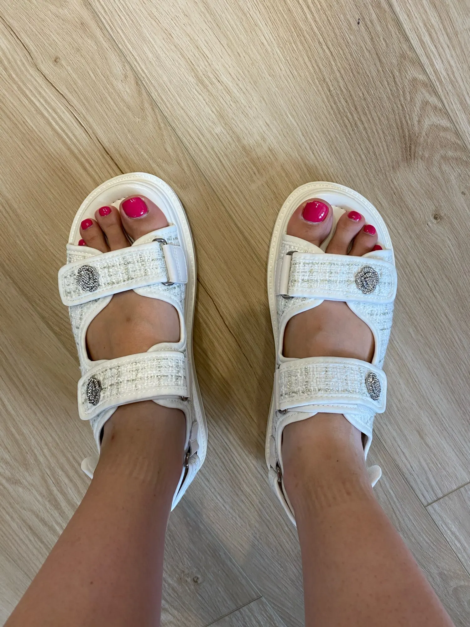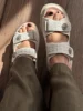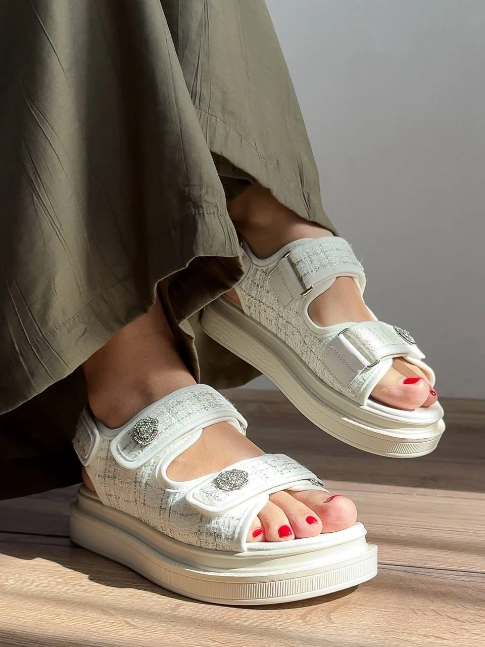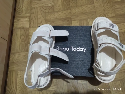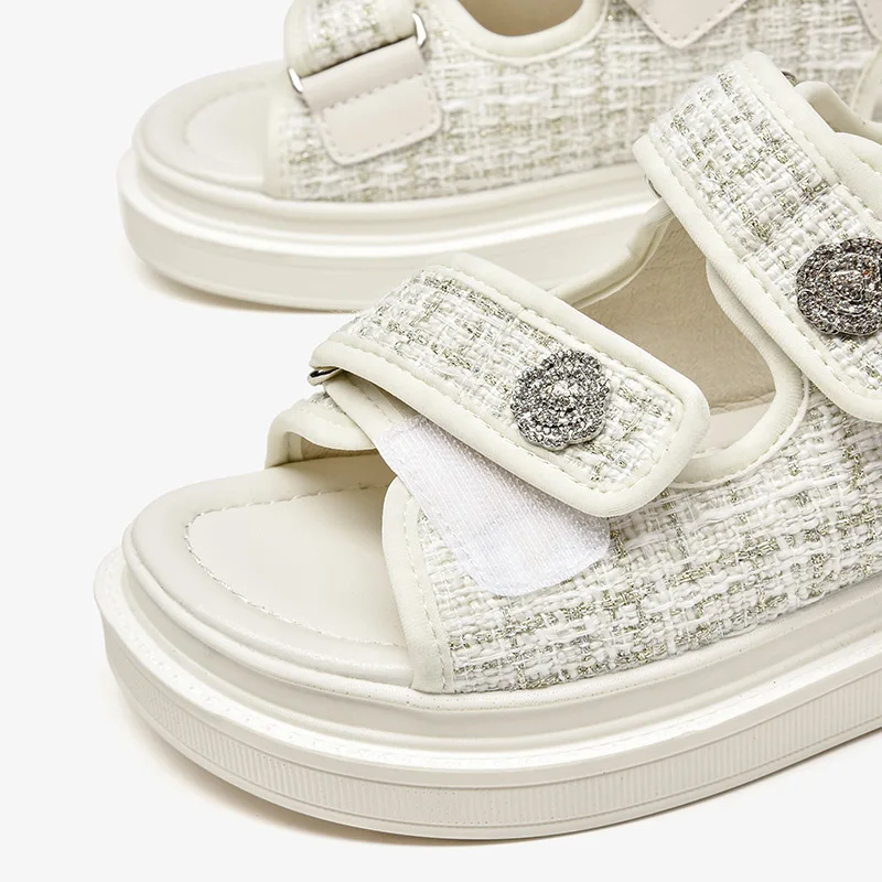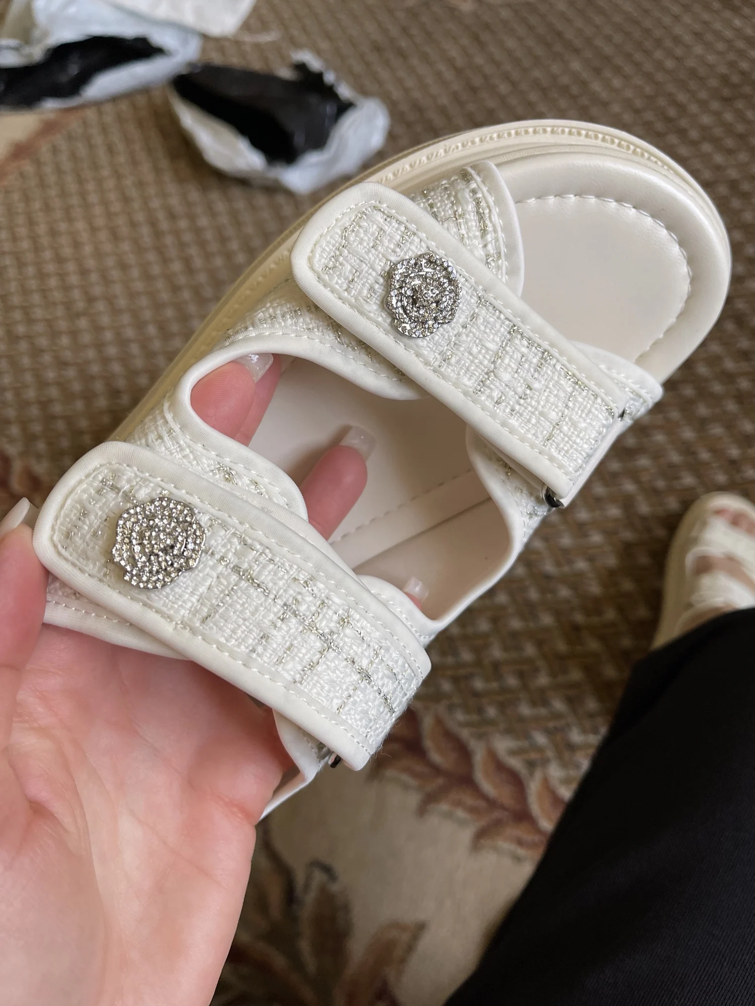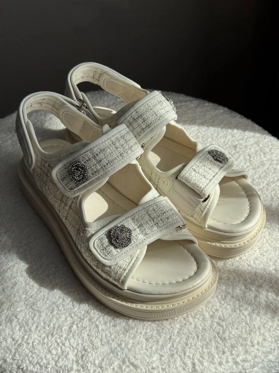 На длину стопы 22,5 см заказала сандалии в цвете beige в размере 5 (35) на свой 35 российский размер, соответственно. Комплектация: коробка, индивидуальные пыльники, полустельки. Верх выполнен из искусственной кожи и твида, подкладка и стелька - из искусственной кожи. Сандалии на ремешках-липучках, регулирующихся по объему ноги (в том числе и задник). Полиуретановая нескользящая подошва. Фурнитура в серебристом цвете. Украшены «розочками» с мелкой инкрустацией стразами. Сандалии очень удобные, мягкие, подойдут для длительных прогулок.