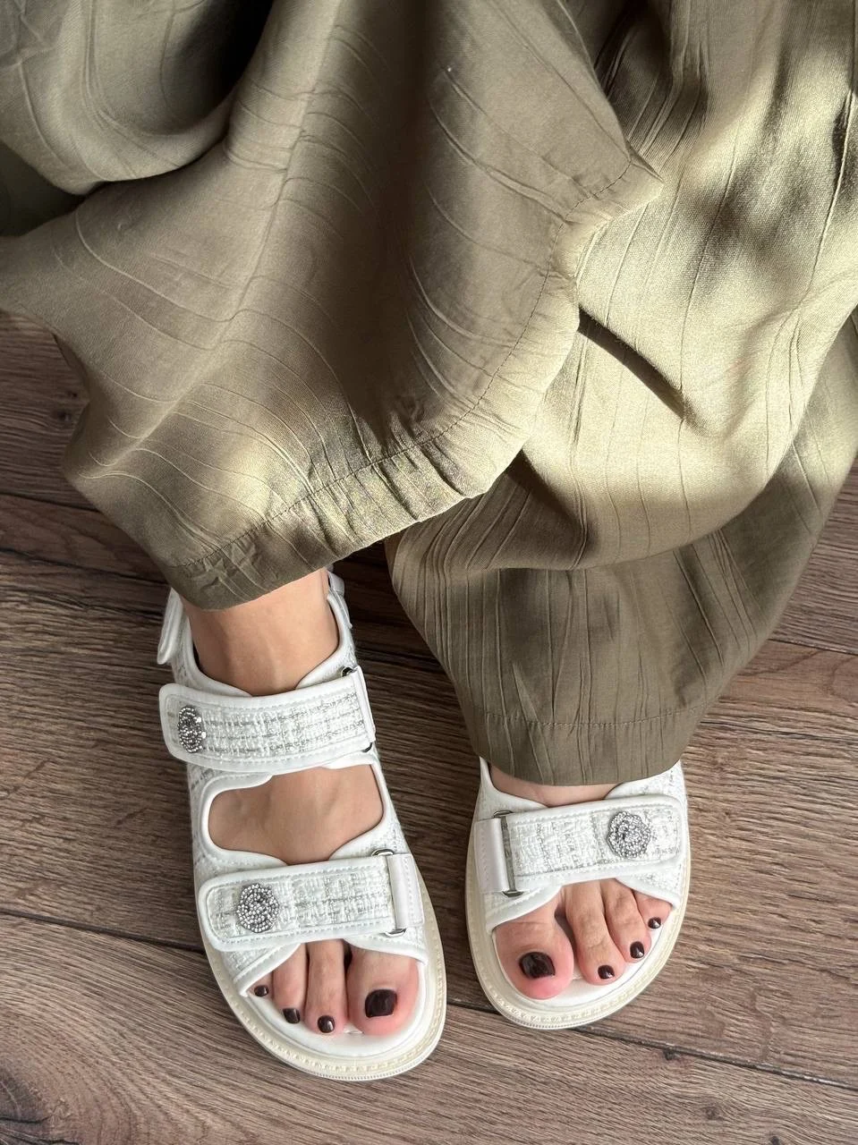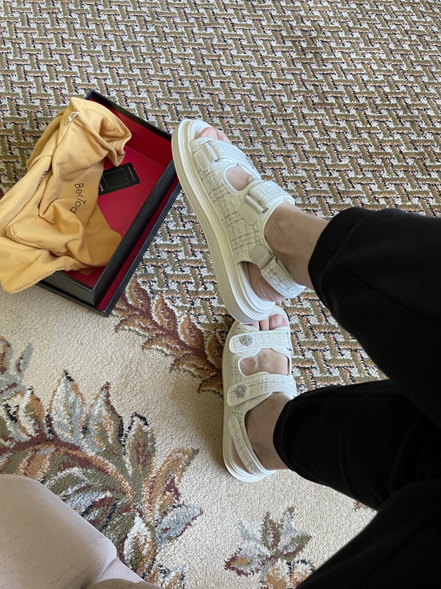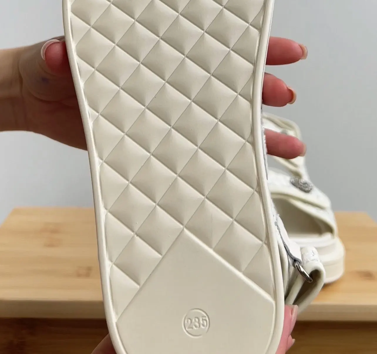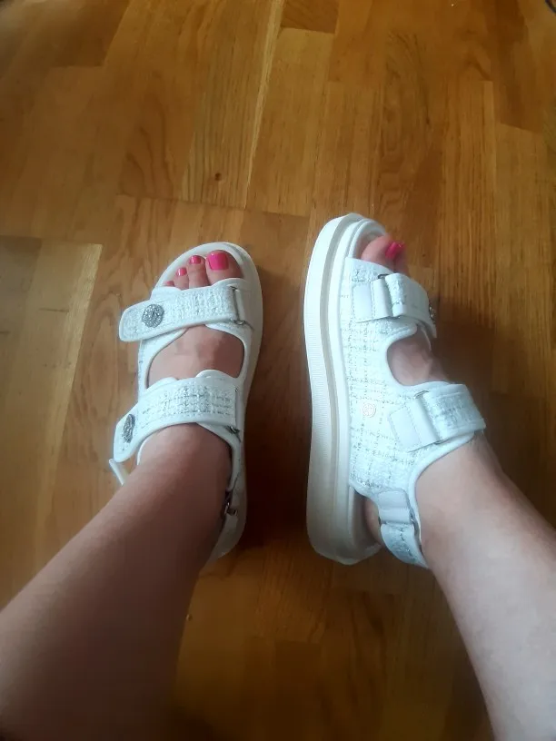 САНДАЛИИ А-ЛЯ ШАНЕЛЬ Очень классные Качественные сандалии, только посмотрите, как они были упакованы! В фирменной коробке, каждая лежала в тканевом мешочке, есть буклетами и в подарок положили полустелечку) Кайф! Очень довольна! Заказывала для сестры на стопу 23,5 см , у меня 24,7 см, но я все равно надела на себя, чтобы показать, так что не обращайте внимание на свешивающиеся пальцы или вываливающуюся пятку