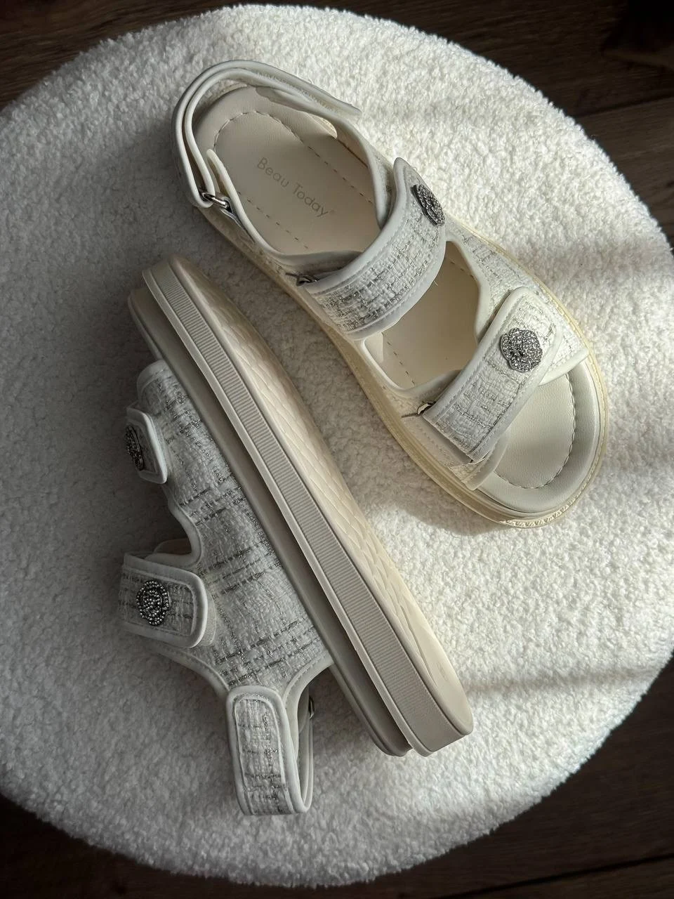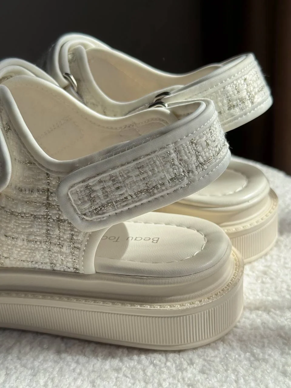 Прекрасные сандалии из твида. Выполнены в комбинации с искусственной кожей Нежные, отлично сочетаются с большим количеством летних вещей) В отпуске надевала их часто. Носить комфортно) В том числе, и на длительные расстояния. Практически не натирают На стопу 25.3 см заказала 9 размер. В магазинах обычно покупаю 40 размер. Подошли хорошо Застегиваются на липучки. Больше отзывов - Cheburyndel