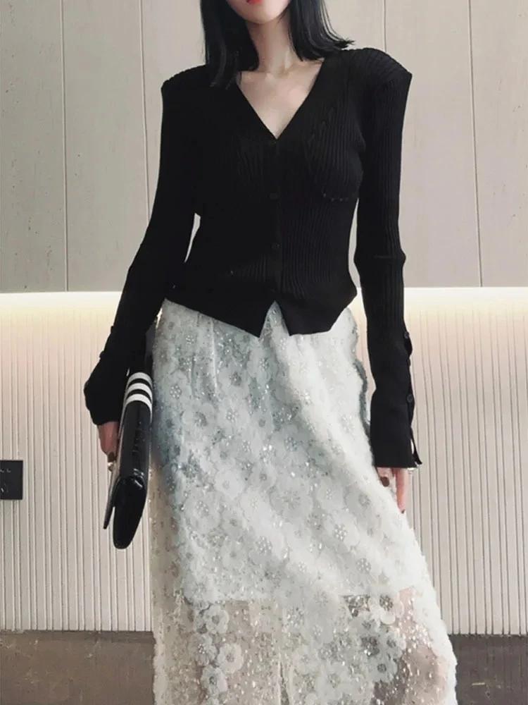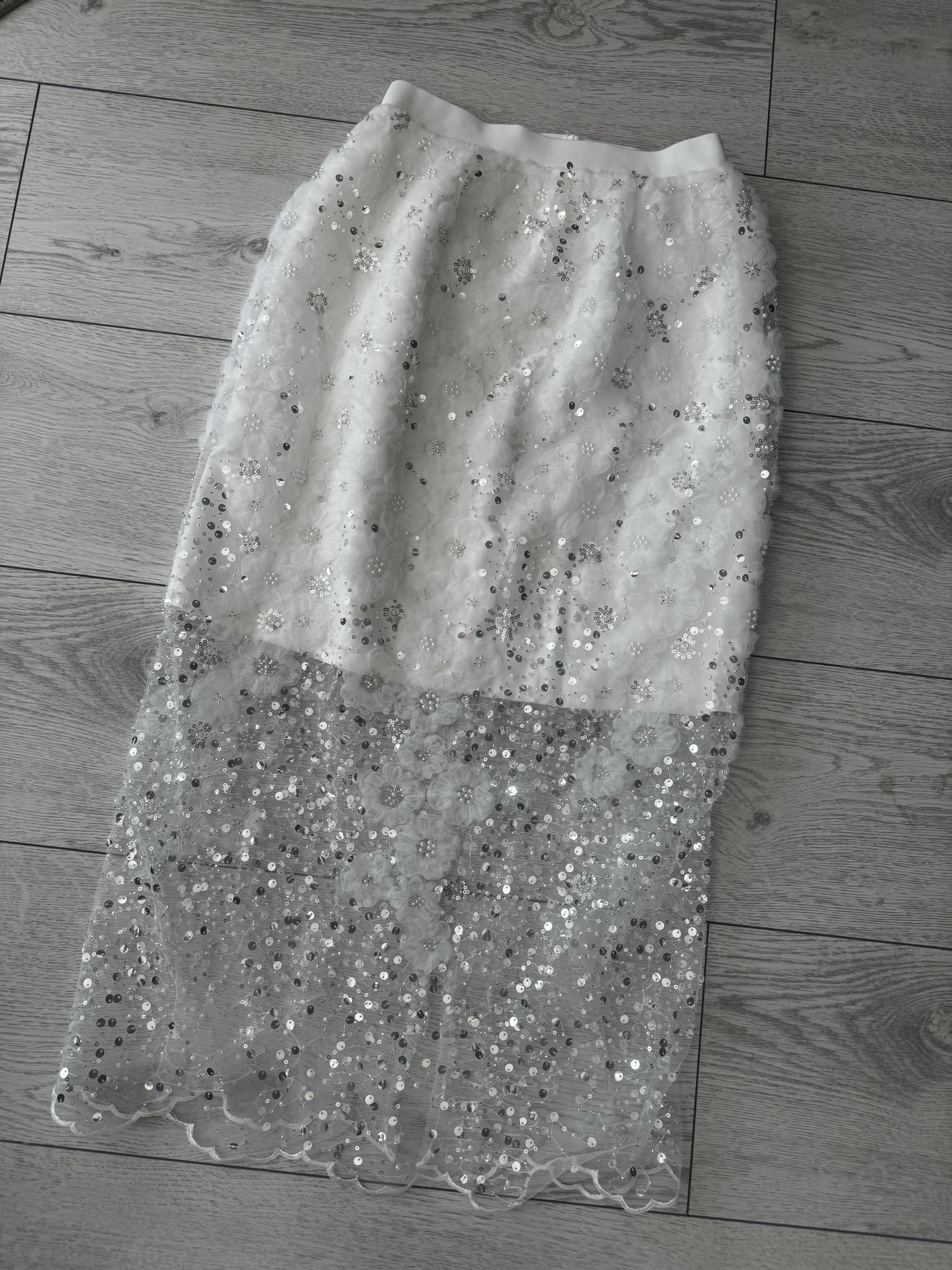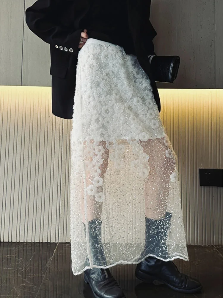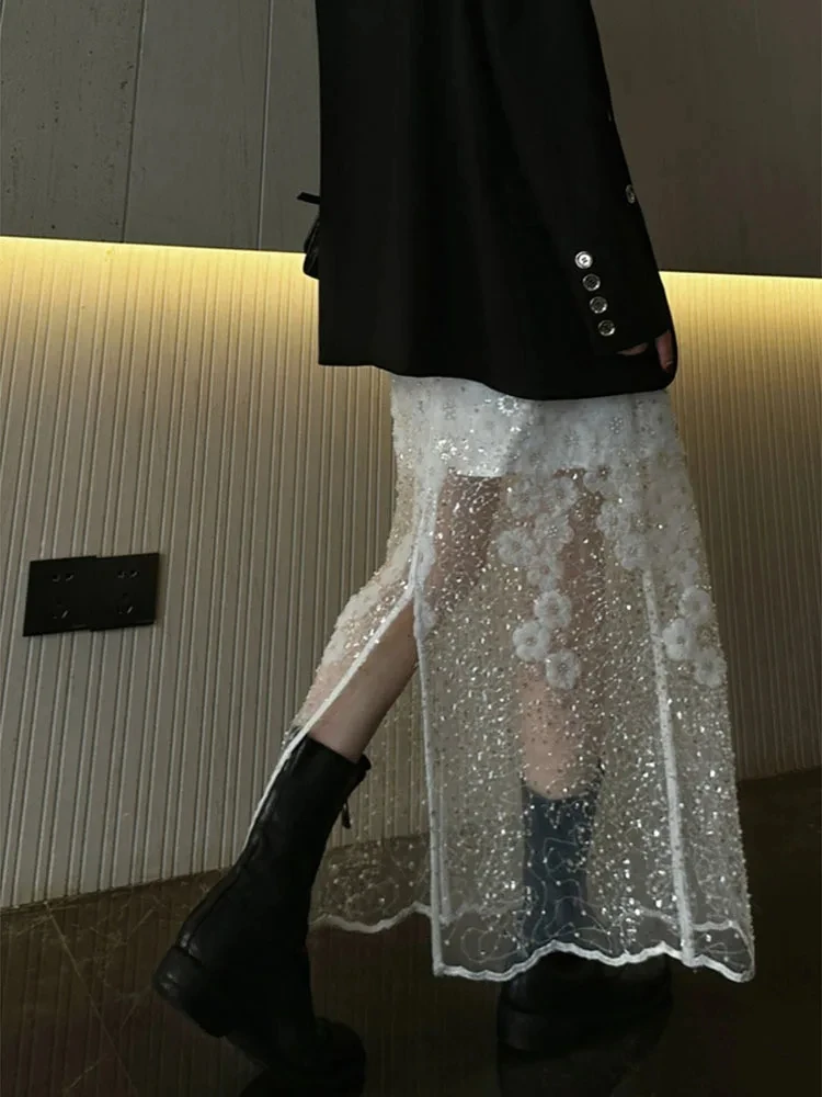 Unique White Lace Beaded Sequins High Waist Skirt Women's Trend