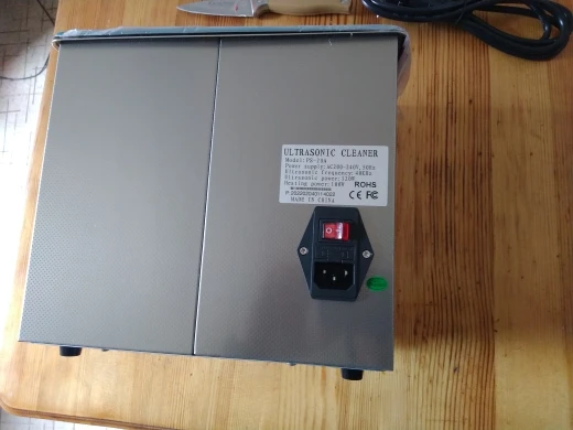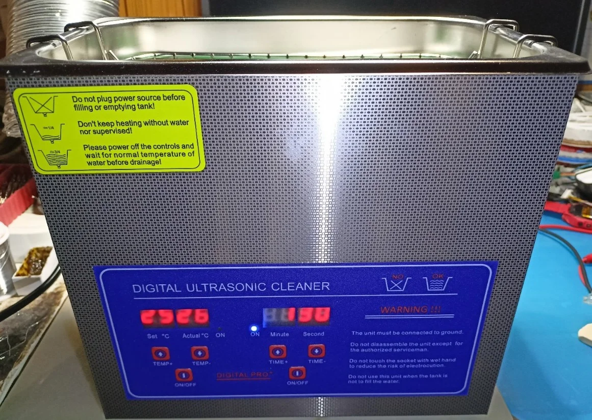 хорошая ванная, брал для мойки моделей после 3д печати. Ванна примитивная, вскрытие показало, что транзисторы просто прикручены к покрашенным радиаторам, за это минус, посадил на термопрокладки, чистит хорошо, с двух сторон стоят излучатели(вроде по 60вт) между ними нагревательный элемент, вода 50° + средство для труб неплохо очищает от въевшигося масла и грязи, ушло около 30-40 минут