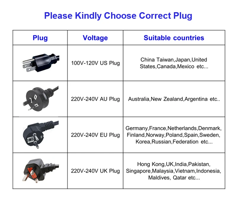 1. Обычно все продукты будут настроены под локальным напряжением по умолчанию и с вилкой по умолчанию. Если есть особые требования, заранее сообщите нужное напряжение и тип вилки. Мы не несем ответственности за проблему, вызванную неправильным напряжением или типом штекера, если нас не заметили должным образом.