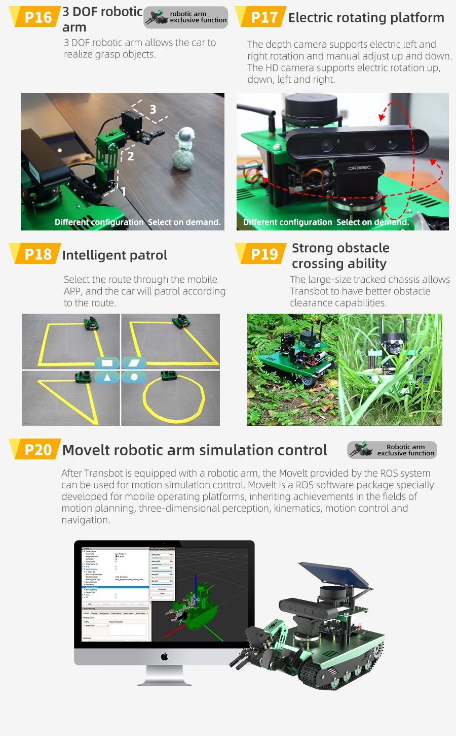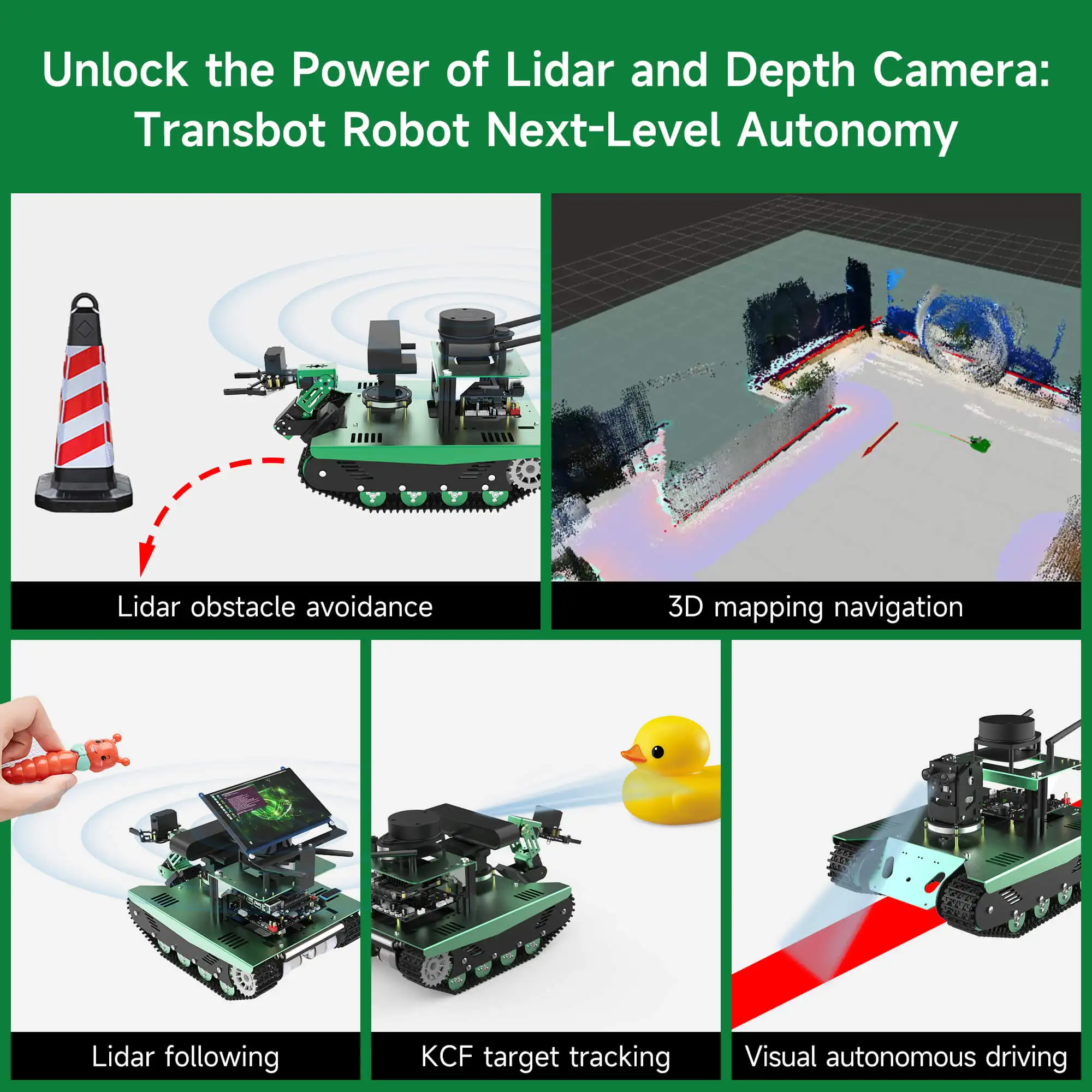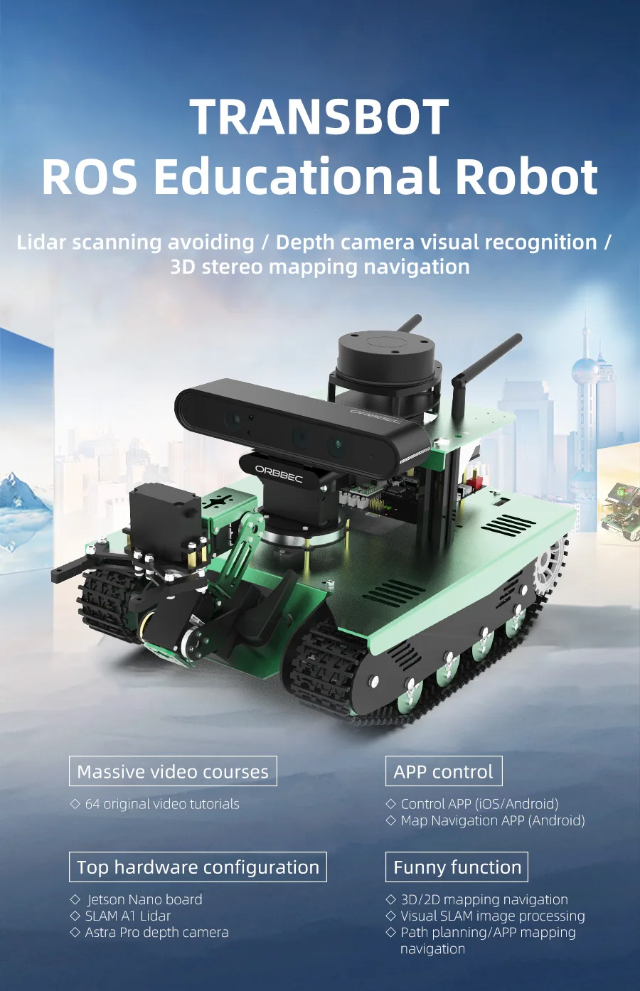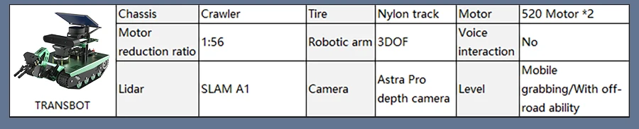 Transbot is a crawler off-road robot based on ROS(robot operating system), which is designed for ROS enthusiasts and robot players. It is equipped with high-performance hardware configurations such as Jetson NANO 4GB, Lidar, HD camera/depth camera, etc., which can realize applications such as robot motion control, remote communication, mapping navigation, following-avoiding, autopilot and robotic arm MoveIt simulation. A lot of teaching course documents and videos to help you get started with ROS easily.