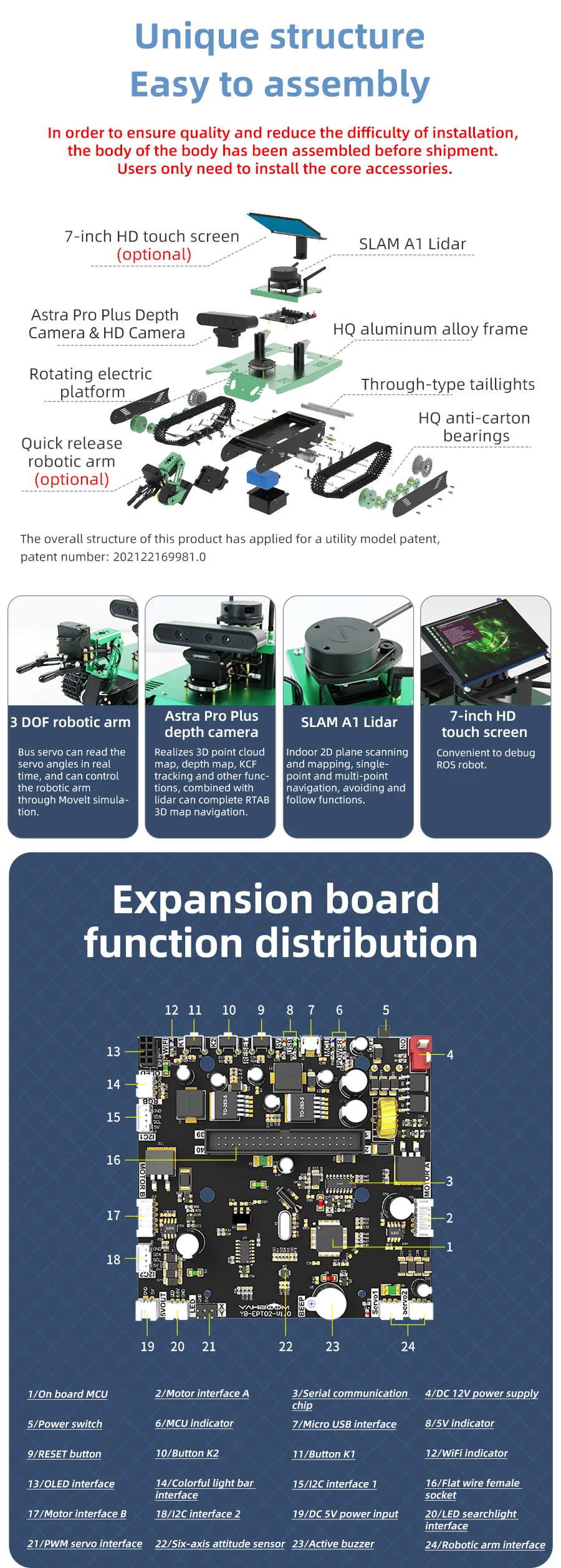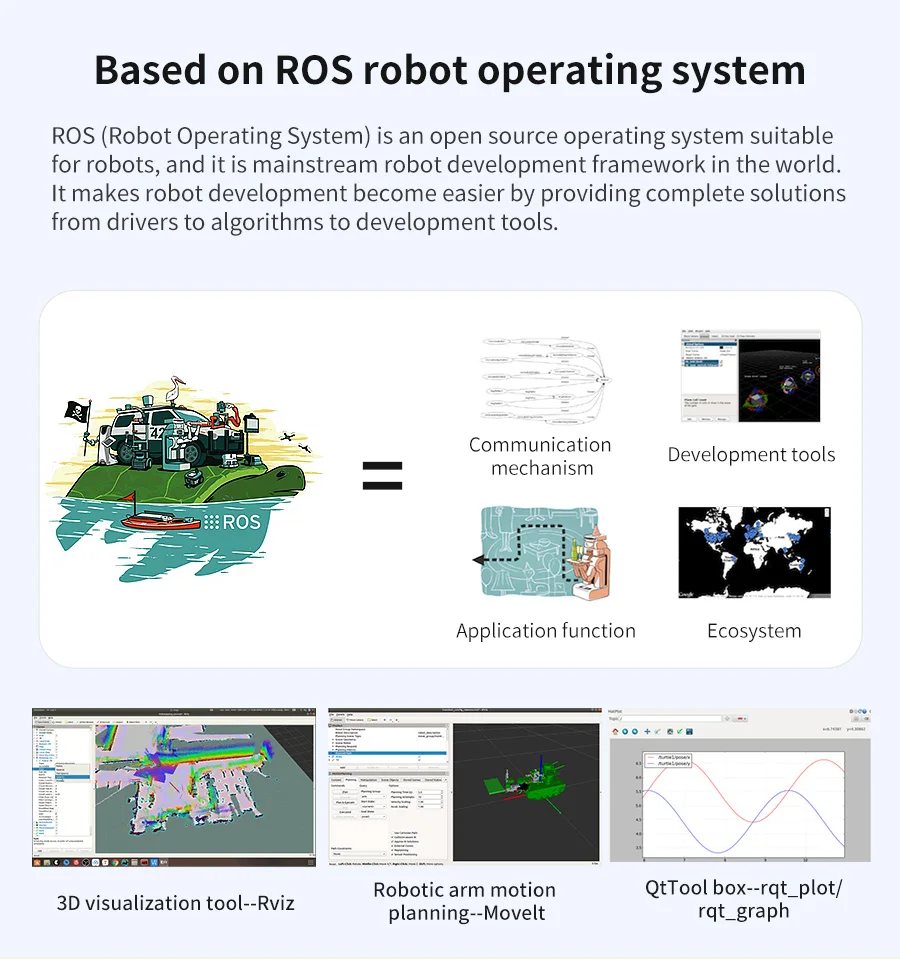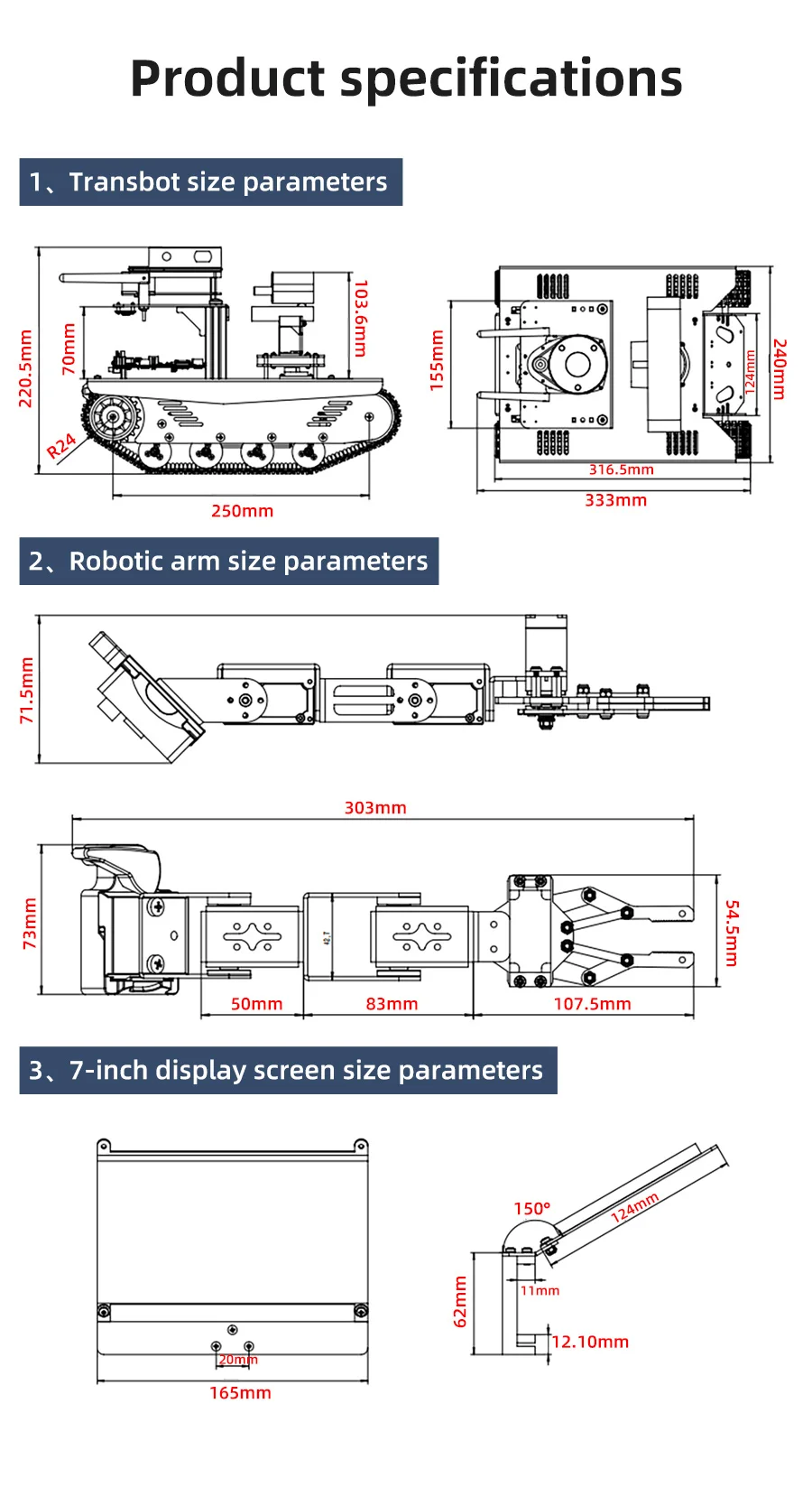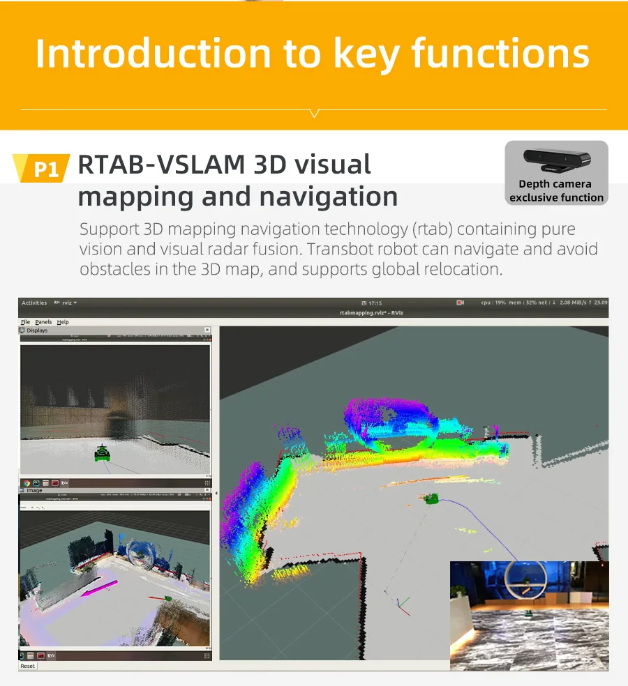 Transbot is a crawler off-road robot based on ROS(robot operating system), which is designed for ROS enthusiasts and robot players. It is equipped with high-performance hardware configurations such as Jetson NANO 4GB, Lidar, HD camera/depth camera, etc., which can realize applications such as robot motion control, remote communication, mapping navigation, following-avoiding, autopilot and robotic arm MoveIt simulation. A lot of teaching course documents and videos to help you get started with ROS easily.