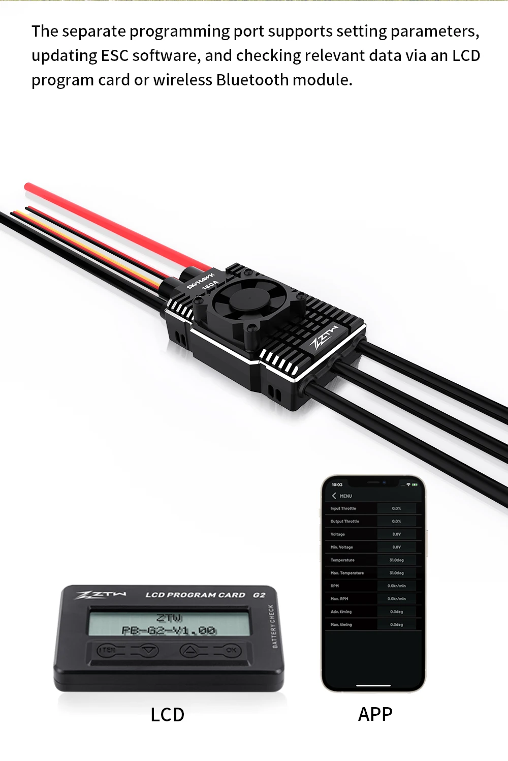 ZTW новый модернизированный 32-битный Skyhawk 130A/160A ESC можно запрограммировать через приложение для мобильного телефона или программную карту ЖК-дисплея.