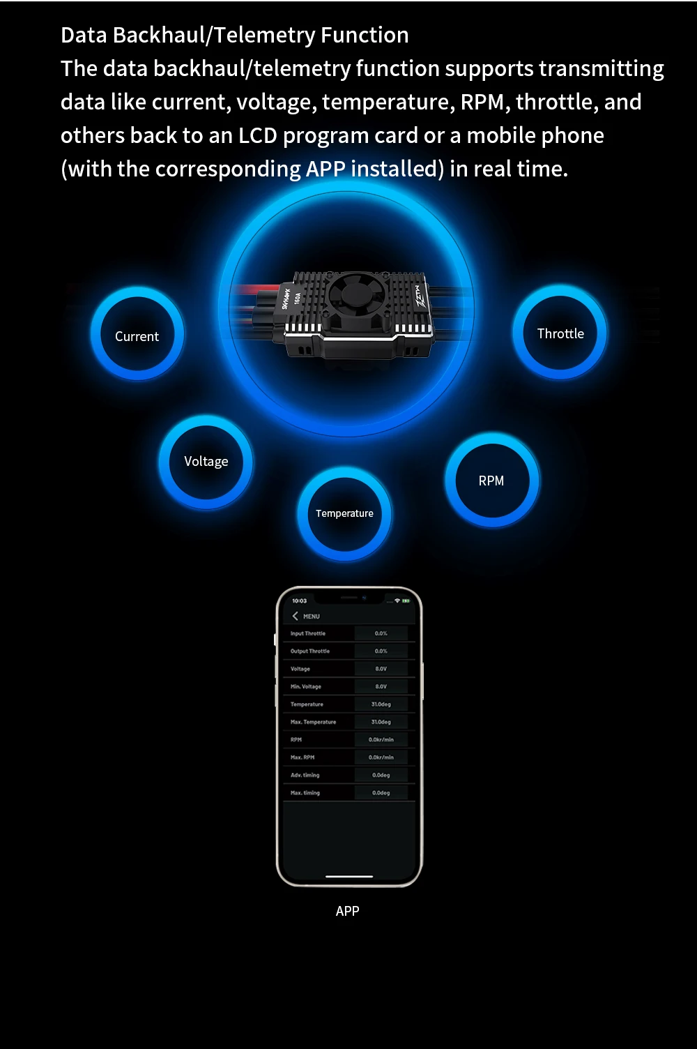 9. Поддержка функции возврата данных: ток, напряжение, температура, об/мин, дроссельная заслонка и код состояния ESC.