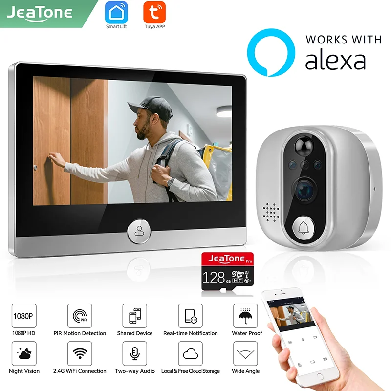 Видеоглазок Jeatone Alexa Tuya Smart WiFi 1080P/158 ° Камера дверного звонка для дома 4,3-дюймовый ЖК-экран 24H PIR Обнаружение движения Глаз