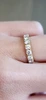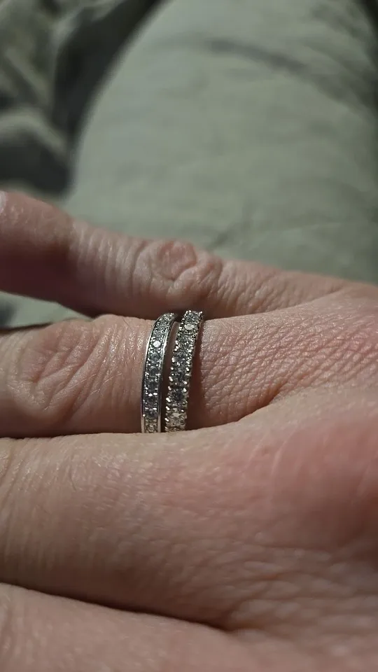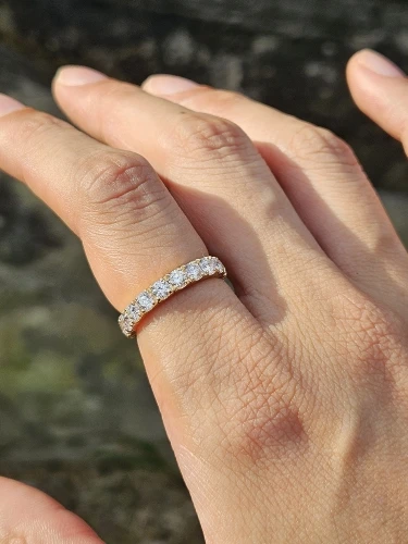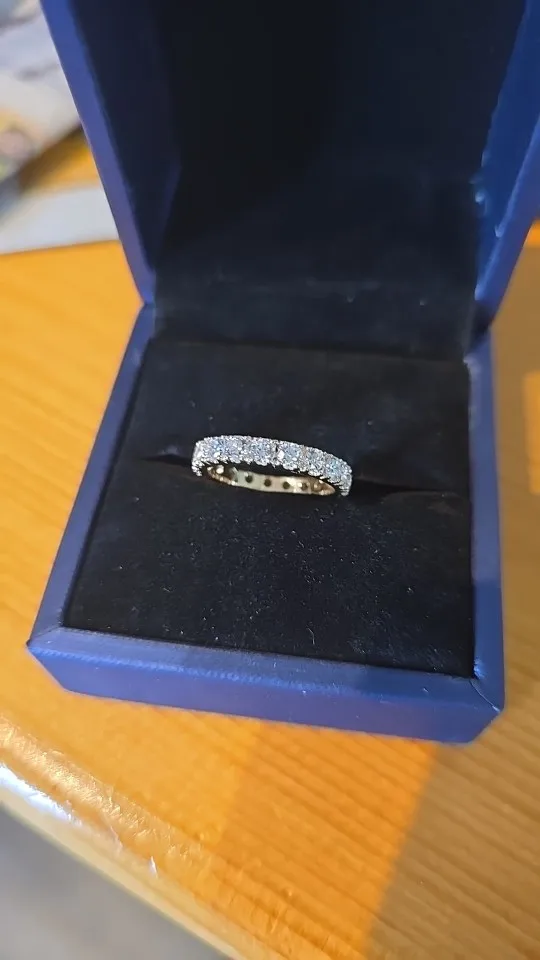 красивое и очень качественно сделанное кольцо вечности. Я купил его по 0,1 карата на бриллиант, а бриллианты около 3,1 мм. ширина кольца около 3,3 мм. бриллианты определенно выглядят немного больше, чем другие мои бриллиантовые кольца диаметром 3 мм, но я не злюсь на это 🙂