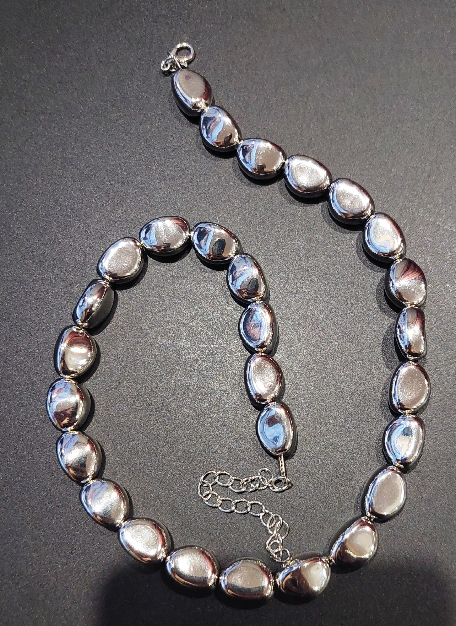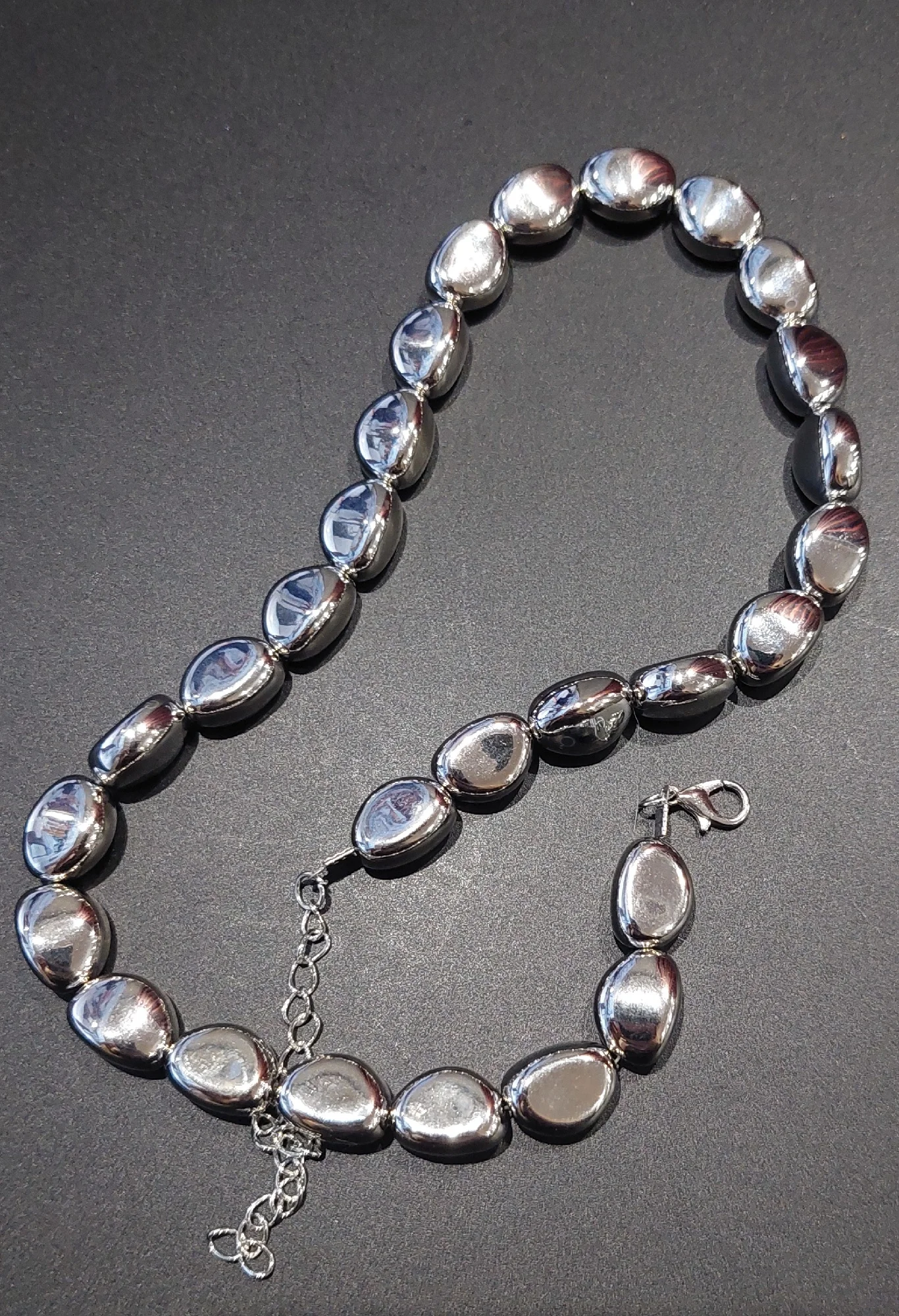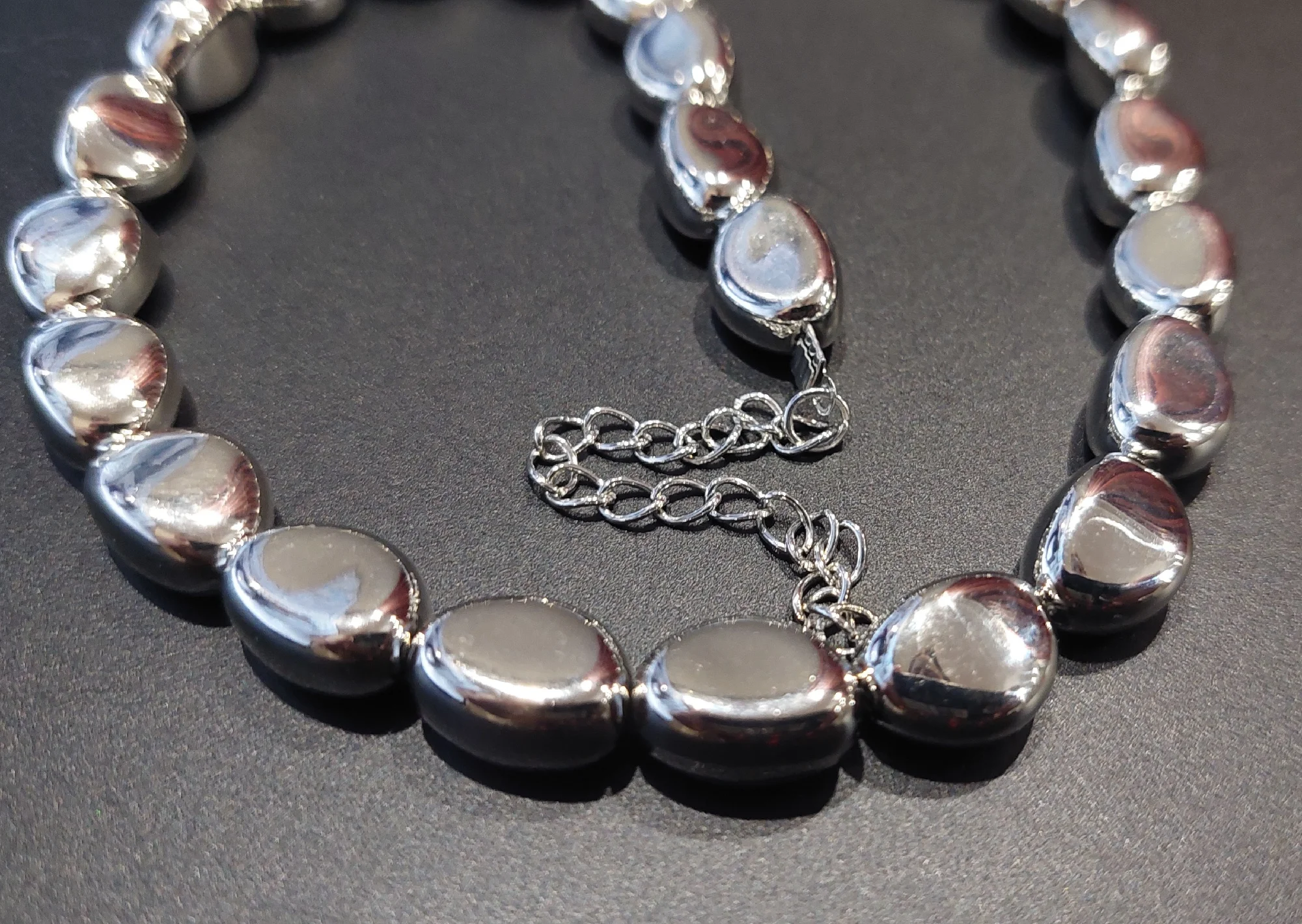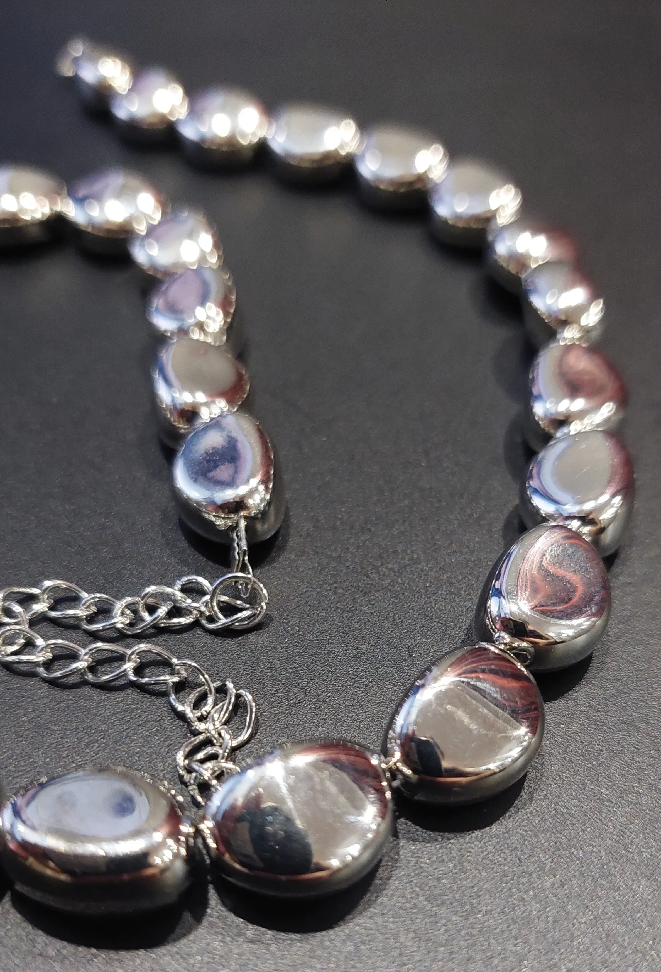 Пластиковые бусы, лёгкие, покрытие блестящее. Длина небольшая под самую шею, как чокер. Сзади удлиняющая цепочка, при помощи её можно немного регулировать длину, что бы не душила.
