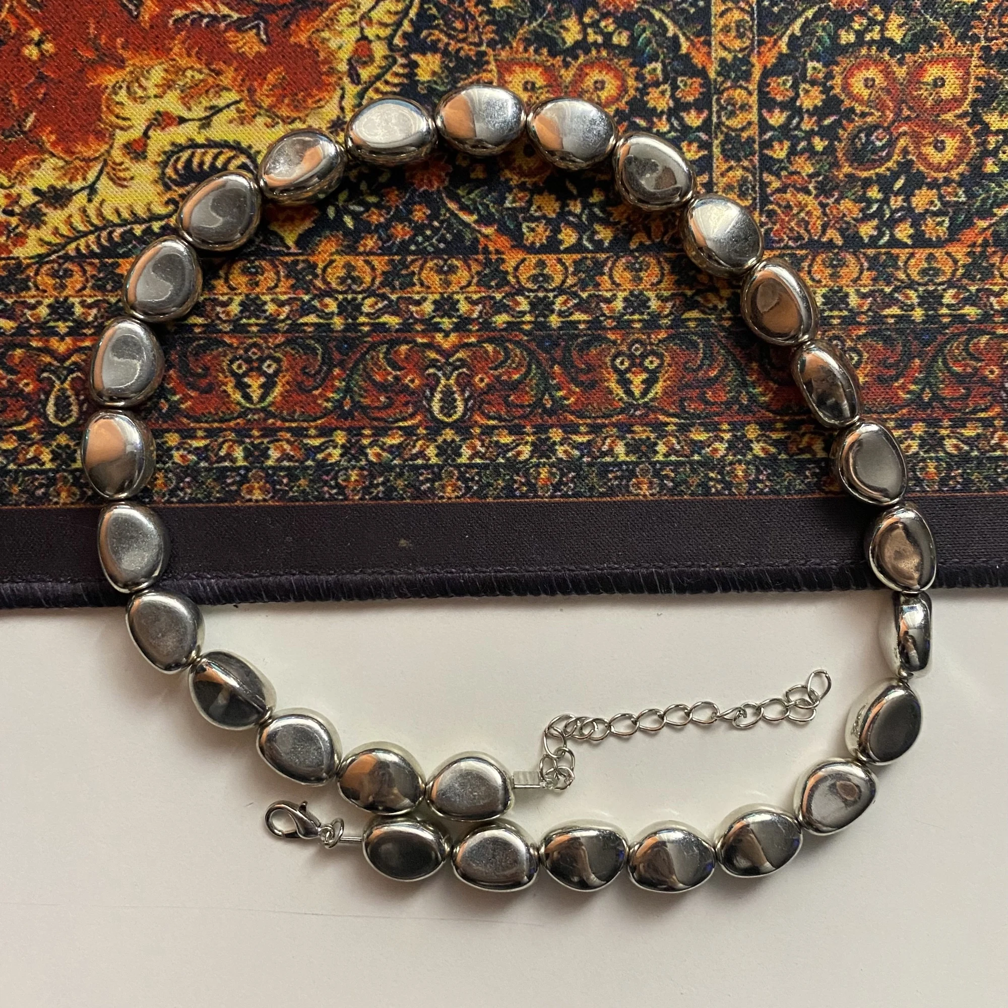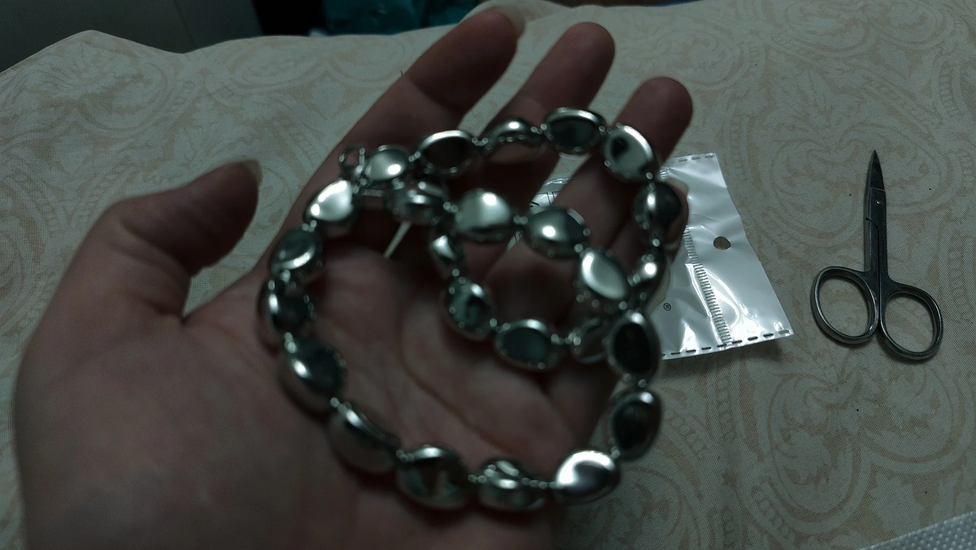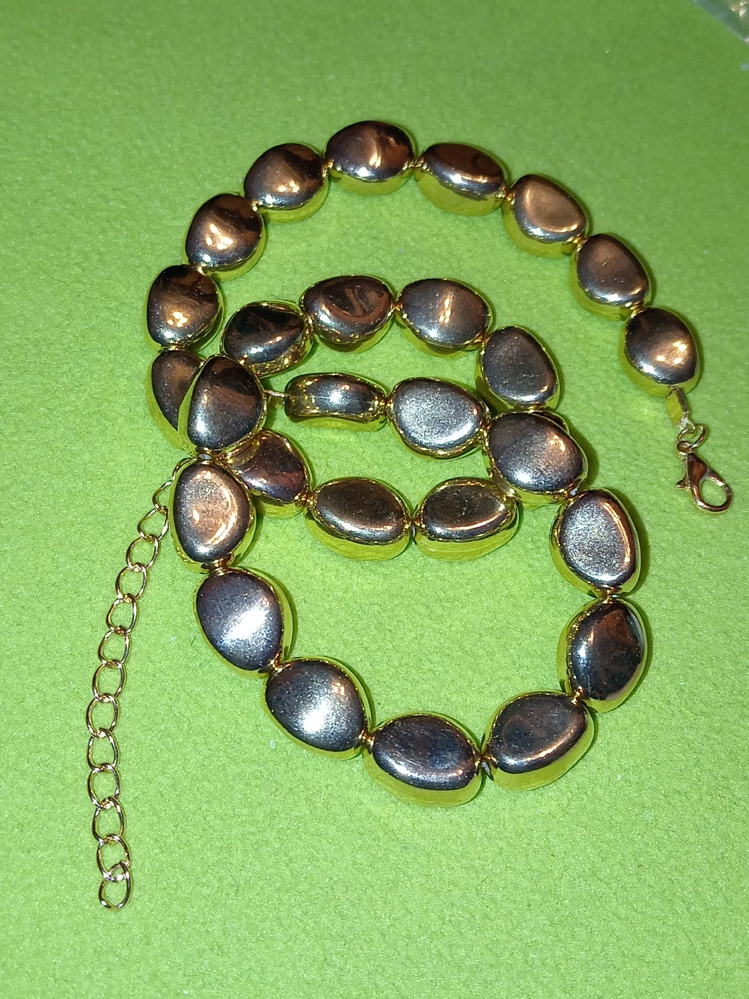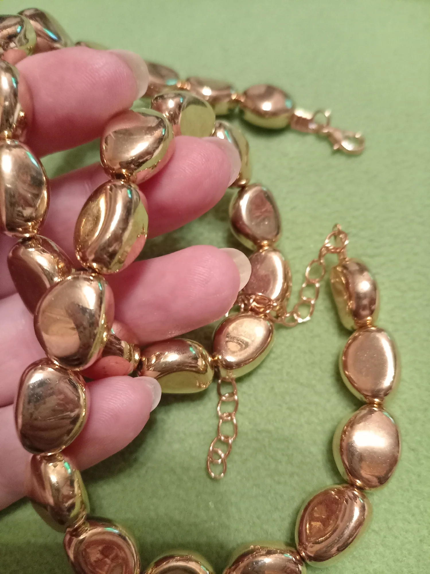 Смотрится более дёшево, чем на фото. По качеству лёгкий пластик, думаю напыление быстро сотрётся. Камни мельче чем кажется на фото. Ожерелье не длинное, скорее пойдет как чёкер Даю твердую 4