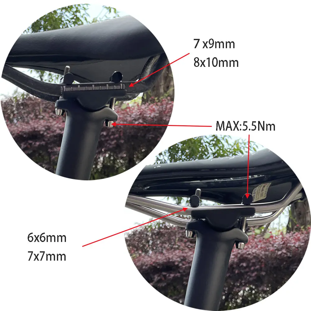 Мы рекомендуем поместить Подседельный штырь в нижнюю часть рамы 100 мм, а затем затянуть крепежные болты зажима подседельной трубы. Характеристики крутящего момента: хомут подседельного штыря определяется производителем рамы/хомутом подседельного штыря (Рекомендуемый крутящий момент блокировки 5,5 нм)