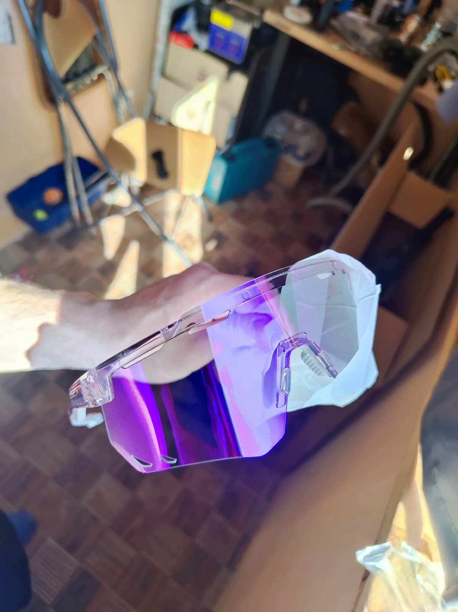 доставили за 19 дней. очки очень комфортные , не спадывают и в них очень удобно бегать. также хорощо отражают и в них почти не видны глаза. в комплекте шла прозрачная оправа чтобы вставить линзы для плоховидящих и это крутая тема.