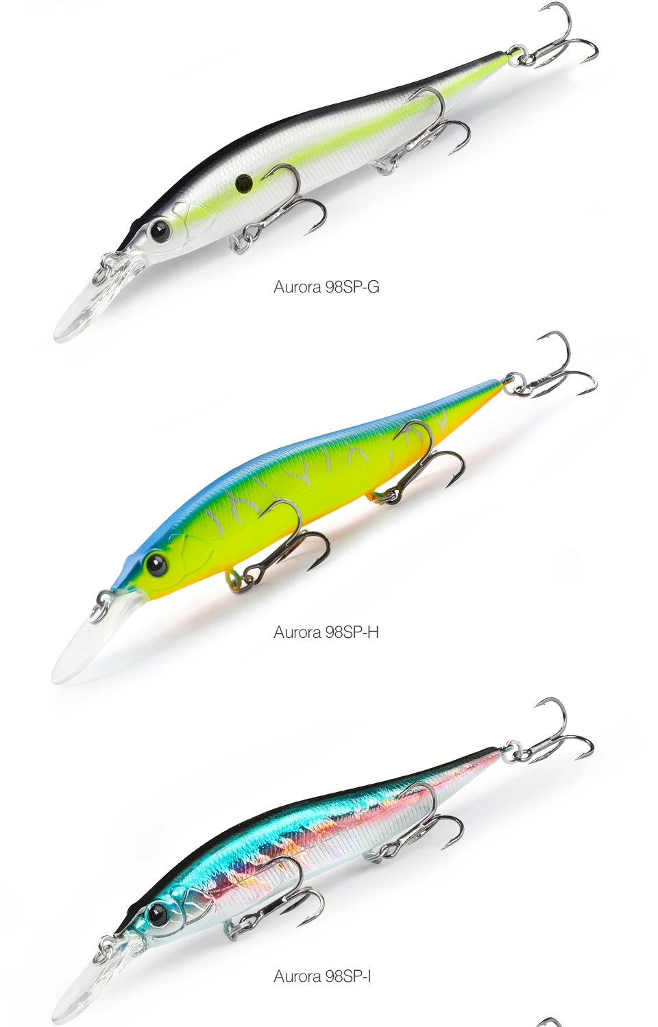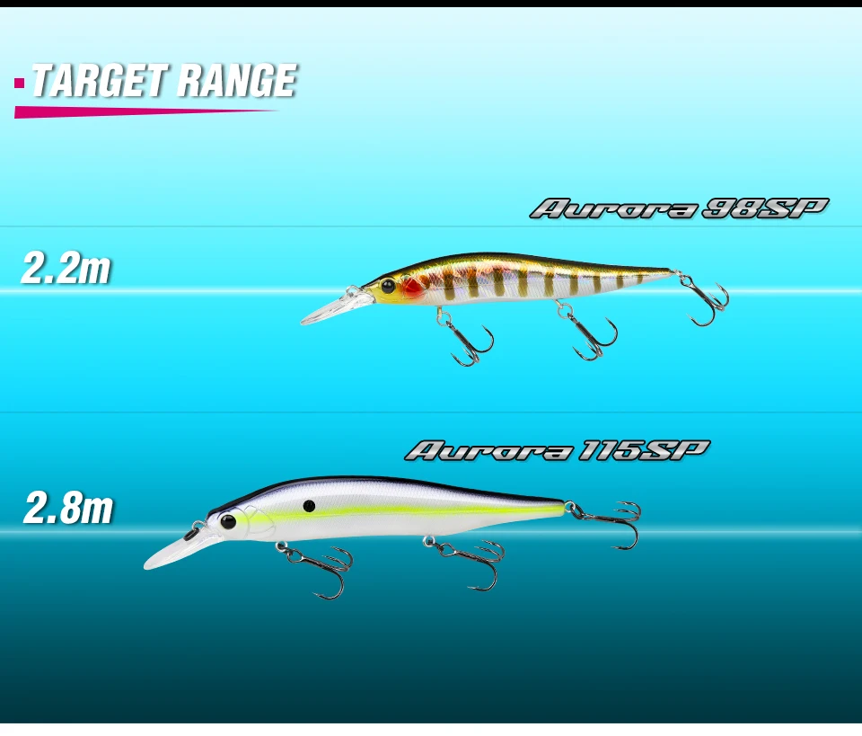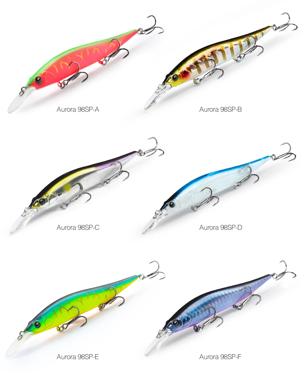 высокое качество, расцветка L- двуцветная (кислота) для пасмурной погоды, мутной воды, G- натуральная расцветка для солнечной погоды. Заглубление соответствует заявленному 2.2м, зависает в толще воды, наклон приманки 30-40градусов. При твиче двигается резко по сторонам, на равномерной проводке имеет высокочастотную игру, в меру шумный. Ловил им с лодку, закидывал к берегу поперёк течения, сильные одиночные или двойные удары с небольшой паузой. При проводке имеет достаточно сильное сопротивление, спиннинг до 21 грамма справляется. Рекомендую данную модель воблера от TSU. Добавлю, vision one teen 110 более шумный игра схоже, но Aurora 98 более резвый.