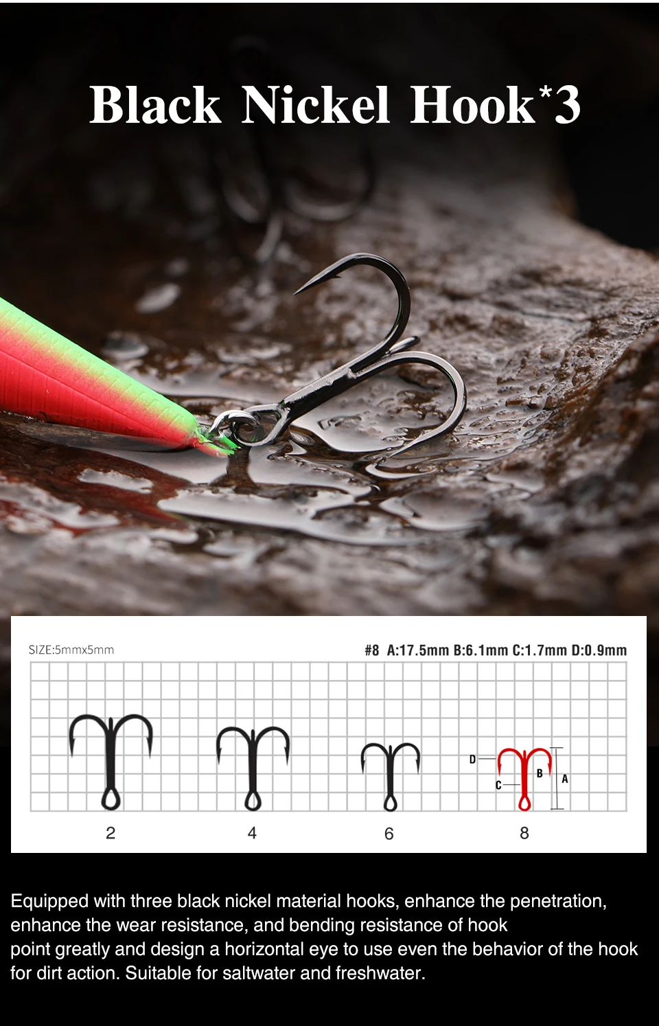 Оснащен тремя крючками из черного никелевого материала, что значительно повышает проникновение, износостойкость и устойчивость к изгибу, а также имеет горизонтальное ушко для использования. Подходит для морской и пресной воды.