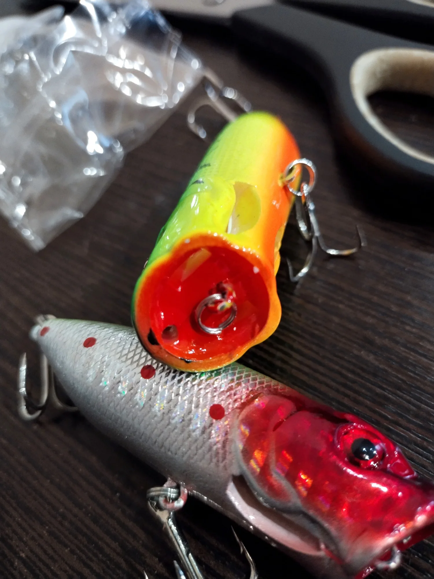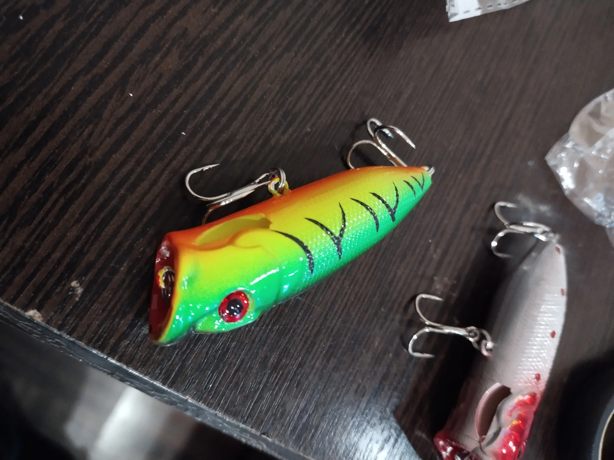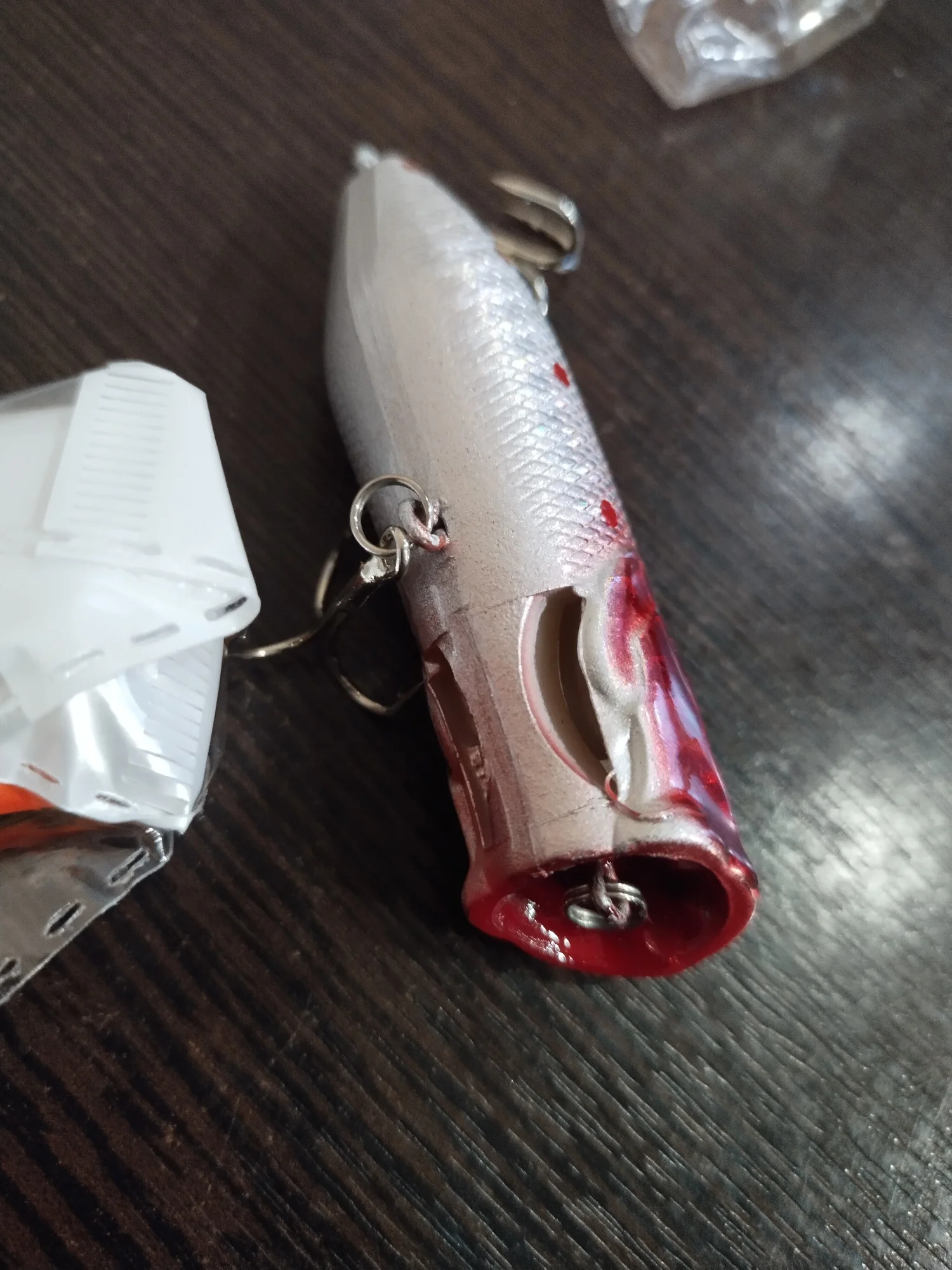 Доставка в Минск - 3 недели, упаковка - обычный пупырчатый пакет Объединенный заказ (были еще и попперы и блесны) прибыл в целости и сохранности, поппер сделан качественно, но, как и у всех воблеров и попперов, необходимо обязательно проклеивать петли (независимо от бренда), я еще дополнительно покрываю слоем бесцветного лака, вес соответствует, осталось проверить в деле. Продавцу - спасибо!