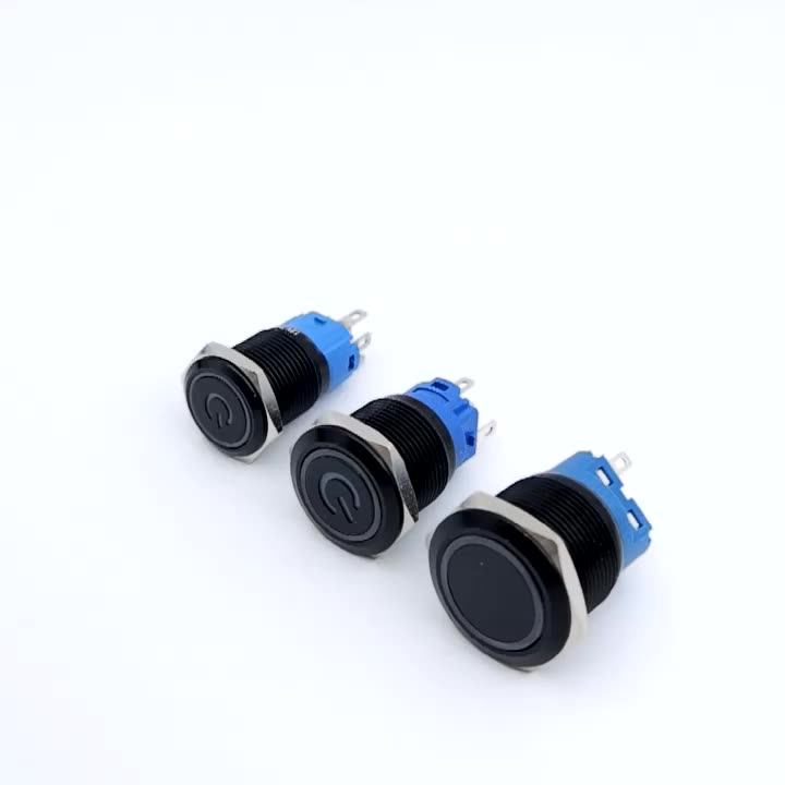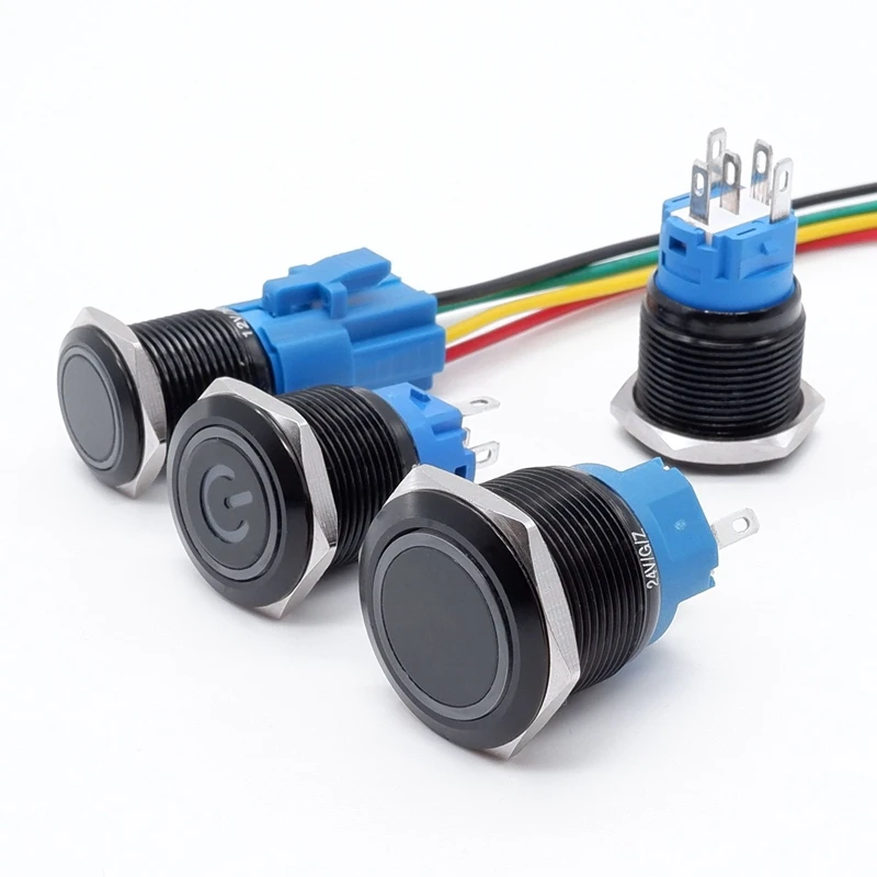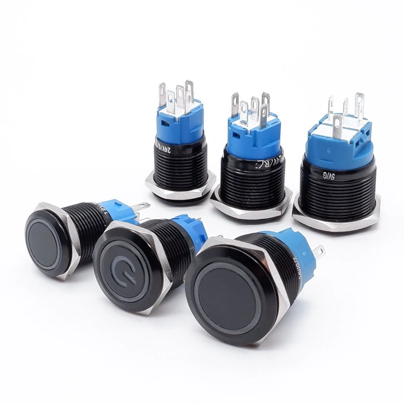 Черный кнопочный переключатель, светодиодный светильник 16/19/22 мм, водонепроницаемый, с подсветкой, металлическая, плоская фиксация, мгновенного действия, с индикатором питания 5 В, 12 В, 220 В