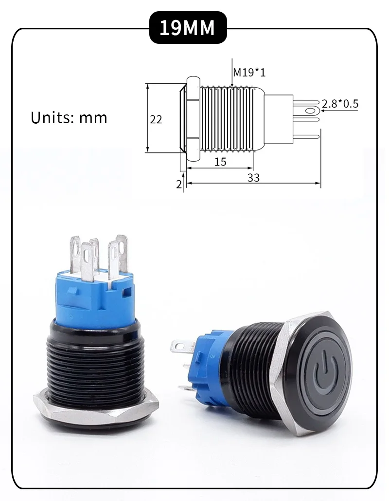 Черный кнопочный переключатель, светодиодный светильник 16/19/22 мм,...