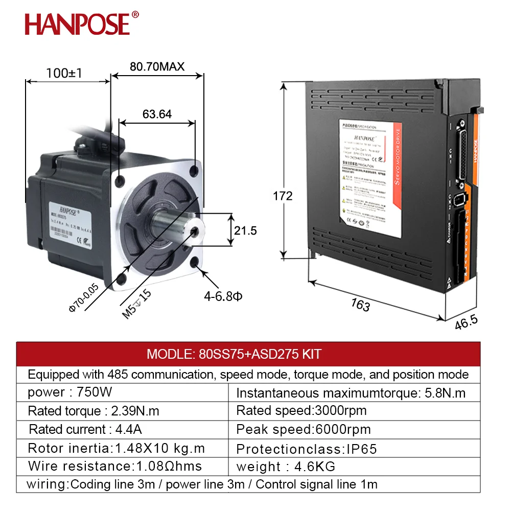 750W AC Servo Motor Kit 80SS75 5.0A 2.39N.m And ASD275 Servo Drive...