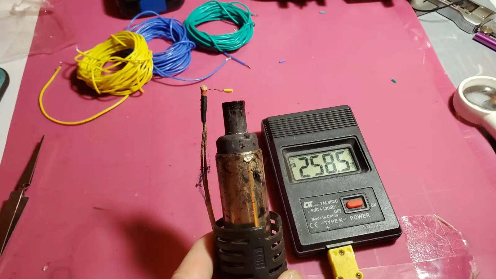 AWG24 (0.2мм2), синий, зелёный, жёлтый. Жилки не считал, но их там много, за счёт этого провод мягкий. Не магнитится. На соскобе видно желтизну, значит скоее всего медь. На фотах сопротивления пятиметровых кусочков (измерил, на самом деле продавец отмотал чуть с запасом). Видно что небольшие различия есть, но все в пределах нормы Так же на фото кусочек изоляции, надет на термощуп, а значит снаружи ещё горячее. После остывания изоляция остаётся всё такой же эластичной, без малейших внешних изменений. В морозилке провода так же сохраняют свою эластичность. Единственный минус всех силиконовых проводов, это их излишняя гибкость, скользкость, и вертлявость, и соответсвенно запутываемость :-) Но это лучше чем деревянный провод на морозе.oleg o. 6 апреля 2025