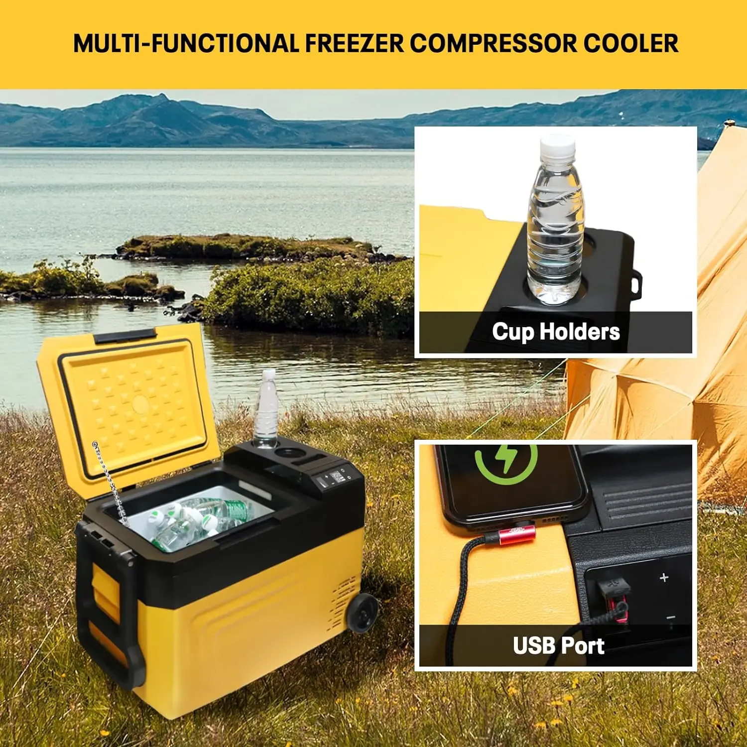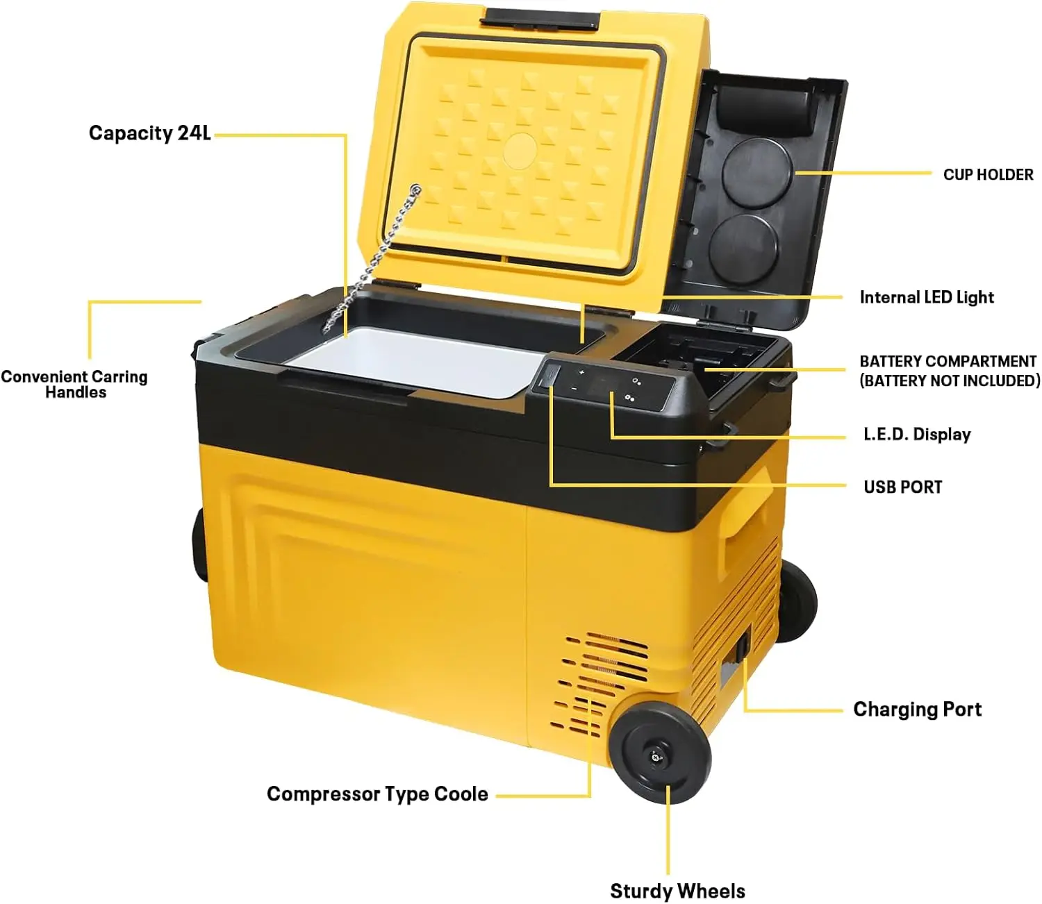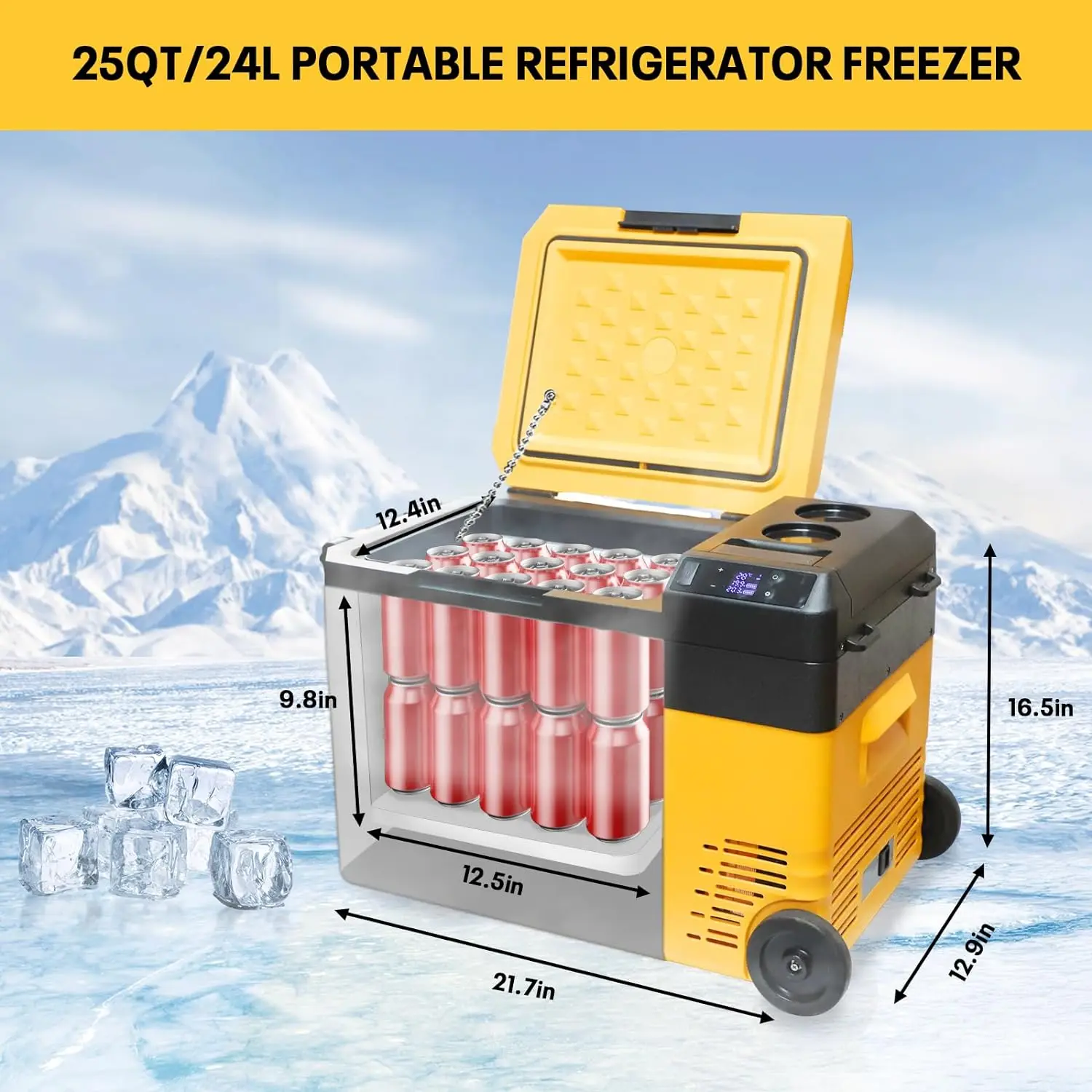 Большая емкость и компактность Морозильная камера большой емкости 24 л (25 литров) с внутренними размерами 12,5*9,8*11,8 дюйма, вмещает до 44 банок по 330 мл колы, 22 бутылки воды по 550 мл или 16 бутылок вина по 750 мл. позволяет хранить разнообразные продукты, сохраняя при этом свежесть.Весит всего 26 фунтов.и встроенные ручки с обеих сторон для удобства переноски и снятия.