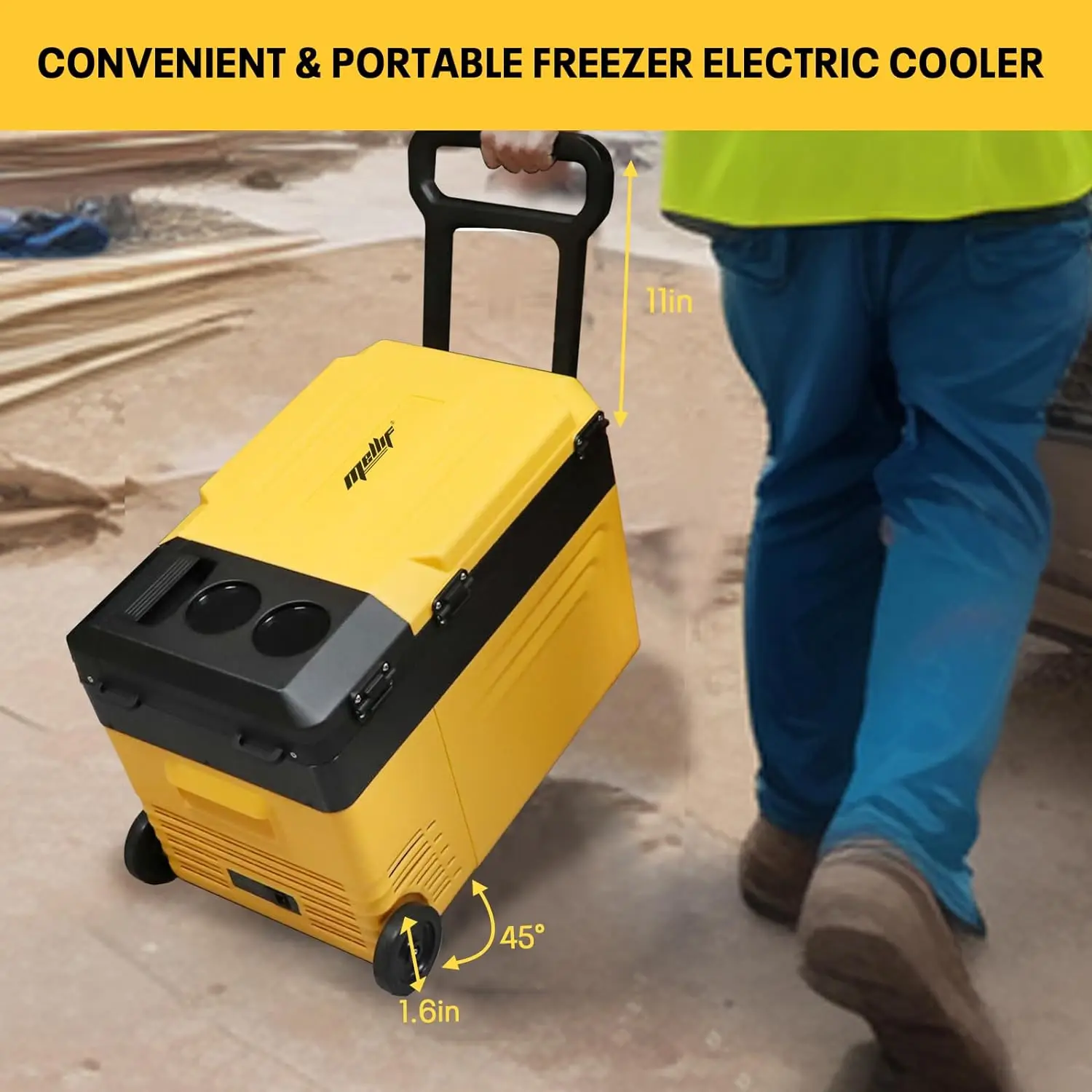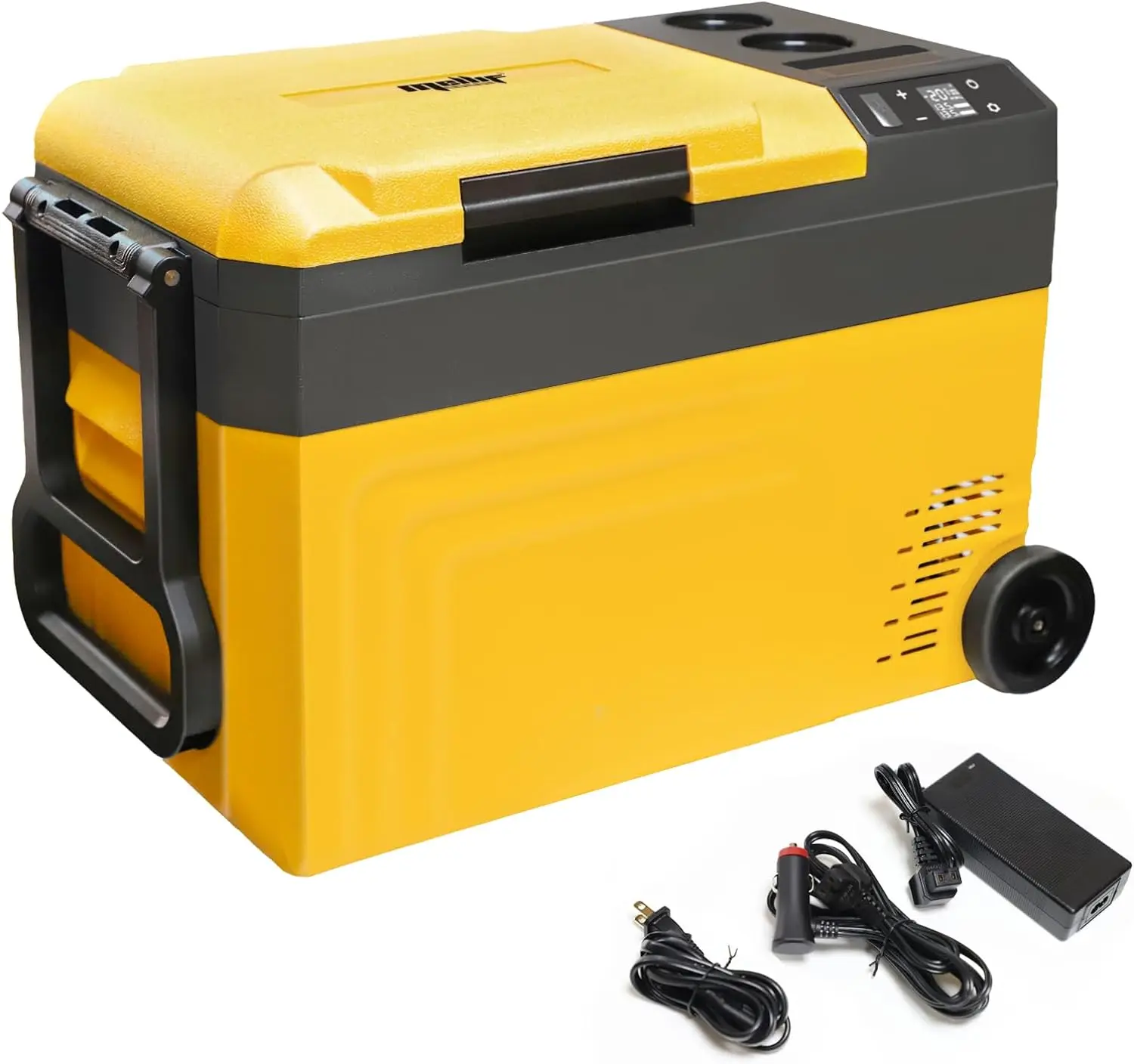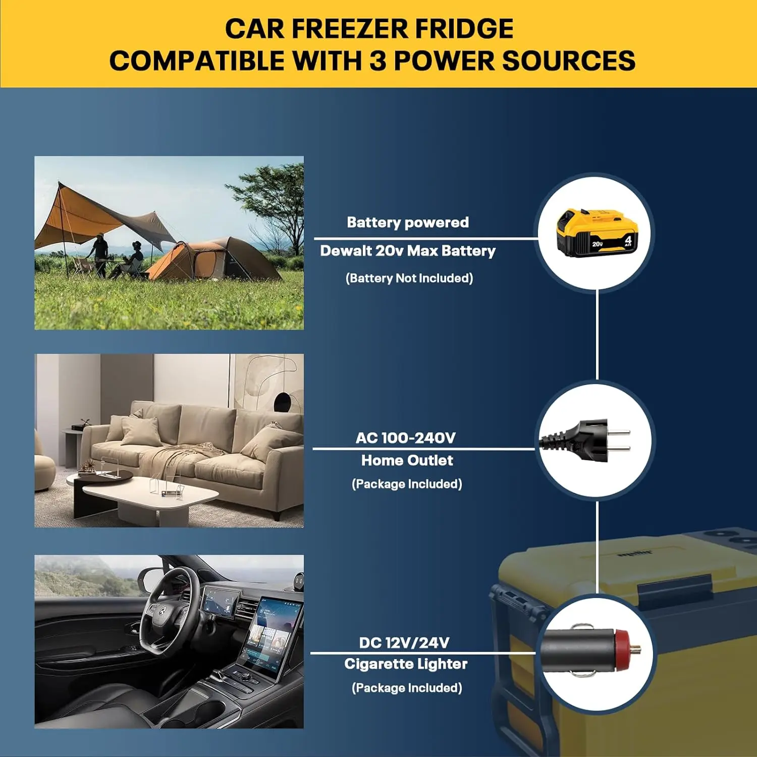 3-сторонний источник питания Портативный холодильник Mellif. Совместим с аккумуляторами Dewalt 18 В 20 В MAX, идеально подходит для активного отдыха (батарея в комплект не входит), а также оснащен адаптерами переменного тока 110/240 В и 12/24 В постоянного тока, поэтому вы можете использовать его дома, в машине или на открытом воздухе.