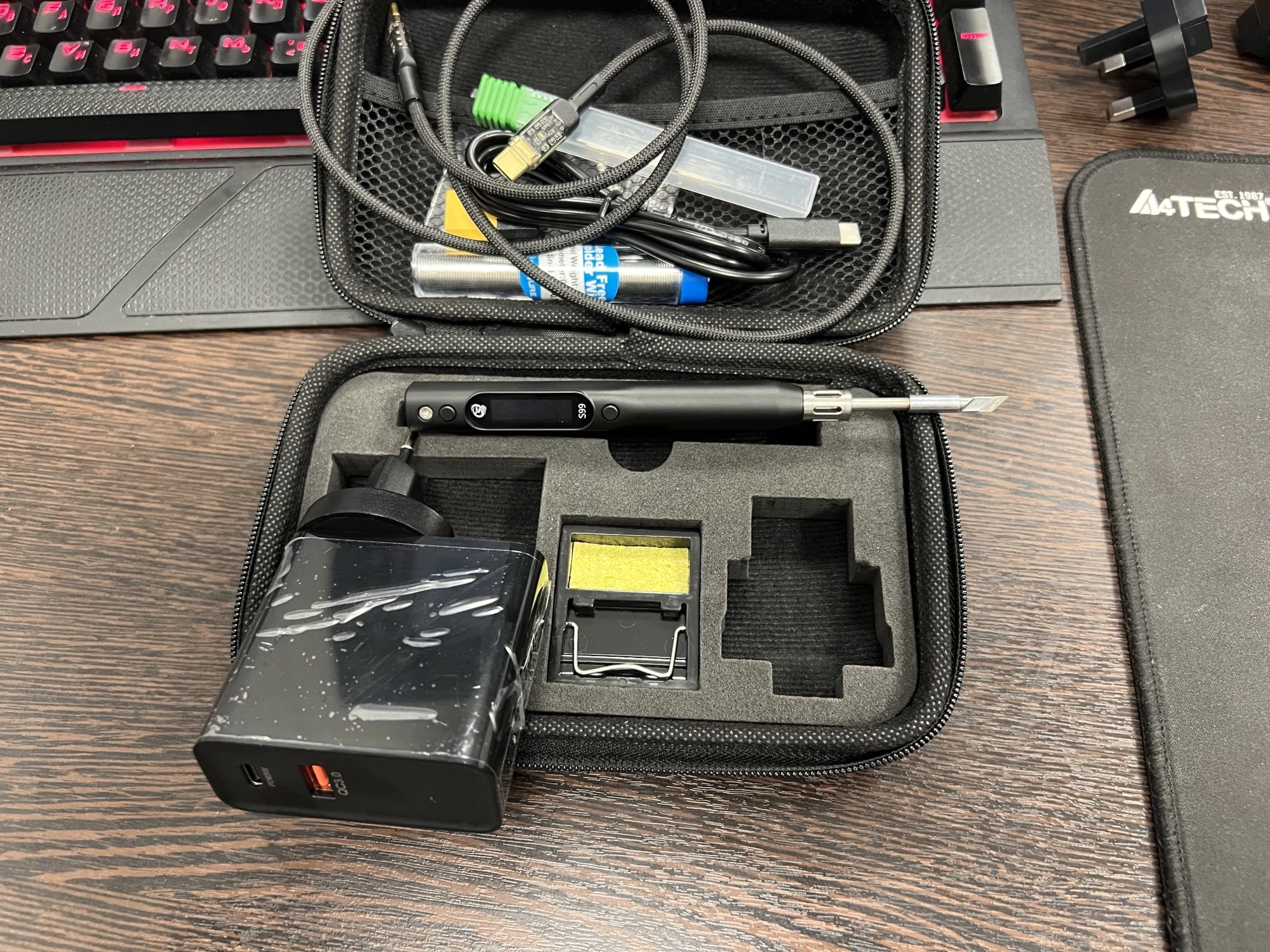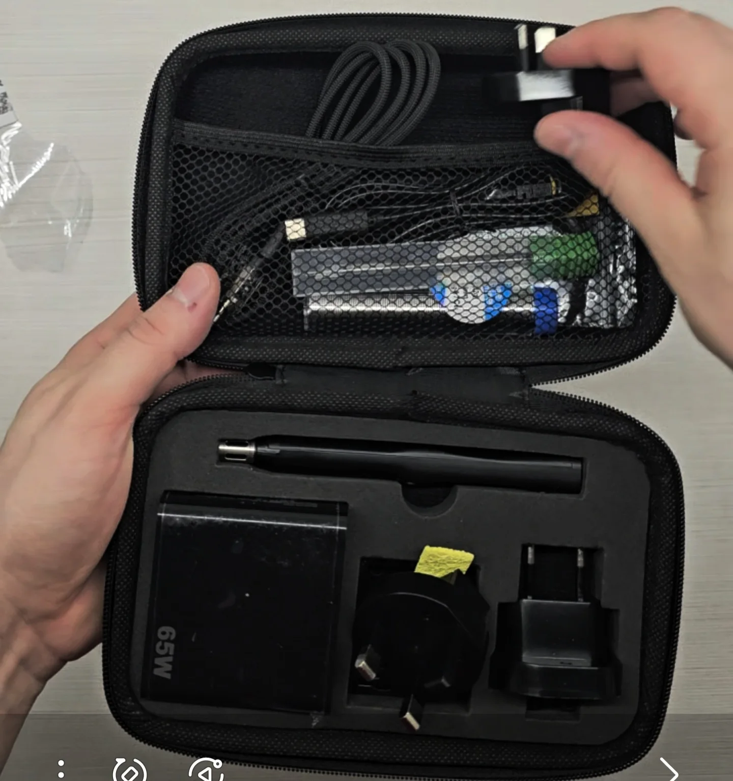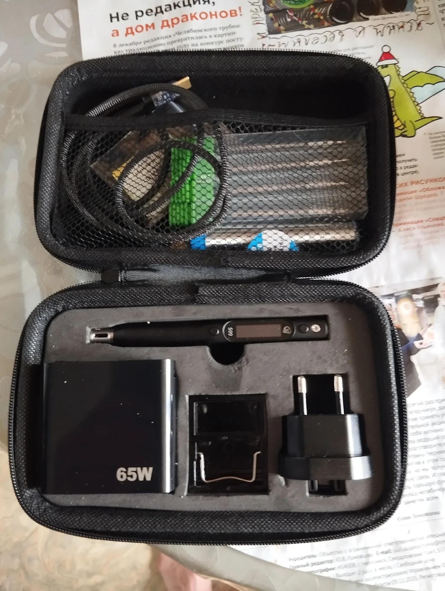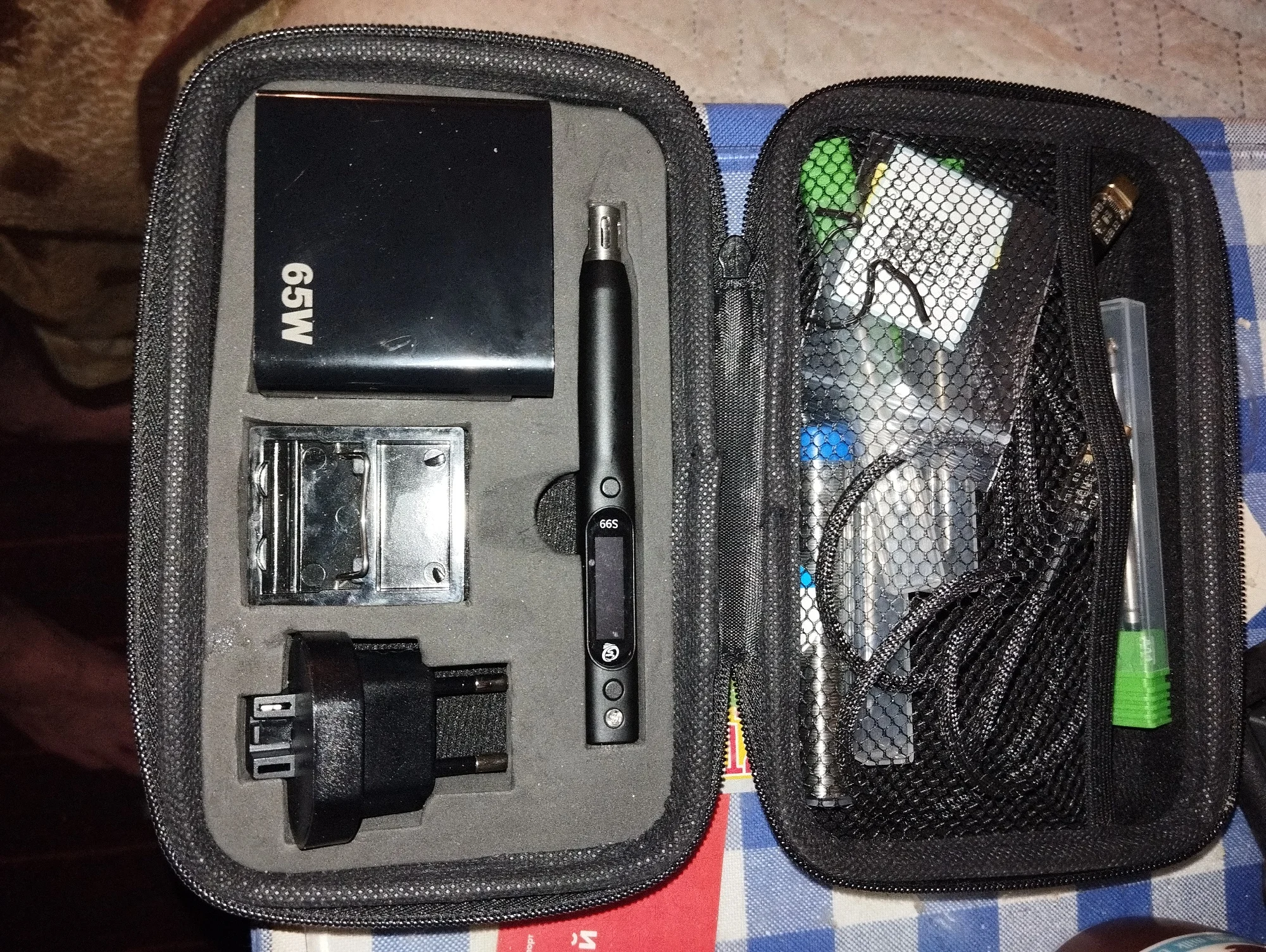 Пришёл гораздо быстрее указанного срока. Брал самый дорогой набор с четырьмя жалами и блоком питания. Пришло всё, что должно было прийти. Проверил сразу же, как пришёл домой: меню интуитивно понятное, разобрался за 5 минут; греется до рабочей температуры менее, чем за 10 секунд; паяет хорошо, хотя, я пока не занимаюсь электроникой и проверял на миллиметровых медных жилах (они оказались под рукой, сам паяльник покупал для работы, паять проводку в авто), полагаю, с тем, для чего он предназначен (электроника) справится без проблем. В комплекте не было флюса, поэтому первые впечатления от пайки немного смутили. Припой из комплекта содержит флюс, так что кое-как получилось спаять 2 провода. В комплекте также есть 2 кабеля. Один usb type-c/usb type-c, второй — usb type-c/какой-то неизвестный мне двухконтактный разъём. Назначение второго кабеля для меня осталось загадкой (возможно, он для подключения к лабораторным блокам питания, но это просто моя догадка. Может, чуть позже загуглю его название, разберусь). Также положили 3 переходника. Приятно, но хотелось бы, чтобы ложемент под блок питания в кейсе был с учётом присоединённого переходника, чтобы не нужно было каждый раз его подключать и отключать до и после работы. В моём наборе это место под блок питания просто квадратной формы и блок питания туда не влазит, если к нему присоединён переходник для включения в сеть. Сам блок питания неплох, но не внушает доверия, так как искрит при включении в сеть. В дорогих и качественных блоках питания такой особенности нет. Провод type-c/type-c довольно твёрдый, так что стаскивает паяльник с подставки, которая идёт в комплекте, приходится искать для него нужное положение. Сам паяльник довольно хорош. Собран, вроде, неплохо, никаких люфтов, скрипов, щелей или чего-то подобного нет. Правда, материал корпуса не очень приятен тактильно. Ощущение какого-то дешёвого пластика (возможно, выбор этот материала обусловлен термостойкостью, но хотелось бы, конечно, что-то поприятнее. Может, попробую докупить на него что-то вроде чехла из силикона или другого подобного, более приятного материала). Форма корпуса хорошая, эргономичная. Держать приятно, хотя для моей руки он немного мал, что, кстати, тоже меня удивило, так как думал, что он будет крупнее. На самом деле он размером с обычную шариковую авторучку, что немного ломает мозг, так как в нём может быть до 150 ватт. К слову, про его мощность. Все комплектные жала (в моём случае 4шт) имеют сопротивление 5,5 ом, что даёт ему мощность в 75 ватт. Стандартный блок питания из комплекта имеет мощность в 65 ватт. Для получения заявленных 150 ватт нужно докупать соответствующий блок питания и/или повербанк и жала с сопротивлением в 2,5 ома. В комплекте этого нет, на странице официального магазина я этого не нашёл (возможно, плохо искал). В принципе не совсем понимаю, как искать жала с нужным мне сопротивлением, так как почти нигде на страницах товара не указано сопротивление жала. К слову, в инструкции написано, что рекомендуется использовать только блок питания и жала компании sequre. Хотелось бы в таком случае иметь возможность купить продукцию, которая способна обеспечить заявленные характеристики. Хороший блок питания на 150+ ватт будет стоит больше, чем весь набор, который мне приехал (я заплатил примерно 80$). Повербанк, который будет способен обеспечить минимум 120 в