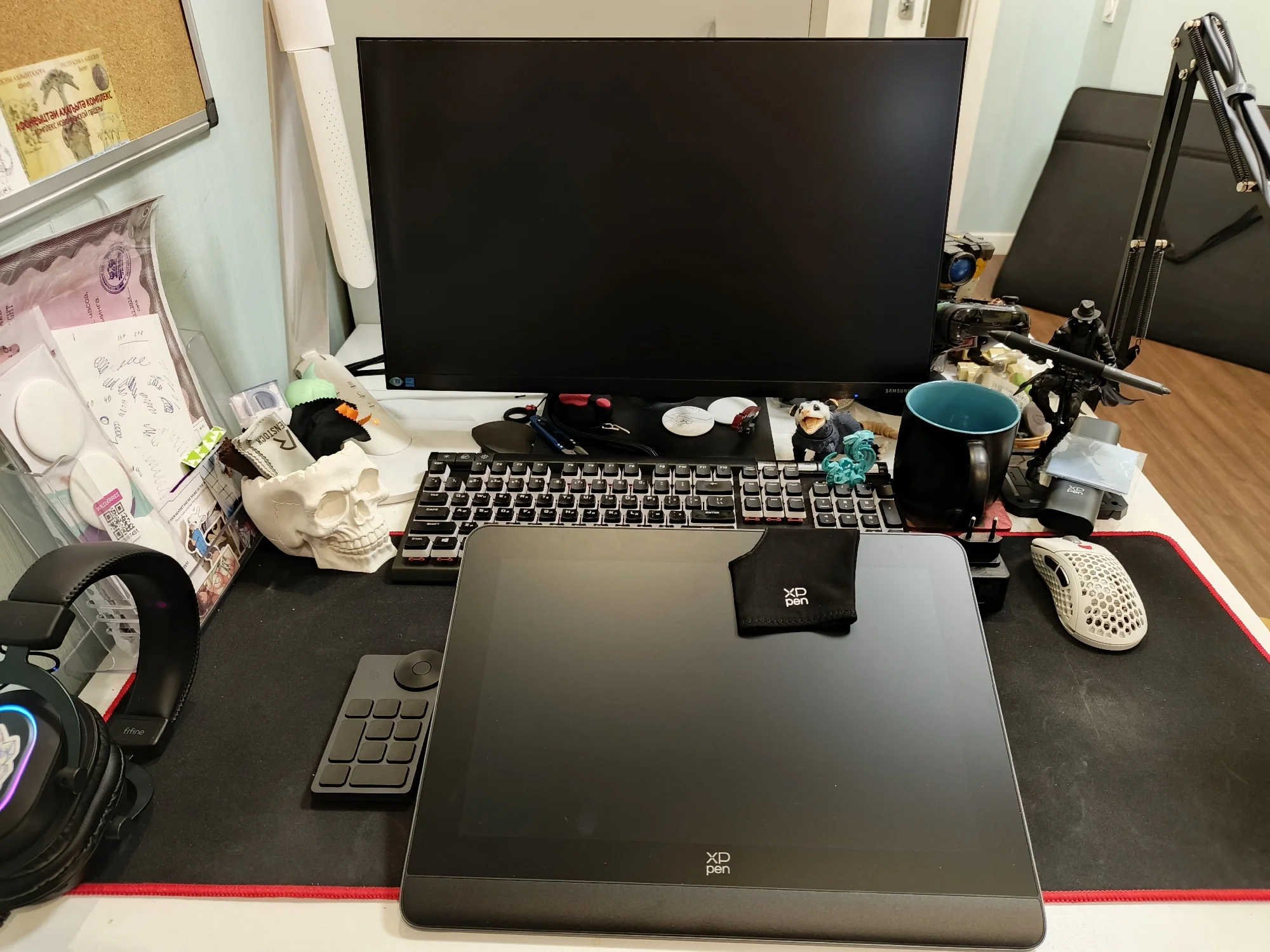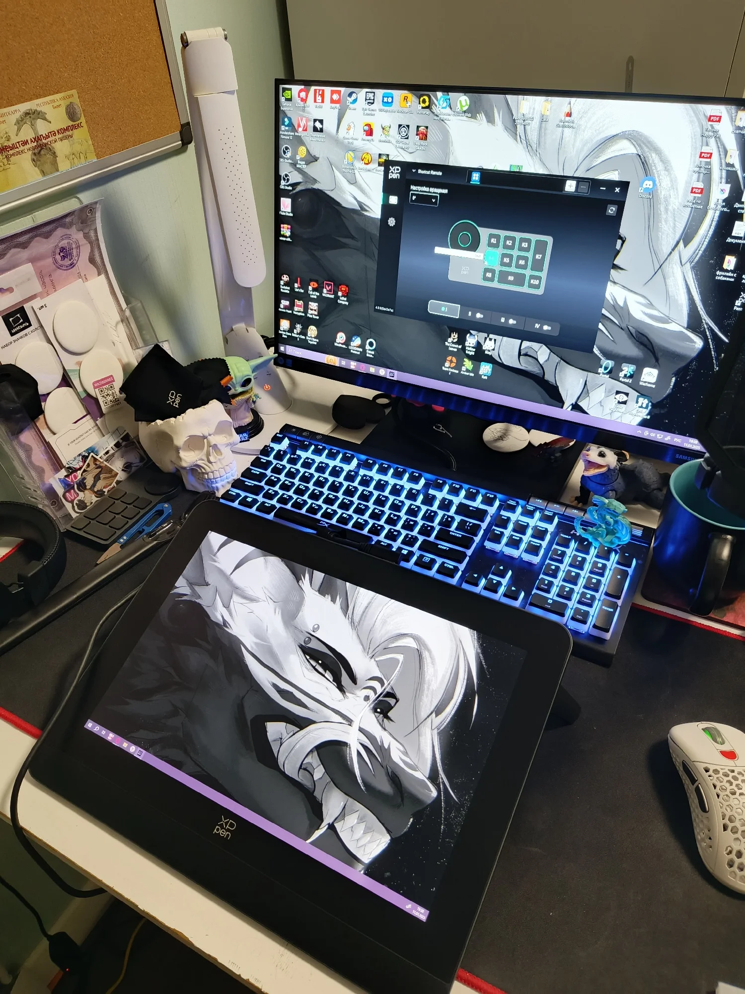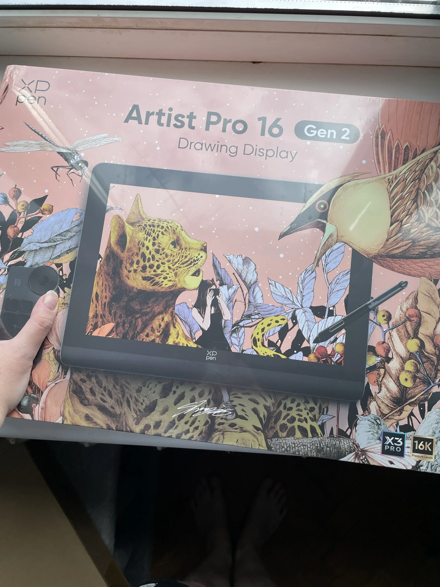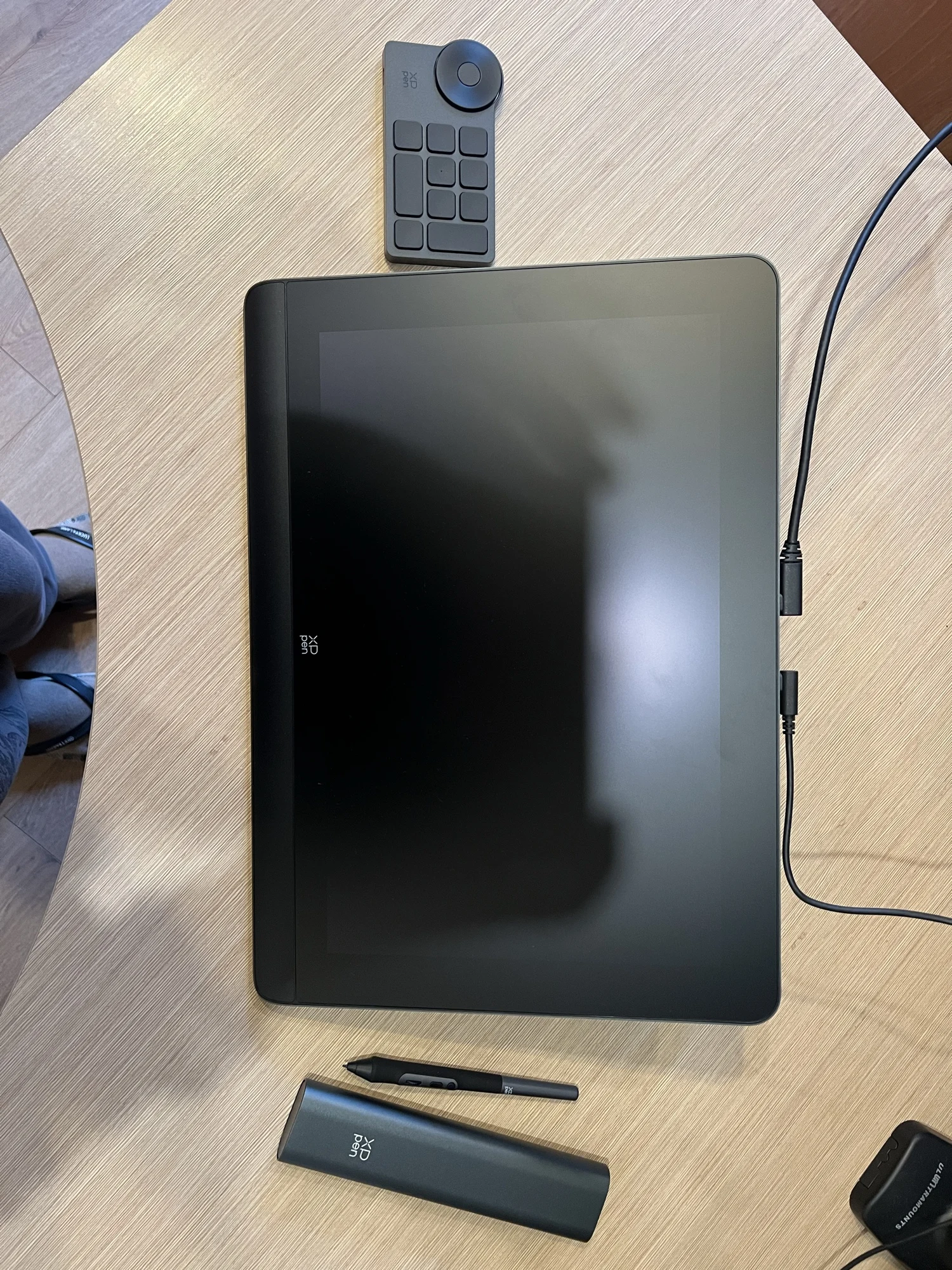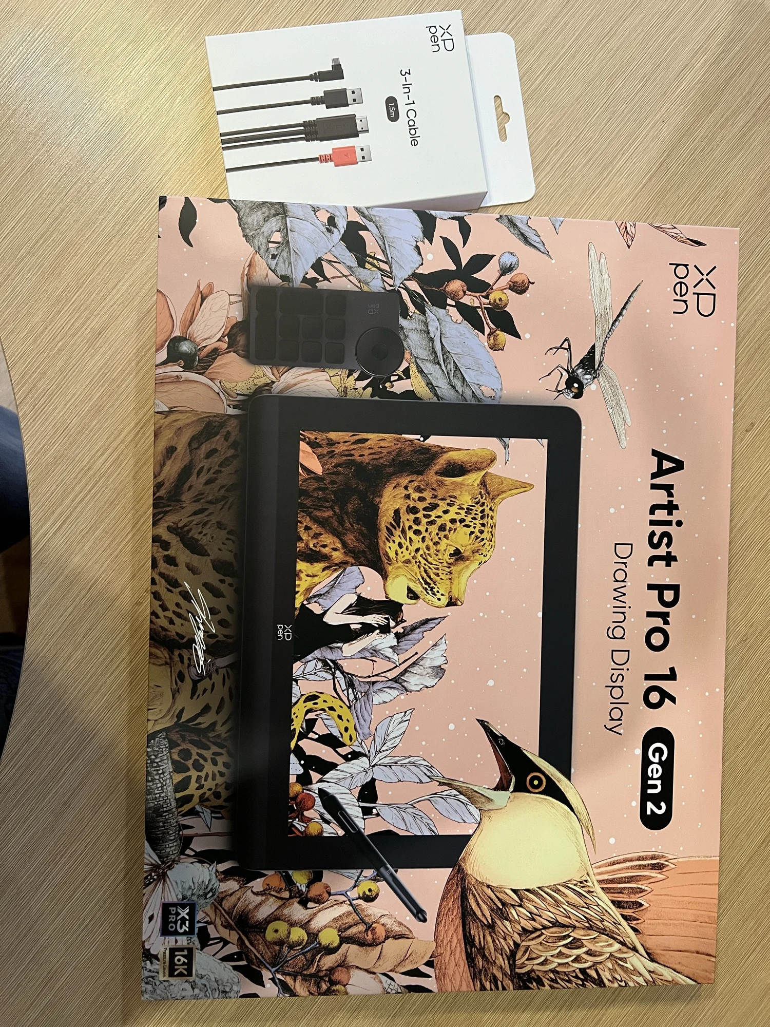 1. Быстрая доставка. До меня дошло за 3 дня. Смутило то, что привезли в ПВЗ Ламоды, а не в постамат Цайняо, который находился этажом выше и откуда я обычно забираю заказы 2. Комплектация. Очень всё хорошо и аккуратно упаковано, предусмотрены различные насадки для розеток разных стран, много аксессуаров, различные кабели и т. д. 3. Новая форма кабелей и разъёмов. Например, теперь не получится вставить в красный разъём под ЮСБ для зарядки провод не той стороной. В принципе в руках ощущается куда дороже и надёжнее, чем раньше 4. Сам девайс. В руках прям хорошо. Это надо чувствовать самостоятельно. Эдакое ощущение новой техники. Легче, чем 15.6 Про. Смущают небольшие чёрные полосы сверху и снизу изображения на экране, может, потом найду, как поправить. Экран просто кайф. Касаться стилусом его одно удовольствие. Калибровка прошла как будто лучше, чем на прошлом планшете, меньше ощущение параллакса. Настроить было довольно просто. Разъёмы для кабелей достаточно удобно расположены. Для справки: Type-C to Type-C подключается к левому порту, если поставить планшет лицевой стороной к себе горизонтально, 3-в-1 - к правому. В инструкции этот момент не слишком нагляден. Немного ломает мозг отсутствие кнопок по бокам, но это дело привычки. Планшет греется в процессе работы, к этому надо привыкнуть, но мне норм. Ножки-подставка - просто бесполезно 5. Факт наличия беспроводного клавиатора (так его назову). Он мне пока не слишком удобен, но его можно подключать по блютузу, так что хотя бы ЮСБ не отнимает. Настраивается достаточно гибко, но хотелось бы больше возможностей. Например, чтобы можно было кнопкой не отменять действие, а возвращаться назад или переходить вперёд (по страницам в браузере, в проводнике и так далее), вызывать проводник или ещё что-то. И по факту там не 10 действий, а 40 - всего можно создать 4 набора и переключаться между ними в драйверах планшета. Я уже придумываю, как этим пользоваться вне рисования 6. Стилус достаточно приятный. У меня определённо были проблемы с настройкой чувствительности к давлению, но, вроде, получилось довести её до ума. Не могу сказать, что чувствую разницу между 8k и 16k уровнями нажатия, но просто рисовать им комфортно. Набор наконечников в комплекте тоже порадовал, надо будет опробовать и фетровые 7. Код устройства позволил даже получить бесплатную программу для рисования на сайте производителя (что смешно, планшет, заказанный с официального Алика, такого добра мне не позволил) Ощущения прекрасные. Столь долго ожидаемое (с момента выхода) устройство пока только радует. После некоторого периода привыкания и притирания наверняка станет верным помощником. Если хочется попробовать себя в рисовании и бюджет не слишком ограничен, то советую рассматривать и этот вариант к покупке. Весьма солидное устройство с кучей плюсов, достойными техническими характеристиками и приятными моментами первого знакомства во время распаковки и настройки