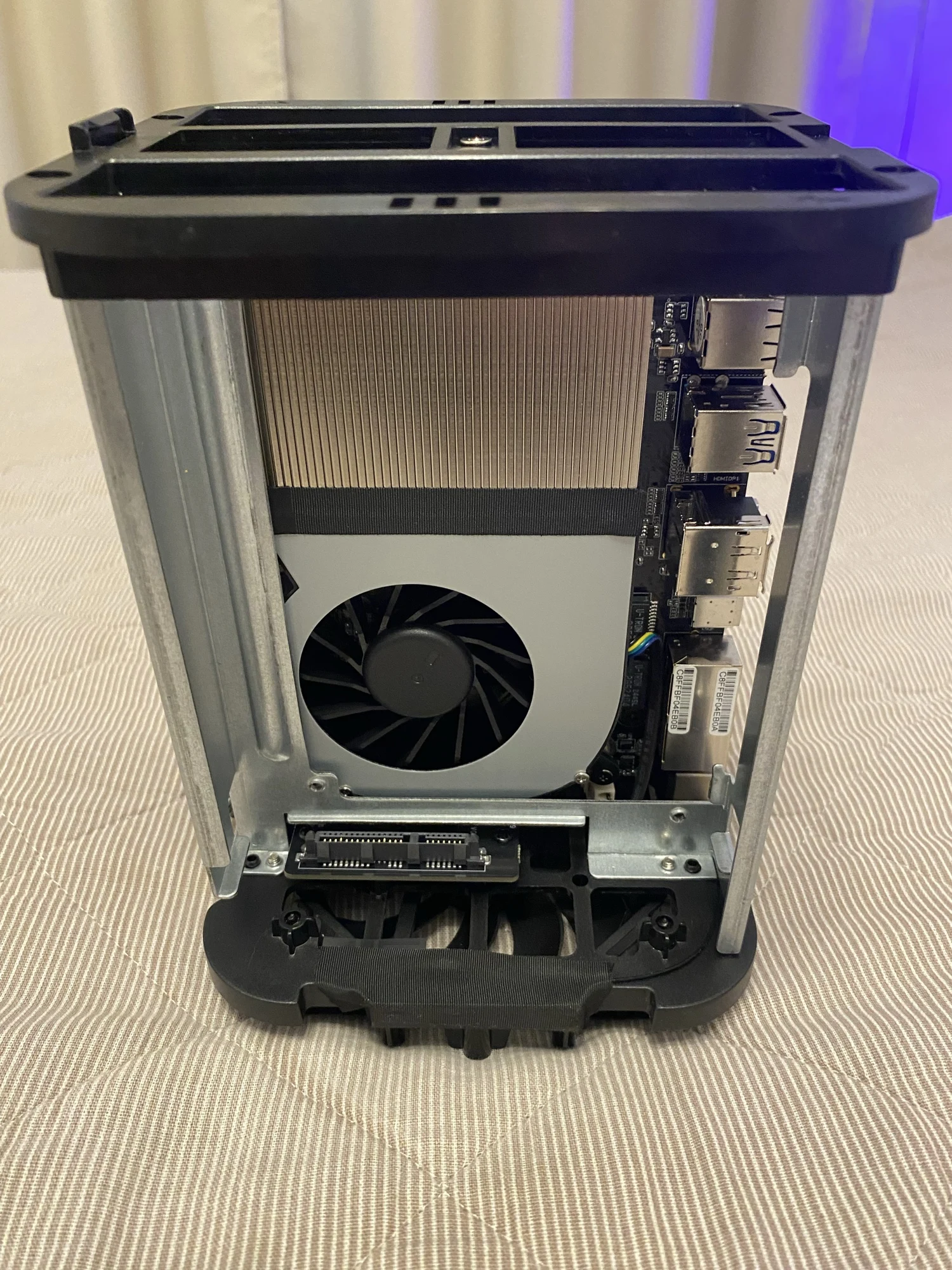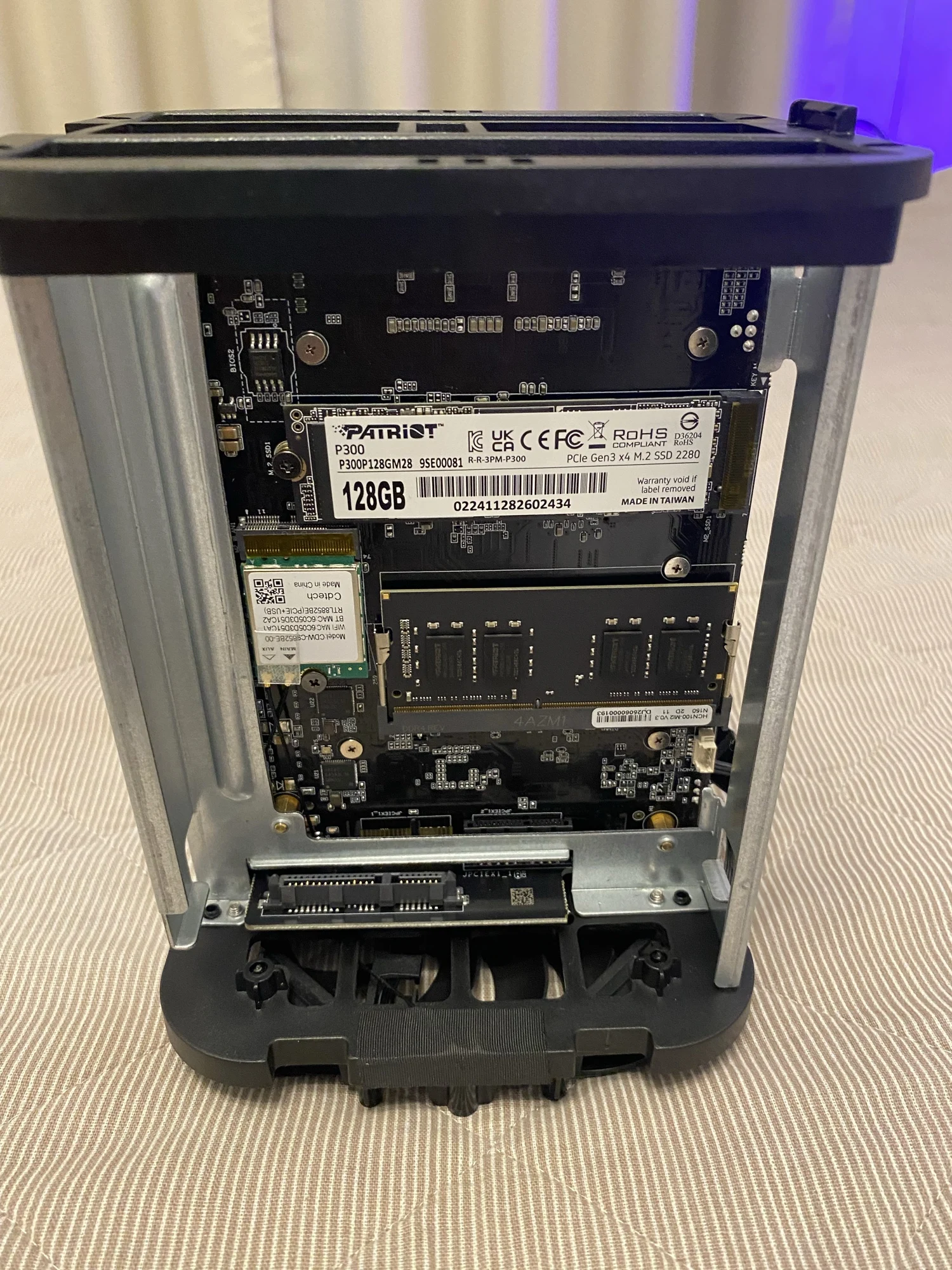 Доставка задержалась на две недели после указанного срока и изменился способ доставки - курьер сдэк в их пвз вместо постомата цинао, благо у меня рядом, но продовец успокоил и поддерживал, был отзывчивым. Всё пришло в исключительной сохранности, большая коробка со слоями вспененного материала. Качественная сборка и пластик нормальный, добротный тяжелый блок питания с евровилкой сразу. Подключил память (советуют одноранговую) на 8 гигов и нвме на 128 для ультрабюджетного наса. Сразу же заменил кулер на id cooling, как советовали многие. При включении был приятный и неприятный сюрприз. Приятный, мне пришел N150 проц, а неприяный, что переключении вкладок потух биос в первые 10 секунд и перестал в него загружаться. Я вытащил батарейку, подождал, включил, но ничего не изменилось - вентиляторы крутятся, а в биос не заходит. Пробывал по очереди вытаскивать память и накопитель, но без результатов. Хотел было открывать спор уже, но подумал, что можно бы clear cmos сделать и тогда уж обращаться. Там есть перемычка рядом с батарейкой. Воистину это помогло. Оставляю это тем, кто может столкнуться с подобной ситуацией. Установил openmediavault, воткнул два новых диска по 2 тб на 5400 оборотов, поставил doker compose, file manager, qbittorent, emby server, airsonic расшарил папку для фоток, всё работает безупречно. Потрясающее устройство, может работать как компьютер общего назначения, если кто захочет. Температура хардов 31-35 градусов, использование памяти от 800 до 1200 мегабайт, проц от 3,3 до 35%, один раз было 95 когда качал, передавал файлы и сканировал медиатеку, но никаких намеков на падения производительности. Брал на распродаже, получилось около 15к.Mark M. 19 апреля 2025